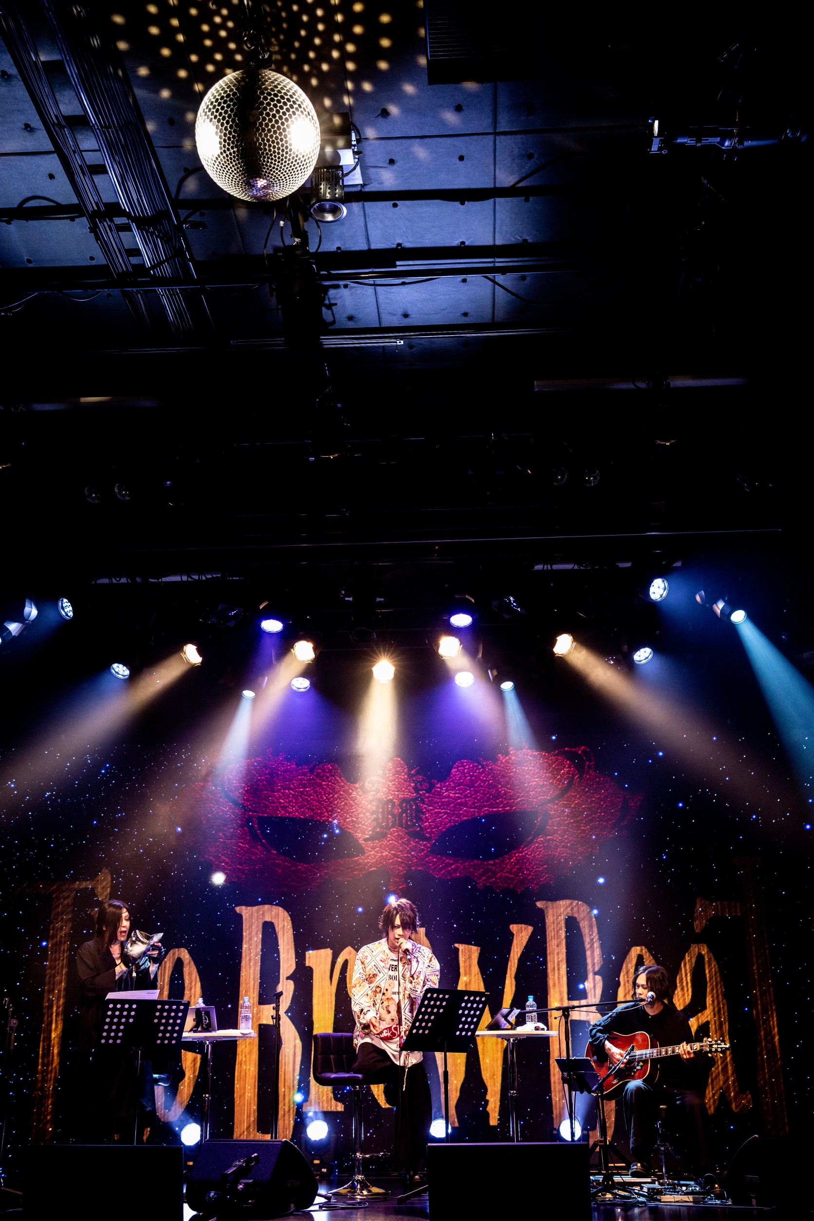 ライブでは、その「灯篭流し」を演奏。音源では最後のサビ歌でRyujiの声をクロスするように重ねて歌っているところを、RyujiとHAKUEIの掛け合いで再現。とても胸に染み渡る歌声と演奏だ。それまで座りながら歌っていたRyujiが立ち上がり、愛しい人に逢いたいという胸の内から込み上げる切々とした想いを願いに変え、しっとりと歌っていく。その歌声が、鳴風の哀切なギターの旋律に乗り、さらに心を痛く掻きむしる。壊れそうな感情のままに歌いあげる声が、気持ちを縛りつけた。終盤では、熱唱するRyujiの背景で、HAKUEIが優しく想いを寄り添えるように歌唱。2人の歌声が交錯していく様も、胸を激しく揺さぶった。