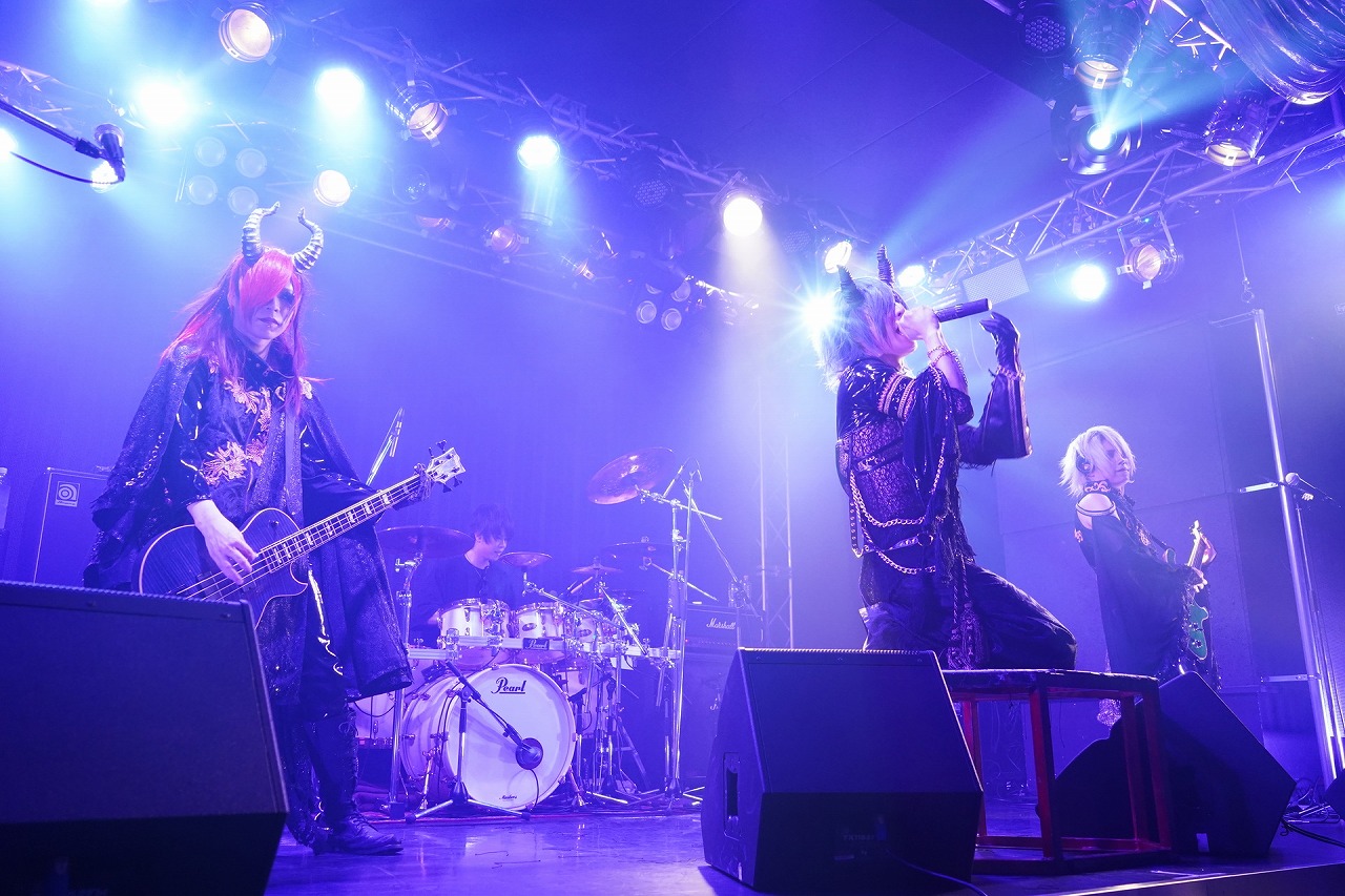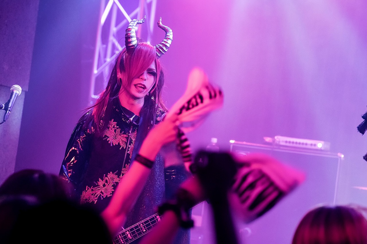 サイレンの音が鳴り響く場内。メンバーらが舞台の上へ横一列に並び、「逆罪行進曲」に合わせ思いきり頭を振りながら歌い演奏。その様に触発され、フロアにも同じ光景が広がる。アスカの絶叫や、Natsuと翔磨の攻めた演奏をエナジーに変えながら、フロア中で大勢の人たちが飛び跳ね、頭を振り乱していった。