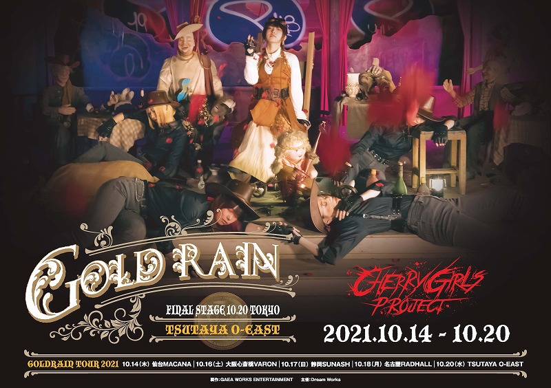 CHERRY GIRLS PROJECTが、10月に仙台・大阪・静岡・名古屋・東京を舞台に行なう初の全国ワンマンツアー「GOLDRAIN TOUR2021」。同ツアーの特徴が、昨今多い、週末に移動し、何週間や何ヶ月もかけて行なう全国ツアーではなく、一週間の中へ間髪入れずにライブを詰め込み、短期間の中で進化成長してゆく姿を見せつけようという姿勢。それこそが、本来のライブツアーとして有るべき姿。ロックな魂でライブを届けるCHERRY GIRLS PROJECTらしい攻め方だ。