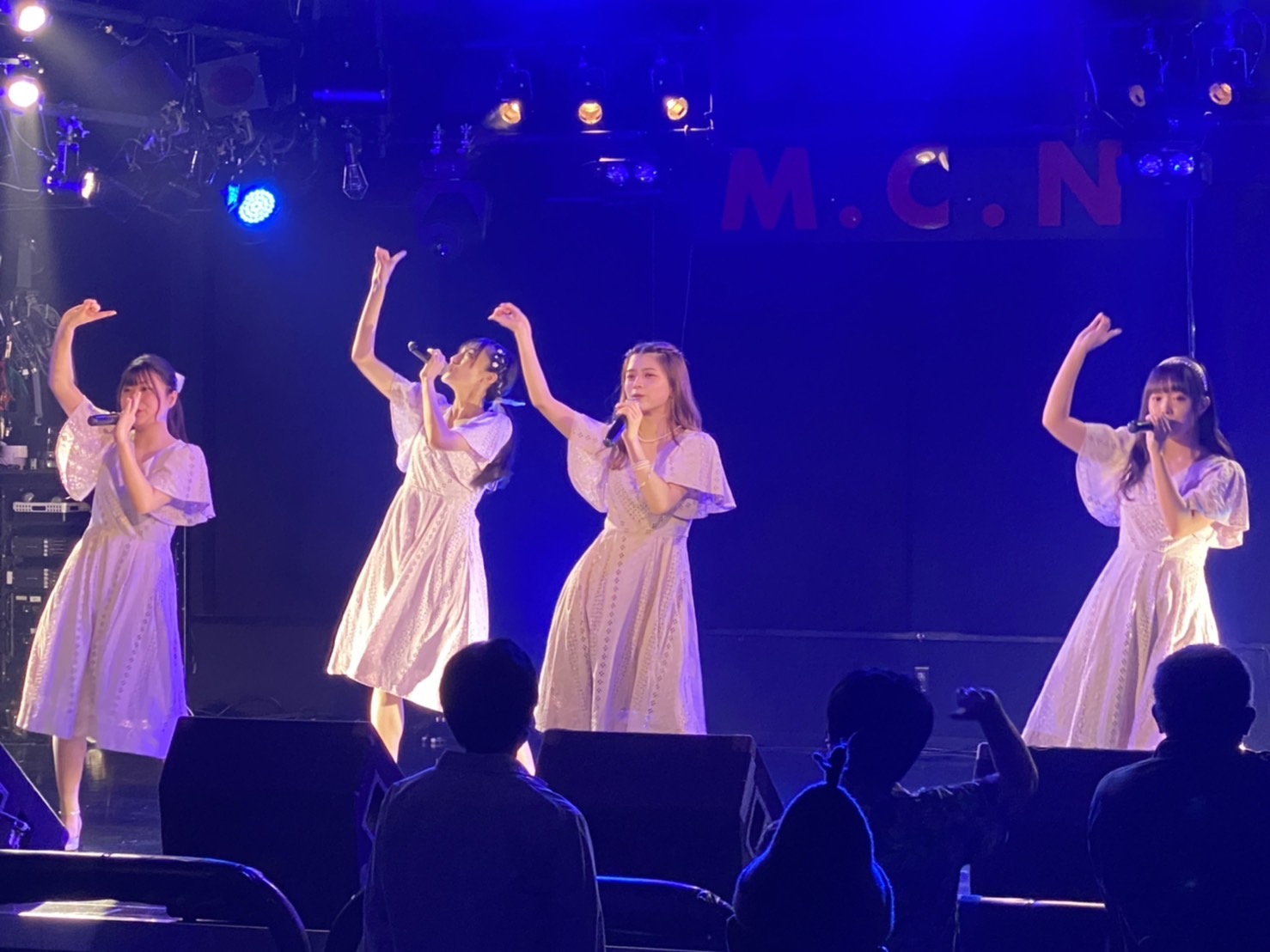最初に舞台に立ったのがDorothy Little Happy。この日は4人編成でのライブになったが、彼女たちの清楚で愛らしい姿はけっして見劣りすることはない。「ストーリー」のイントロに乗せ舞台へ姿を現したとたん、地下にあるこの空間へ爽やかな夏風が吹いてきた。季節はもう秋の気配が漂い始めている。でも、Dorothy Little Happyが舞台の上で軽やかにステップを踏みながら歌いだしたとたん、心地好く胸を揺さぶる爽快な歌の夏風が全身を吹き抜けていった。一人一人の歌が声の絵筆となり、観ている人たちの心の中へ青春という爽やかな景色を描き出す。