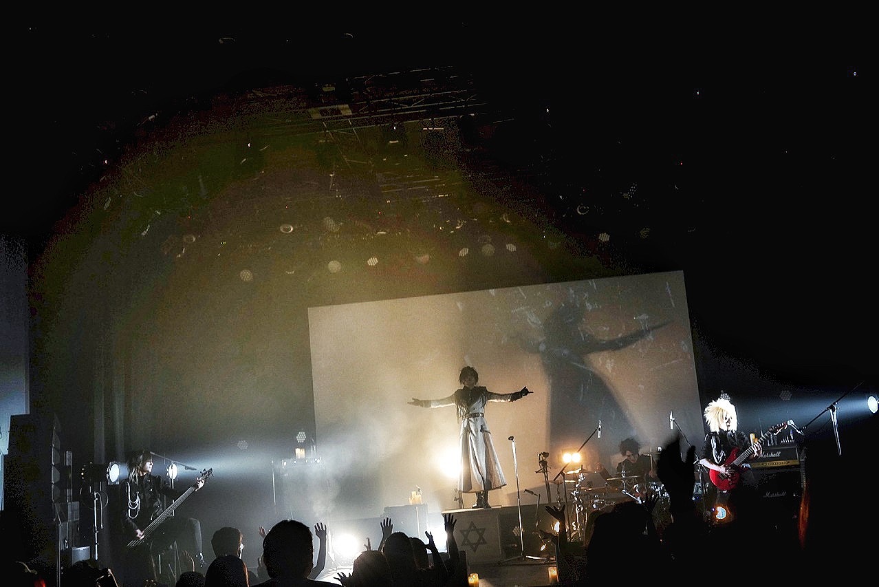 「わたしにかかる運命の糸を紡いでください」。Davidは厳かな演奏に乗せ、ミッドメロウでダーク/ヘヴィな「Moira」を歌いだす。スタンドに据えたマイクを両手できつく握り閉め、SUIは「もがけば もがく程に 運命の糸は乱れ絡み 心を 離さない」と、嘆く心を捧げるように歌っていた。彼の想いへ寄り添うように響く演奏が、さらに胸を痛く切なく掻きむしる。床にひざまずき祈るように歌うSUI。もがけばもがくほど運命の糸は複雑に絡み合う。SUIは、その絡み合う糸を解くよう身悶えながら歌っていた。その姿は苦しむ使徒のようにさえ見えていた。終盤、絶叫し続けるSUIの姿は、「逃れられぬ 私の業」を嘆くようだった。