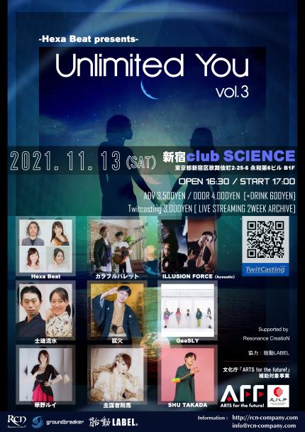 2021年11月13日 に東京・新宿club SCIENCEにて開催される、Hexa Beat主催による音楽&パフォーマー系イベント「Unlimited You vol.3」の最終出演者となる第三弾が発表された。