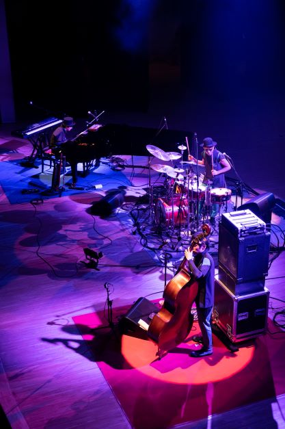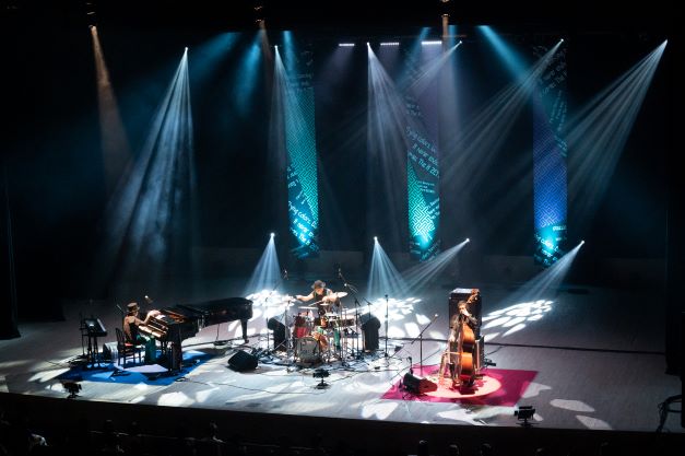 開演前、ピアノ・ドラム・ベースが定位置に置かれ、それぞれが真上からのスポットライトに照らされている。観客がそれらを興味深そうに近くから眺めたり、写真に撮ったりと思い思いの過ごし方をしていると定刻通りに開演のブザーが鳴った。