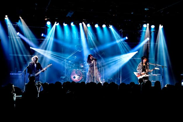 深海の底に緩やかに、そしてズブズブと沈めていくかのような、そんなサウンドスケープでオーディエンスを異次元に導いたところで、「恵比寿行くぞー!」とHAKUEIが叫ぶと、空気は一転、千聖のバースデーを会場中で祝福するかのごとく、威勢のいいロック曲「NEW FUTURE」をぶっ放す。そしてO-JIROのフィルと千聖のフィードバックを合図に、間髪入れず「幻想カタルシス」へ。タッピングやアーミングを交えた往年のギターヒーローを彷彿とさせる千聖のギタープレイがこの日も冴え渡るが、そんな中にも昭和歌謡的な情緒やダークさを漂わせているのがPENICILLINスタイルだ。