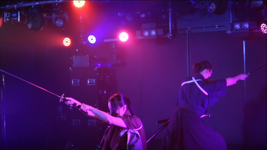 最初は佐藤友春が一人で殺陣を披露していたが、途中より女流剣士の遥も登場。厳かな和の音色に乗せ、それぞれが。その後は、互いに刀を交える形で、剣舞を披露していた。2 人
