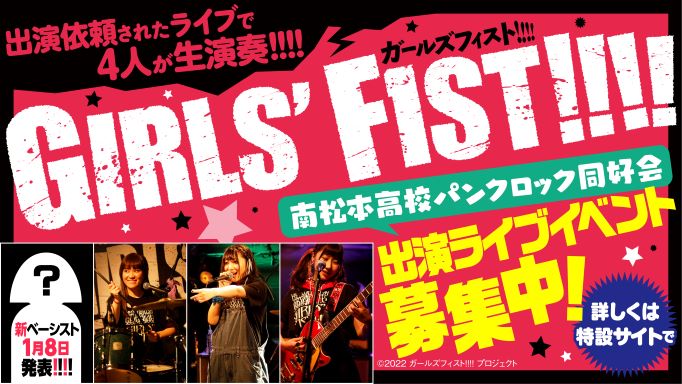 なお、“南松本高校パンクロック同好会”は今回の活動再開を機に、新年以降に開催されるライブイベント等への出演依頼も再び受けつけていく。ロックバンドとしての彼女たち4人が、依頼を受けたライブやイベントのステージで生演奏をすることになる。出演依頼の方法等について詳しくは、『ガールズフィスト!!!!』特設サイト(リンク:https://www.teichiku.co.jp/artist/girls-f1st/)を参照のこと。