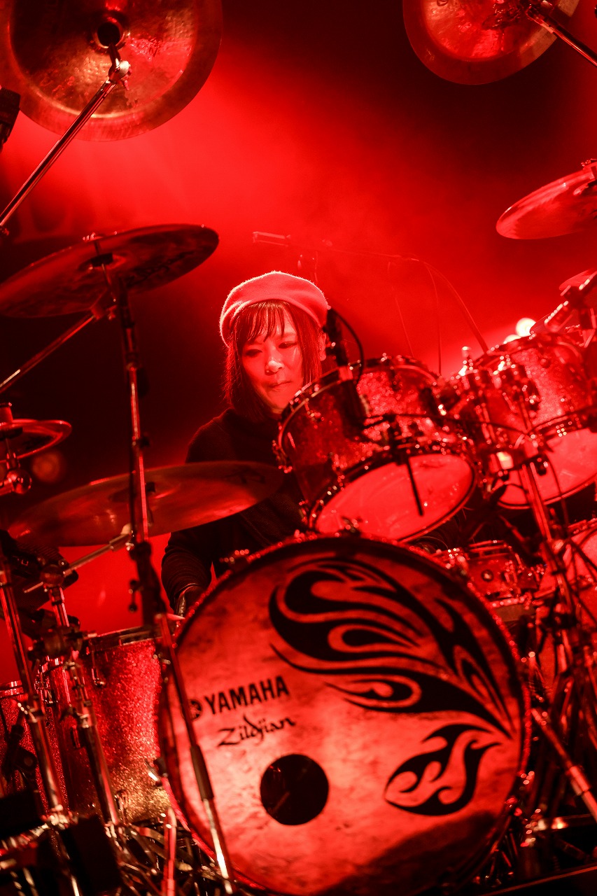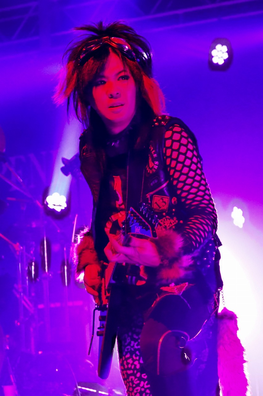 途切れた音から、ヘヴィなバンドサウンドが流れ、ゆっくりと幕の開いたその先には、「Lucifer~光をもたらす者~」を演奏するメンバーの姿があった。華々しいメンバーと妖しさが混ざり合う不思議な気持ちへ導く楽曲だ。歌詞には、大切な人を失う狂おしいほどの悲しみが綴られている。切なさを背負いながらも、光を求めるような優しい声で歌うHAKUEI。だが、楽曲は裏腹にヘヴィさを増し、千聖のギターソロから演奏は激しさとスピードを増してゆく。祈りにも似たHAKUEIの歌声も、曲へ煽られるように抑揚していく。千聖、O-JIRO、サポートBASSのChiyuも、煽るような激しい演奏を描き足しながら、このカンバス(空間)へ、これから色濃く染めるに相応しい土台となる色を塗りだしていた。