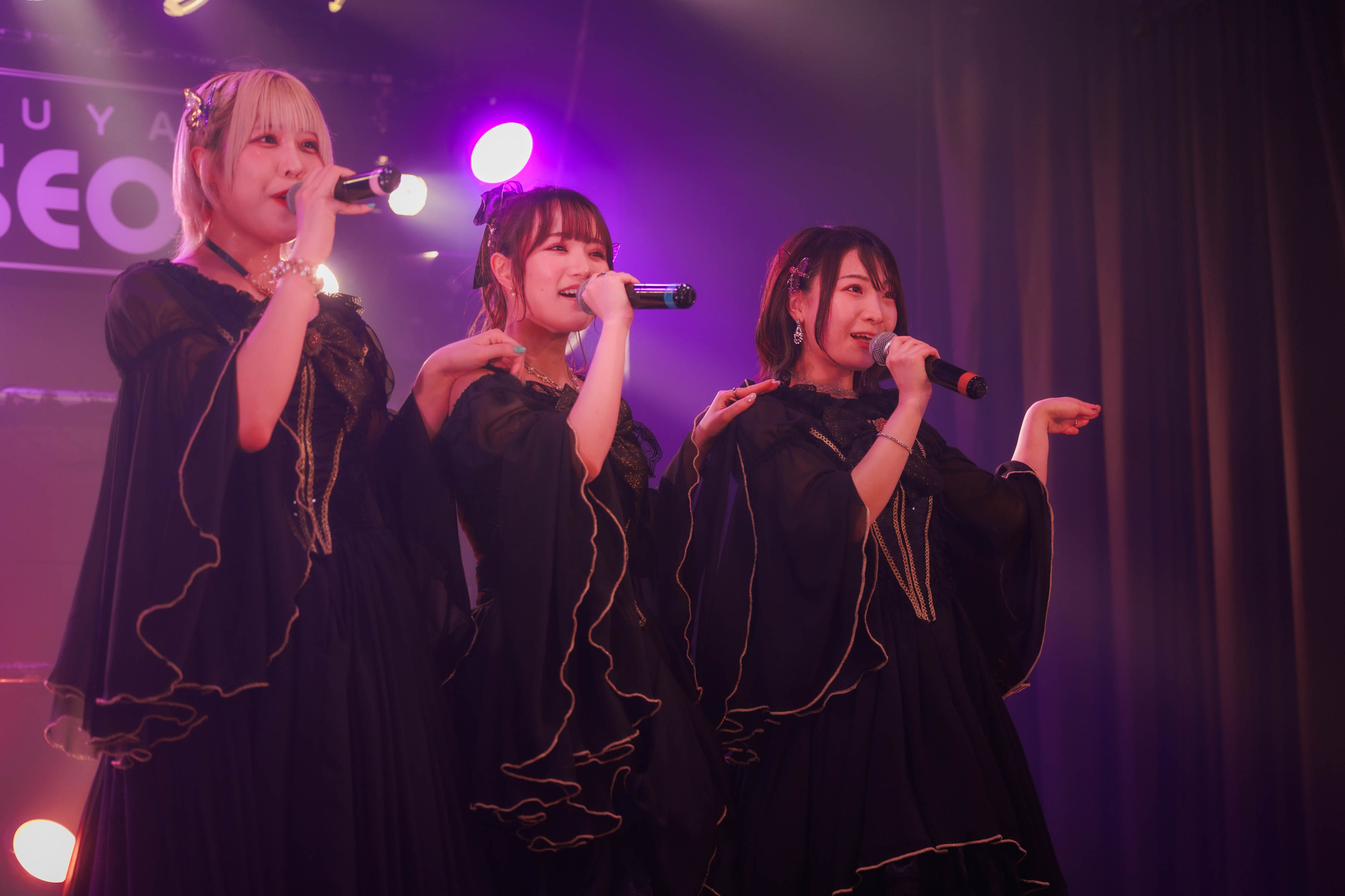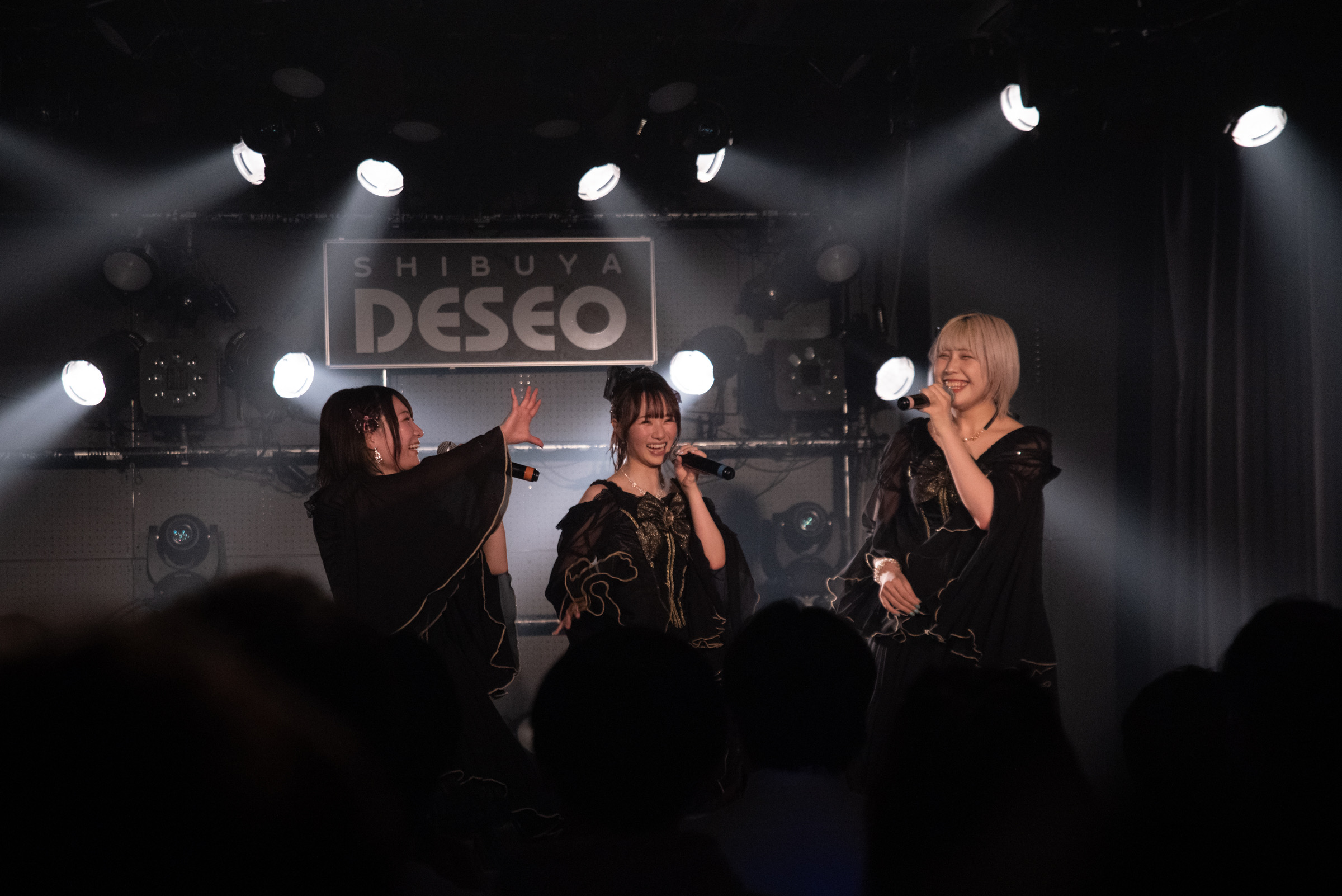 軽快に弾む開放的なポップチューン「シーサイドタイムマシン」は、セリフパートを組み込んだ楽曲。冒頭から、小熊りんと月嶋なるによる歌のかけあいが飛びだせば、そこへ黒川音が加わることで、サビでは美しいハーモニーを描きだす。この曲はセリフが多いこともあり、小熊りんと月嶋なるが巧みな言葉の掛け合いをみせてゆく。途中に組み込んだ小芝居のパートでは、役者経験のある小熊りんを中心に、そこへ月嶋なるが絡み、黒川音がしっかりオチを担当していた。