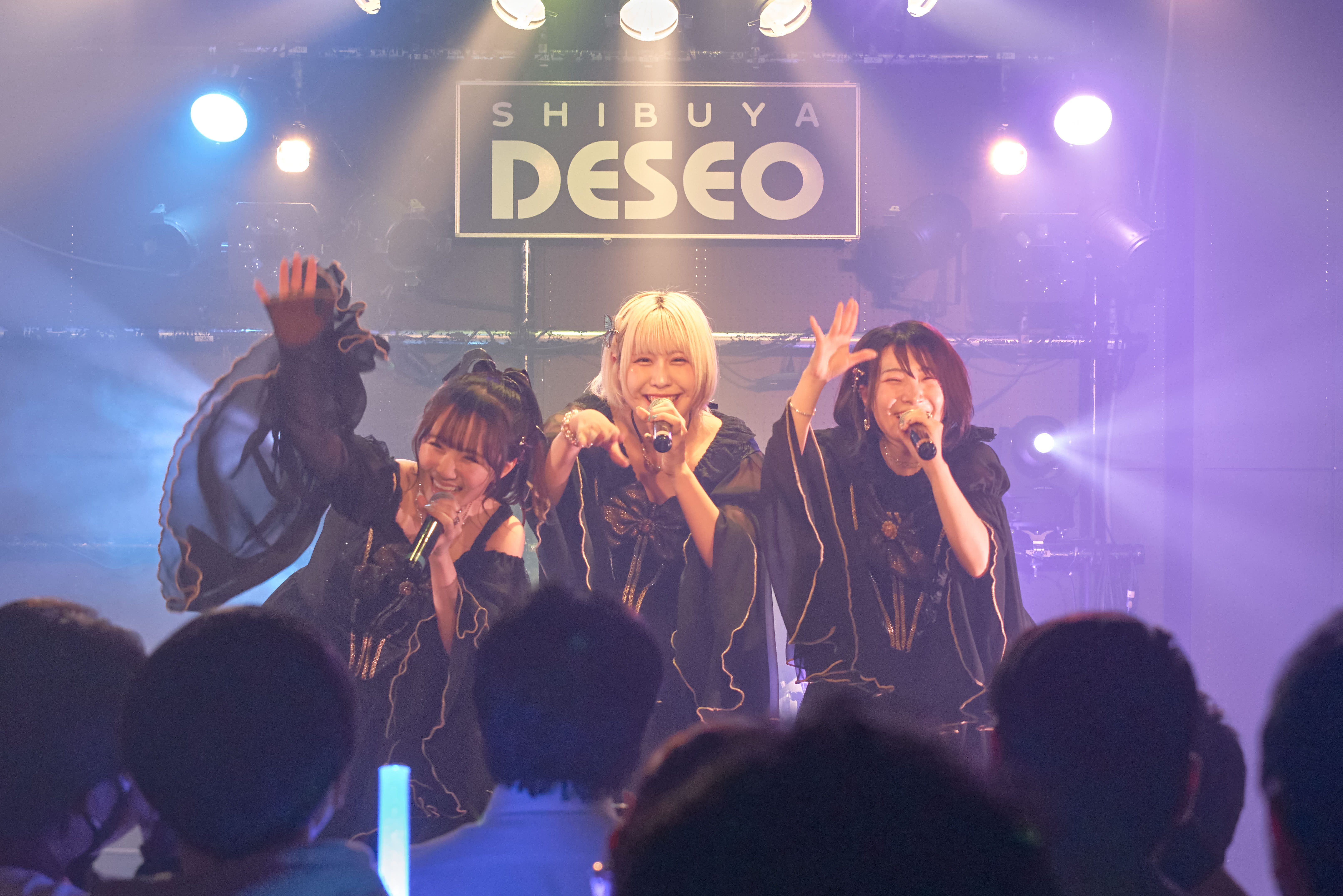 先の説明を示すように、満員の観客たちを前にした新生CUBΣLICのライブは、3人のチャーミングな魅力をキラキラ輝く音に乗せて届ける「微レ存ガール」からスタート。「君はどっちかな」と可愛い声で歌いだしたのが、黒川音。黒川音と小熊りんの“おとりん”コンビがチャーミングな声で歌を掛け合えば、月嶋なるが2人を巧みにサポート。絶妙なバランスを取った3人の歌の組み合わせも魅力だが、3人の息のあったダンスパフォーマンスも新生CUBΣLICの嬉しい見どころになっていた。ダンスを得意とする小熊りんを加えたことで、流れるような美しいコンビネーションプレイをいろいろ見せていたように、彼女たちの歌声に心惹かれながらも、視線はずっと3人の動きを追いかけていた。