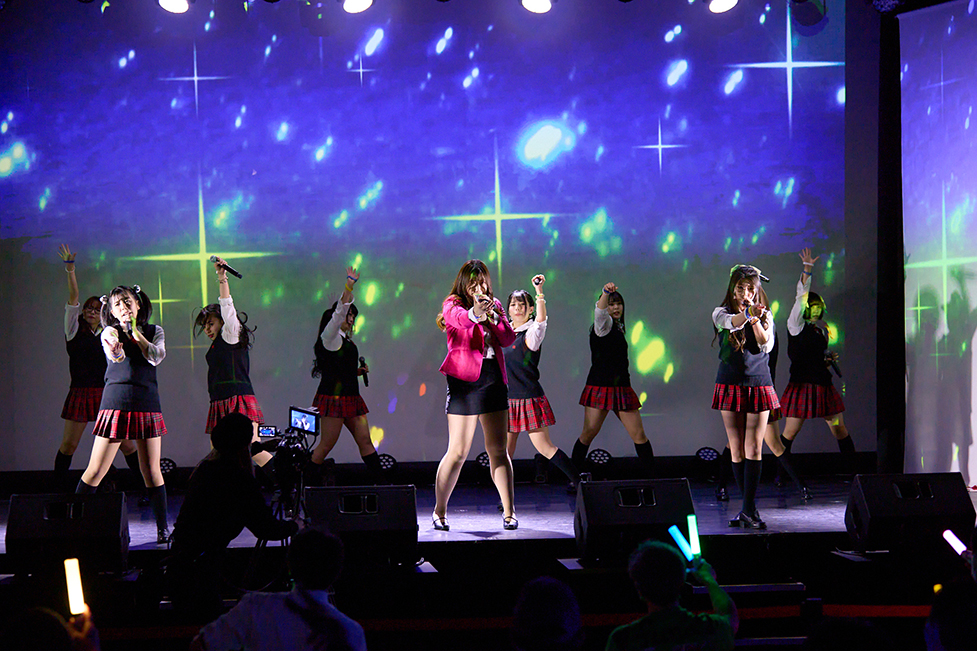 最後に歌ったのが、「ミラクる☆妄想がーる」。この曲に触れるたび、胸がキュンキュンときめきだす。お馴染み”そろそろMIX”のコーナーでは,佐々木千咲子が傘を用いて紙風船をくるくるまわせば、成田麻穂がランドセル姿で、當銘菜々は大きな鯛のマスクを付けて舞台に登場。最後に、みんなで「シェー」とポーズも決めていた。「ミラクる☆妄想がーる」では、いろんな遊び心を持ったパフォーマンスを彼女たちは見せてゆく。それを観るのも、毎回のライブの嬉しい楽しみだ。落ちサビでは、巨大な鯛のマスクを熊野はるがかぶって歌う場面も。その姿も、この曲の楽しさを倍増させるスパイスになっていた。