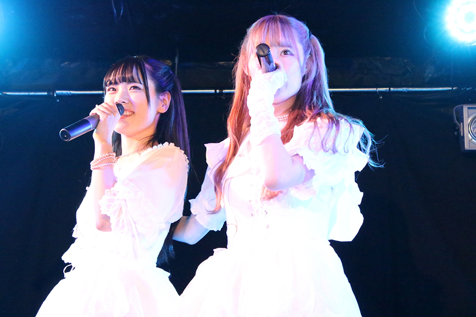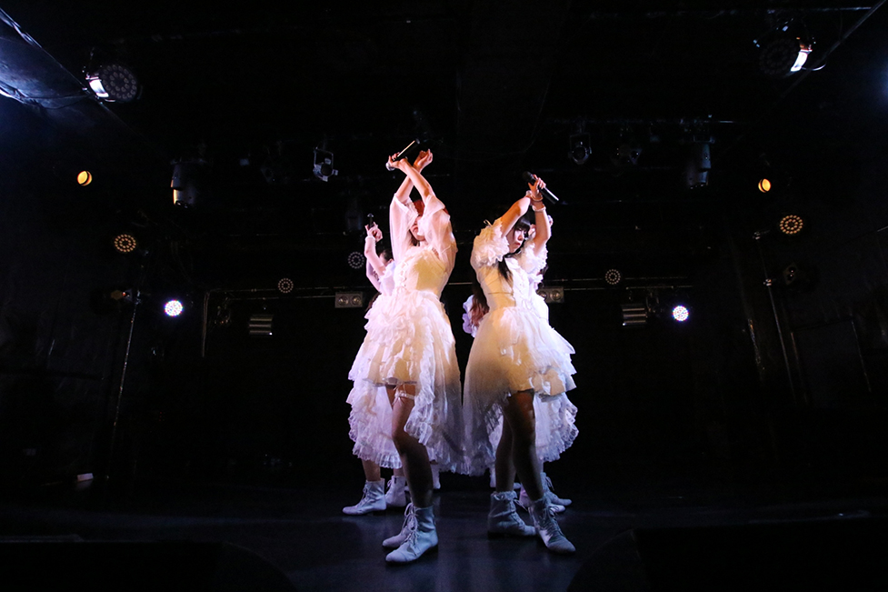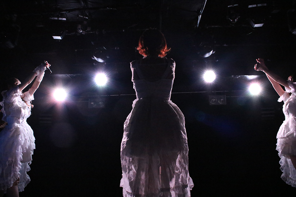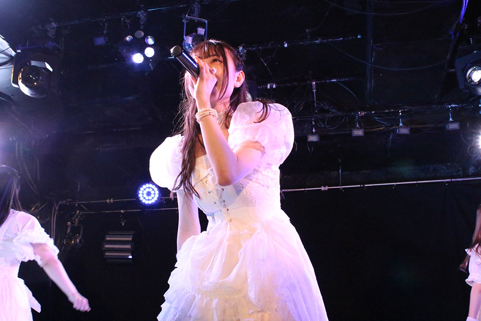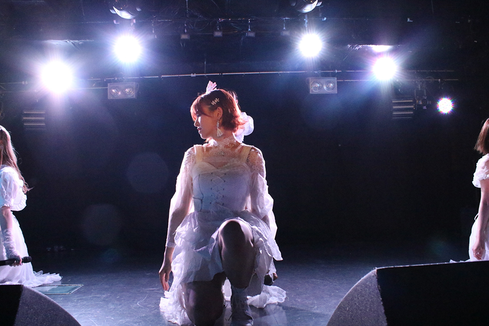 舞台上に姿を現した彼女たちは、真っ白いウェディングドレスをベースにした新衣装姿。モチーフになったのが、ウェディングをテーマにした最新曲の『Dear Darlin’』。Re:INCARNATIONといえばダークでロックな印象を強く与えてきたユニット。でも、現在の第二期メンバーになって以降は、メンバーたちの陽気な個性を反映するように、明るく開放的なロックナンバーも積極的に取り入れてきた。その最もたる進化を示したのが、この日のライブの冒頭を飾った『Dear Darlin’』になる。始まりの時点では、まだ新加入のメンバーを抜いた4人編成だ。でも、真っ白い衣装を身につけたメンバーたちの華やかな姿に、フロア中の人たちが早くも嬉しい驚きの反応を見せていた。晴れ渡る世界へと連れだす楽曲に乗せ、愛らしい歌声で想いを届けるメンバーたちの眩しい姿へ、会場中の人たちが熱い視線を向けていた。