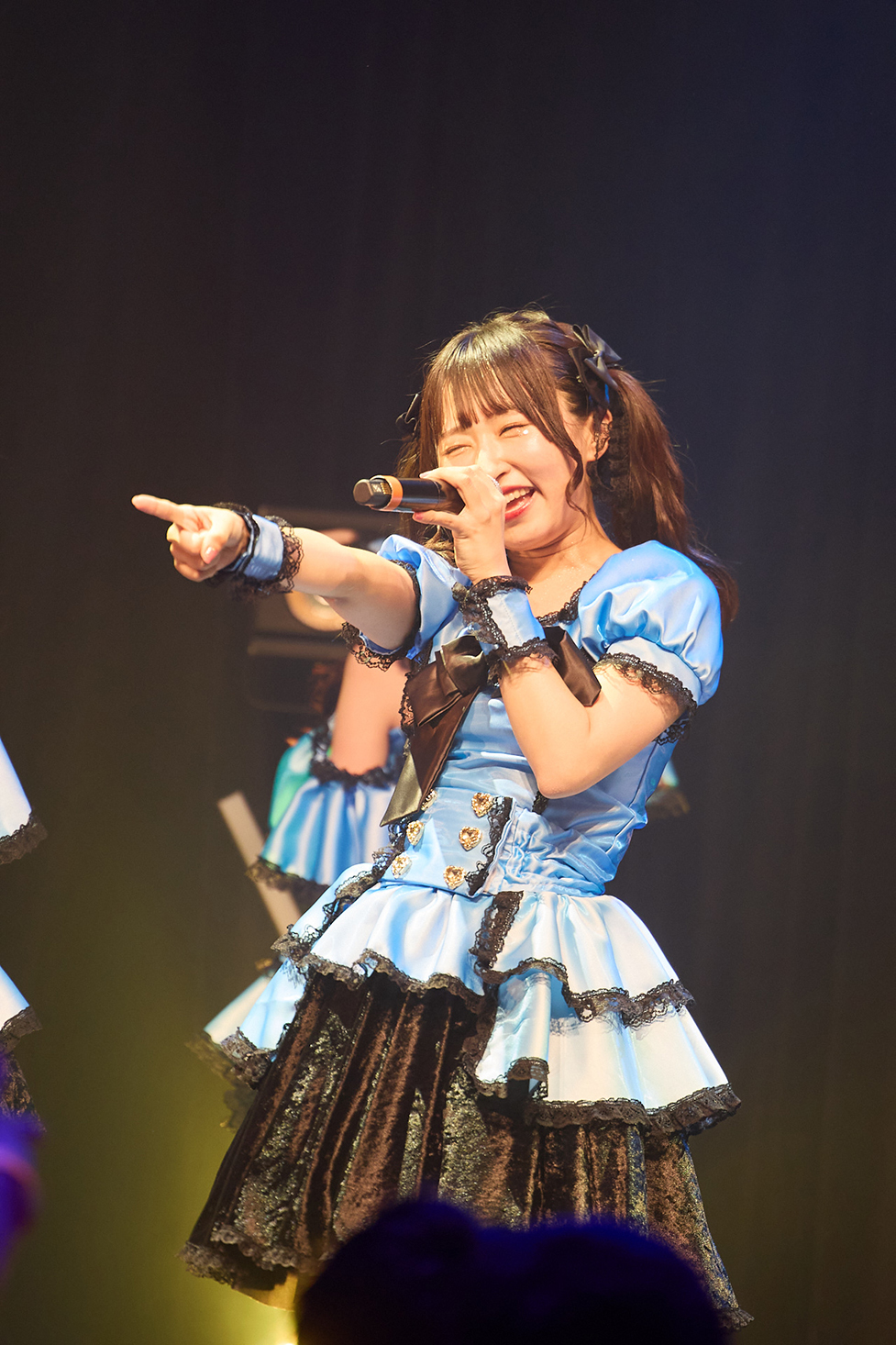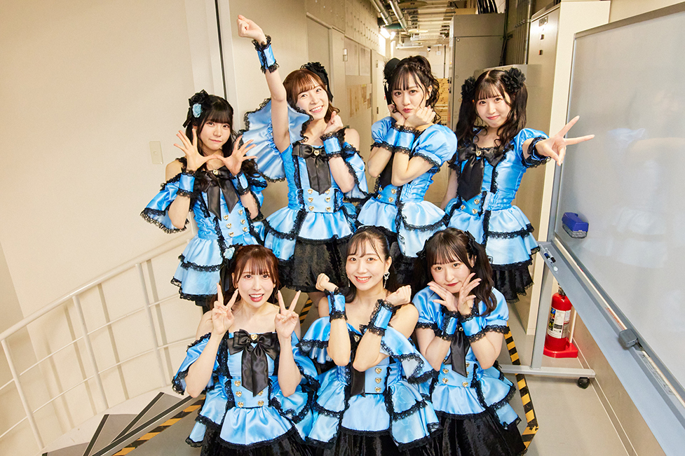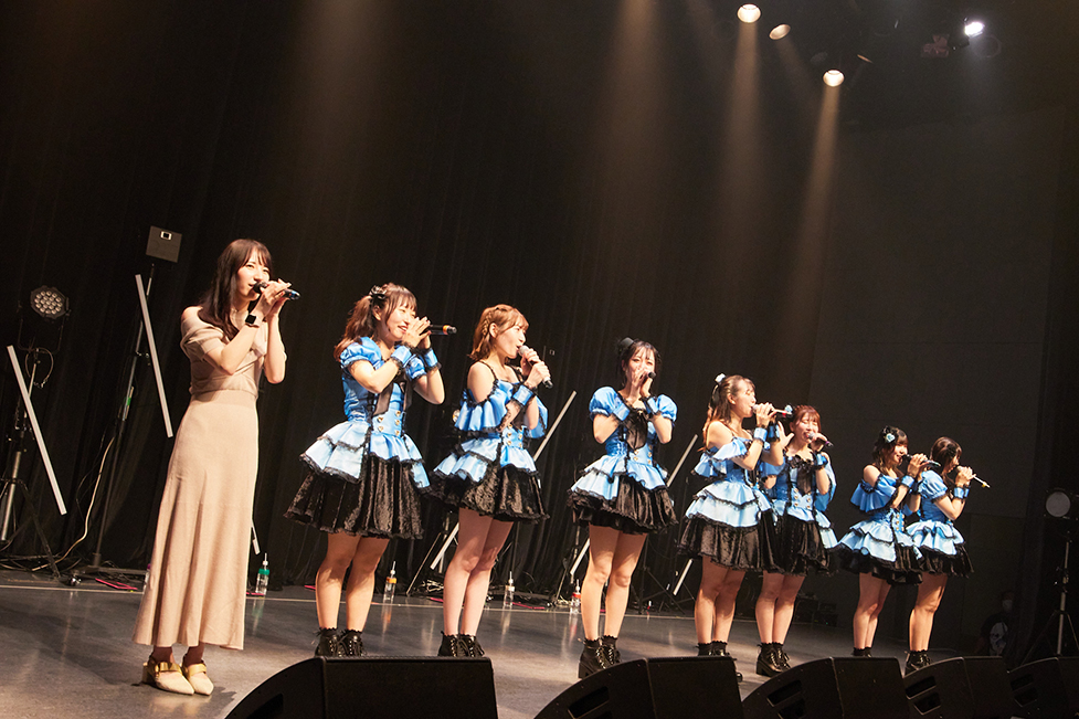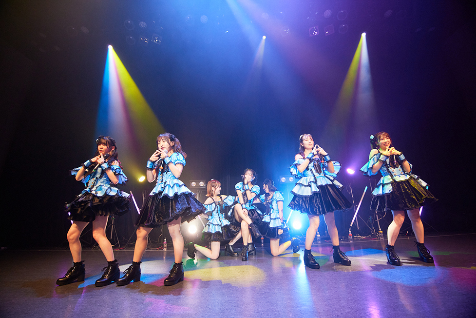 どんなことがあっても挫けることなく、仲間たちと一緒に、自分たちの足で未来へ向かって歩き続ける。強い意思を示した『YES, 肯定ペンギン』から、ライブはスタート。新衣装姿での登場も、胸をときめかせた。サビ歌で、7人のメンバーが心地好く跳ねながら、頭上高く掲げたタオルを振り回す。その姿へ思いを重ねるように、フロア中の人たちも、タオルや色とりどりのペンライトをくるくるまわしていた。お尻を可愛く振りながら輪を描くように行進するダンスも愛らしい。上手な生き方など、出来なくていい。こうやって仲間たちと一緒に、無邪気な笑顔を浮かべ、心を一つにしてゆく。こんな楽しい贅沢は、普段の生活ではなかなか得られない。