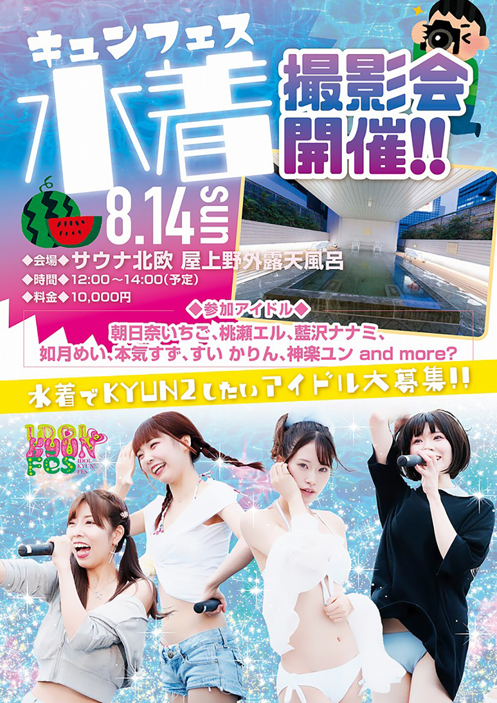 2本目が、8月14日(日)に、真夏のプールサイドならぬ、真夏のサウナの屋上野外露天風呂を舞台に行う撮影会「キュンフェス水着撮影会」。場所は界隈では超有名な「サウナ北欧」!!夏の野外で、しかも屋上とはいえ、温かい湯の張った露天風呂が舞台。一体、どんな撮影会になるのか??熱い太陽の陽差しと、熱い温泉の湯。何より、心を熱々にさせる水着姿のアイドルたち。「熱々のトライアングル空間」の中、ファインダー越しに、あなたの火照った想いをぶつけながらシャッターを切ってもらいたい。