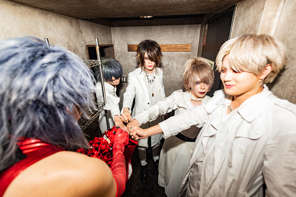 重厚なSE音に乗せ、フロア中から沸き起こった手拍子。その音へ導かれるようにメンバーらが舞台へ姿を現した。手にした楽器を鳴らし、みずからを鼓舞するメンバーたち。ライブはドラマー知哉のカウントを合図に、何時ものよう轟音を叩き付けるように幕を開けた。