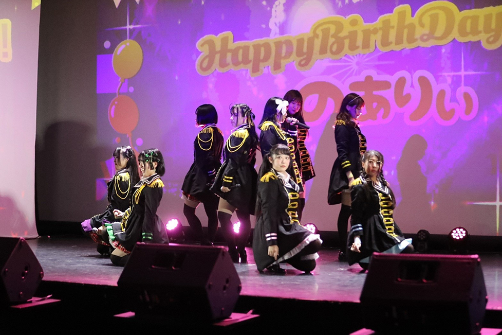 「シンデレラ・クレイム」から始まった稲森のあ生誕祭。メンバーは黒猫衣装で登場。熊野、佐々木、蒼音、三浦、高未はタキシードを身につけ、他のメンバーは黒いワンピースを着ているなど、おそろいの服装にも一人ひとりの個性が見える。メンバーたちは猫のポーズであざとくこちらを誘う。黒猫衣装の「シンデレラ・クレイム」はいつにも増して怪しげだ。彼女たちの色気とかわいらしさが同時に楽しめるパフォーマンスにファンも釘づけになったことだろう。