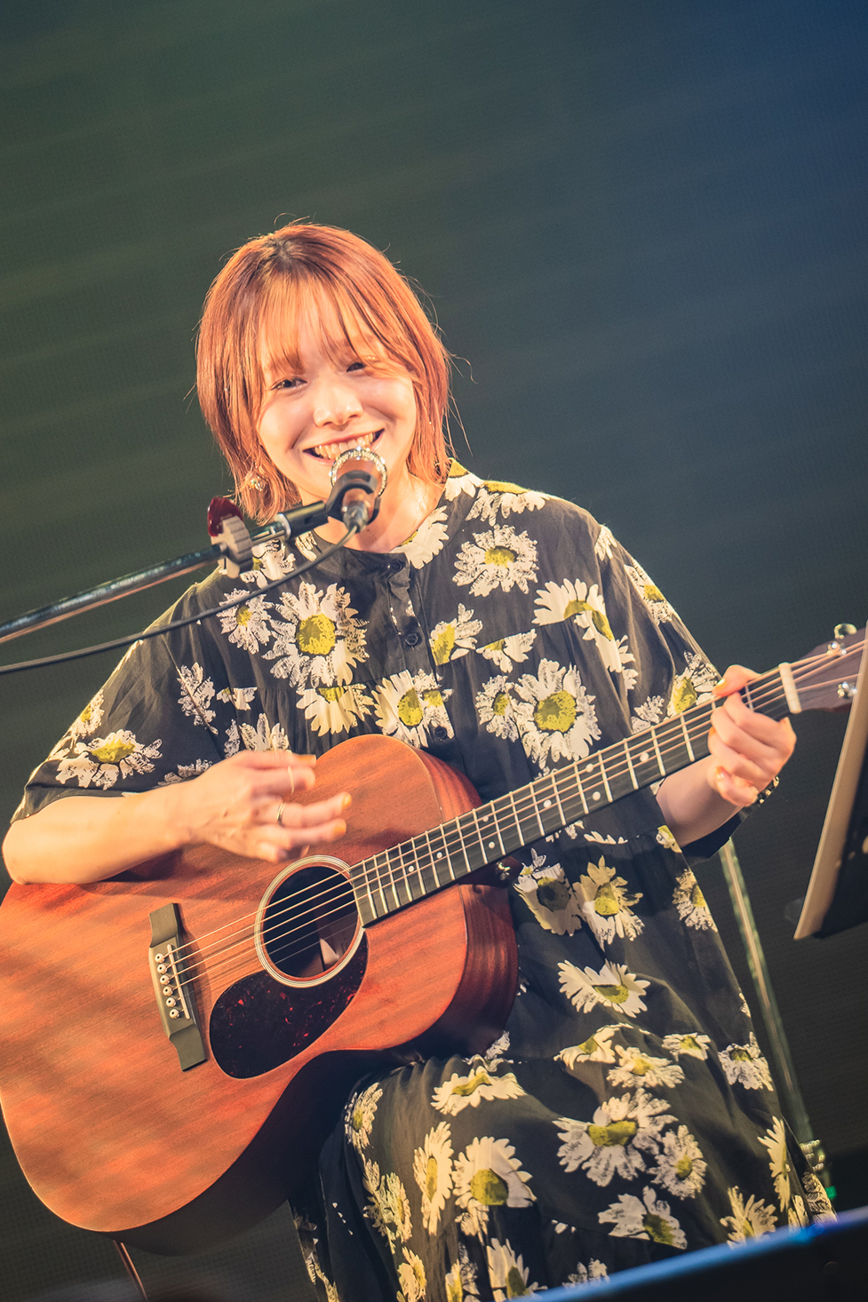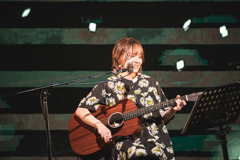 上間江望のライブの冒頭を飾ったのが、スキマスイッチのカバー曲『全力少年』。自身のアルバムでも音源化しており、本人もライブで好んで歌っている楽曲だ。アコースティックギターを軽やかに鳴らし、上間江望は弾むメロディーへ誘われるように、自身も気持ちを弾ませ、想いを真っ直ぐ届けるように歌っていた。原曲の持つエネルギッシュな部分を抑え、少し爽やかな色に塗り替えて届けるスタイルは、上間江望らしい色の描き方。彼女は爽やかで温かな歌声を魅力に、フロアにいる人たちの心の背中を優しく押すよう歌っていた。柔らかい光が降り注ぐような歌声やパフォーマンスだ。でも、曲が進むにつれ、その光は次第に熱を帯びていった。優しく背中を押してもらっていたはずなのに、何時の間にかグッと力強く背中を叩かれ、前へ押されていた。だけど、それも嬉しいじゃない。