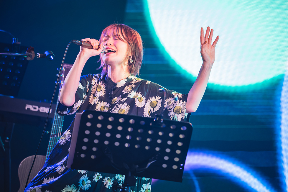上間江望は、ふたたびアコギを手にした。ここからは、オケとアコギの音を重ね合わせたライブへ。 心地好く跳ねた演奏と、軽いスタッカートの効いたギター演奏の上で、上間江望は駆けだす気持ちを『Stargazer』に乗せて歌っていた。時に、力強くストロークする演奏も印象的だ。心が、そわそわとはしゃぎたい気持ちに染まりだす。広大な景色の中を駆けるように歌う上間江望の声へ引っ張られるように、身体も気持ちも何時の間にか揺れていた。銀河空間を映し出した映像を背に、上間江望は温かな歌声を響かせていた。