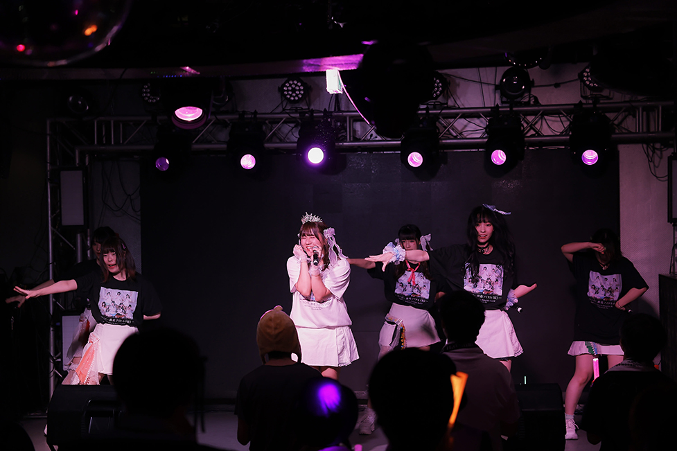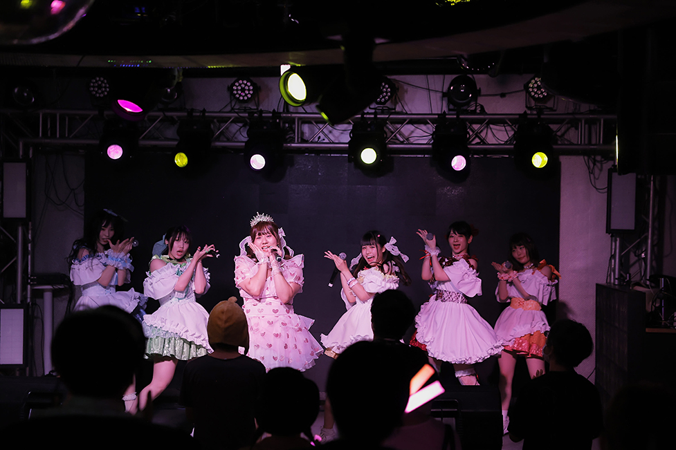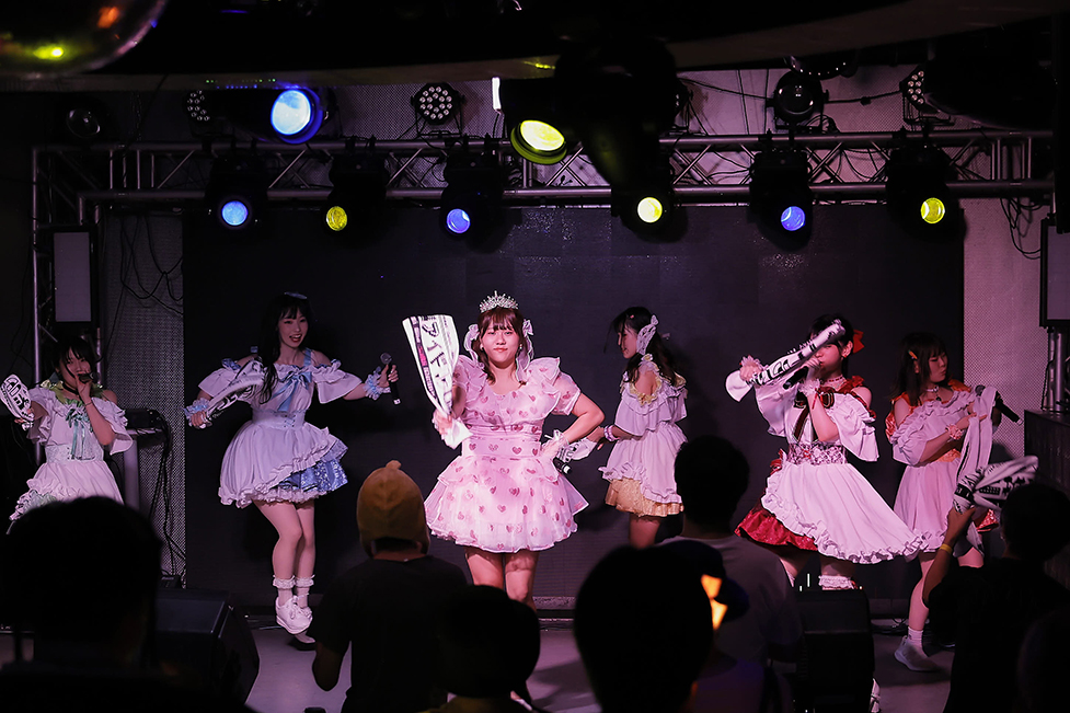 最後のブロックに並べたのが、コンビニ推進アイドル(仮)のライブの中へ大騒ぎの景色を作りあげる、激しさを全面に押し出した情熱デジロックナンバーの『chase the future』と『revelation』。メンバーらがヘドバンをしながら歌うと、フロアでもヘドバンしてゆく人たちも登場。最後の最後に、エネルギッシュな楽曲を立て続けに歌い踊りながら、高ぶる気持ちをぶつけあう景色をしっかり作りあげていった。