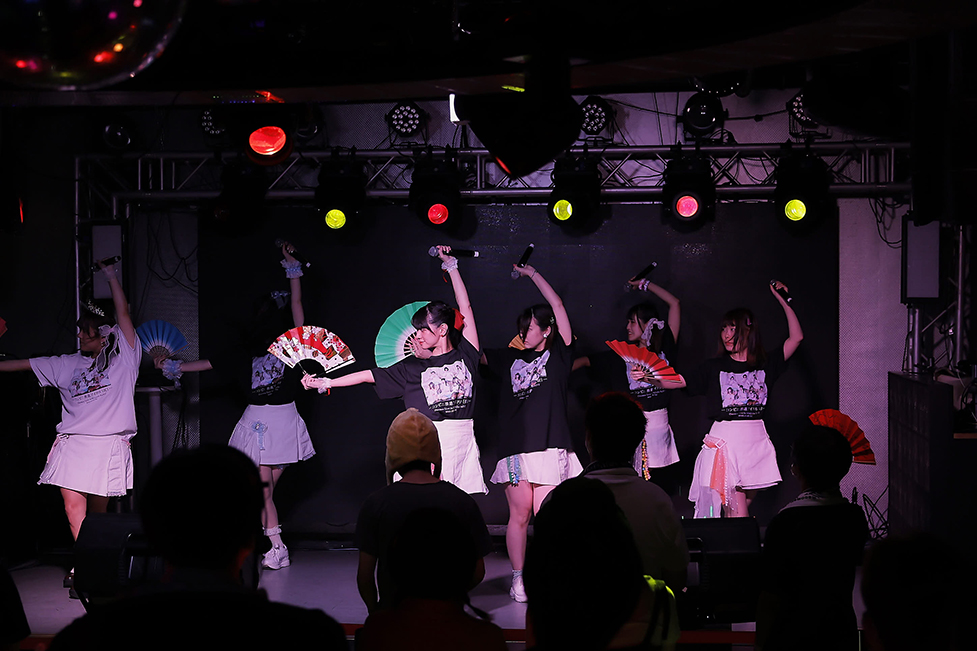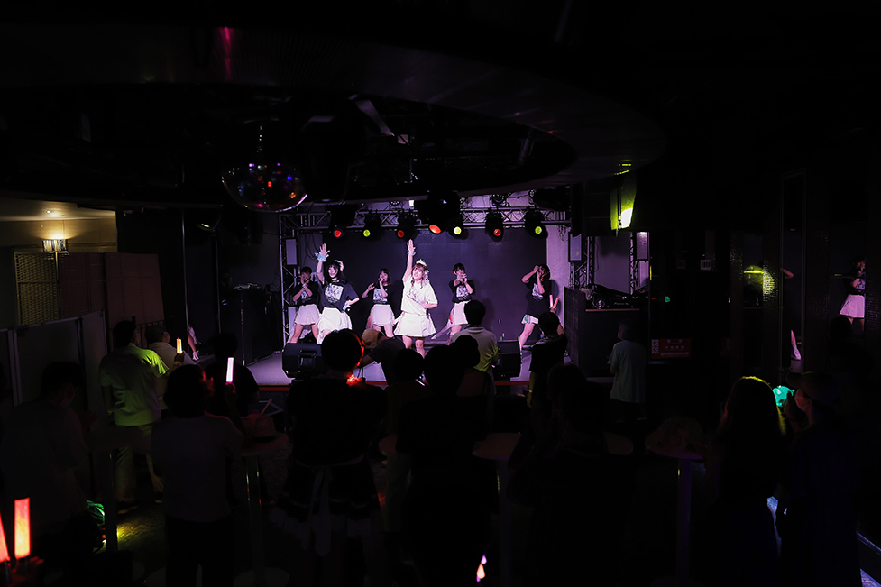 トロピカルなラテンビートに乗せ、外の猛暑とは異なるカラッと晴れた夏景色を描きだした『とびきりハッピーライフ』。続いて8月3日に発売する2ndシングルの表題曲『ZQDQ』と、このブロックでは気持ちを熱く騒がせるコンビニ推進アイドル(仮)流のパーティー曲を三連投。余談だが『とびきりハッピーライフ』を歌いながら興奮を覚えたメンバーの一人が、前へ前へとジャンプしすぎて舞台からフロアへ飛び下りそうになる場面も。メンバー自身がドキュンとした気持ちを高めながら歌い躍れば、その勢いにしっかりついていくファンたちとの一体化した様も印象的だった。