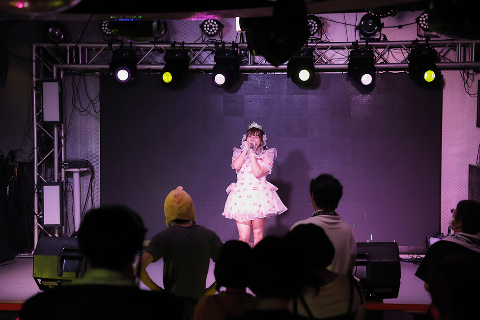 里実みあが歌ったのは、昭和歌謡とラテンの要素をミックスした『A2A2夏休み』。夏休みが始まるときの胸騒くドキドキした気持ちを、彼女はフロアから響くクラップをパワーに腕を振り上げ元気いっぱい歌いあげていった。