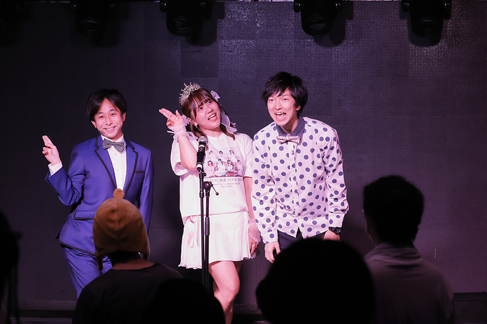 オープニングアクトとして登場したのが、今宵の主役の百海咲希と、コンビニ推進アイドル(仮)とは縁の深い漫才チームの“こぐれ”。3人で始めたのが、まさに”ザ・漫才”。裏話をするなら、開場前の十数分で打ち合わせとリハーサルを実施。本番では、普通に会話を始めた流れから、いつの間にか漫才へ入っていったように、漫才というよりも、互いにいじり、いじられしているうちに、笑いの世界へ入り込んでいった感覚だった。