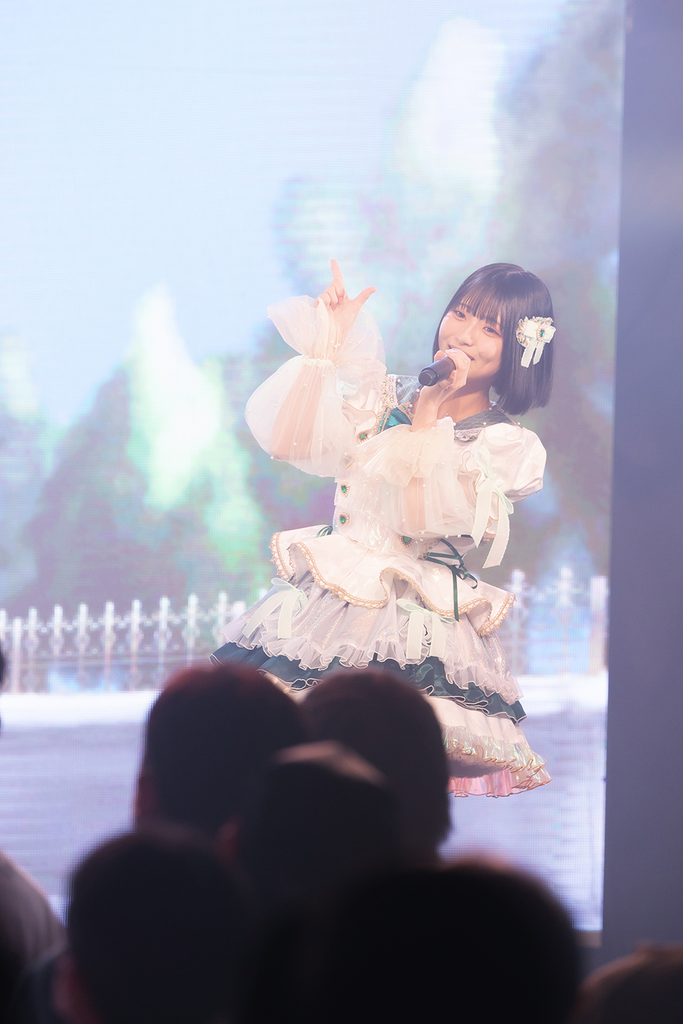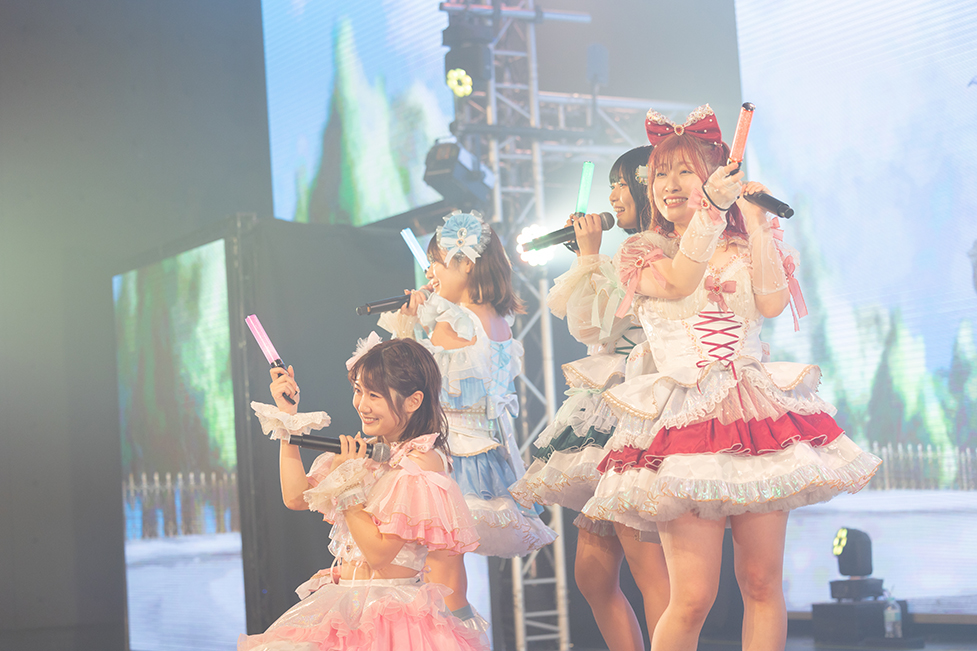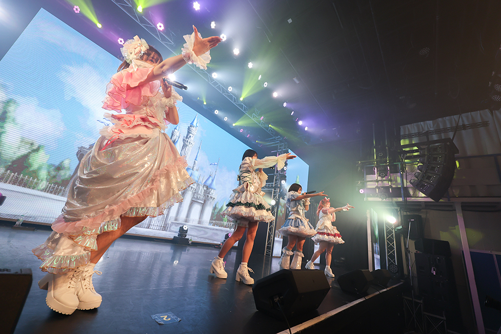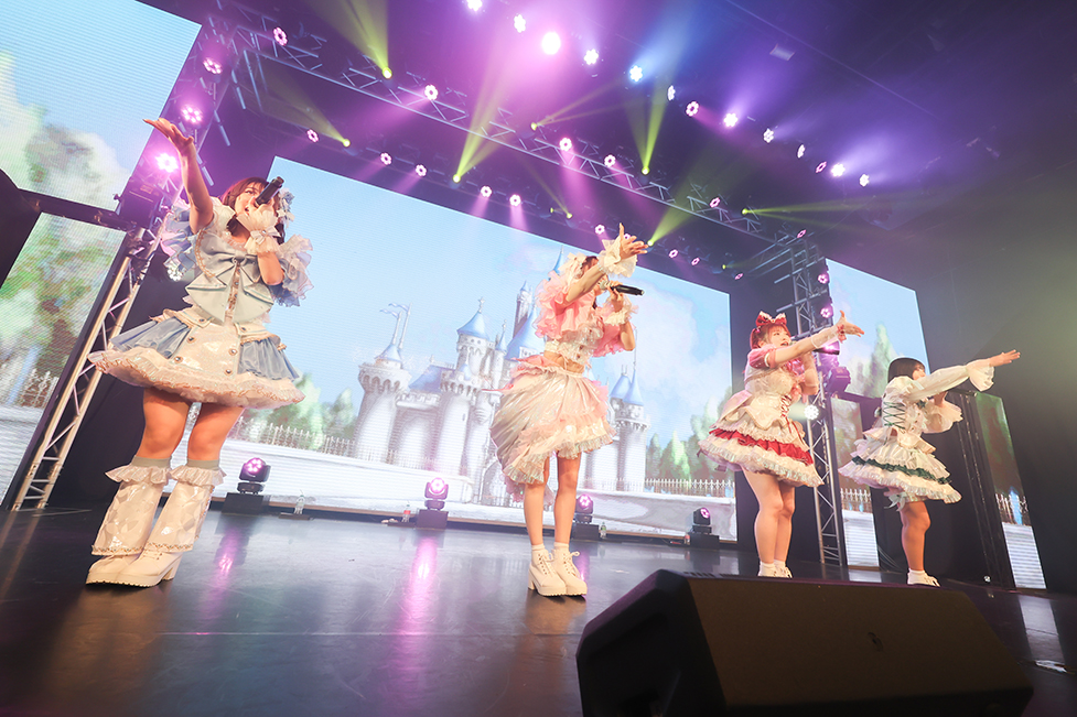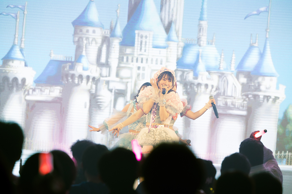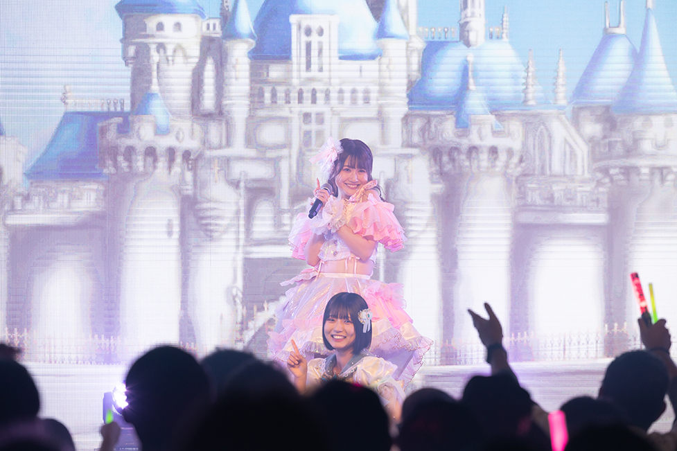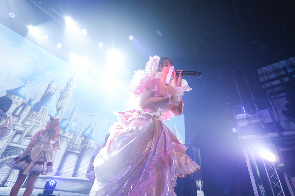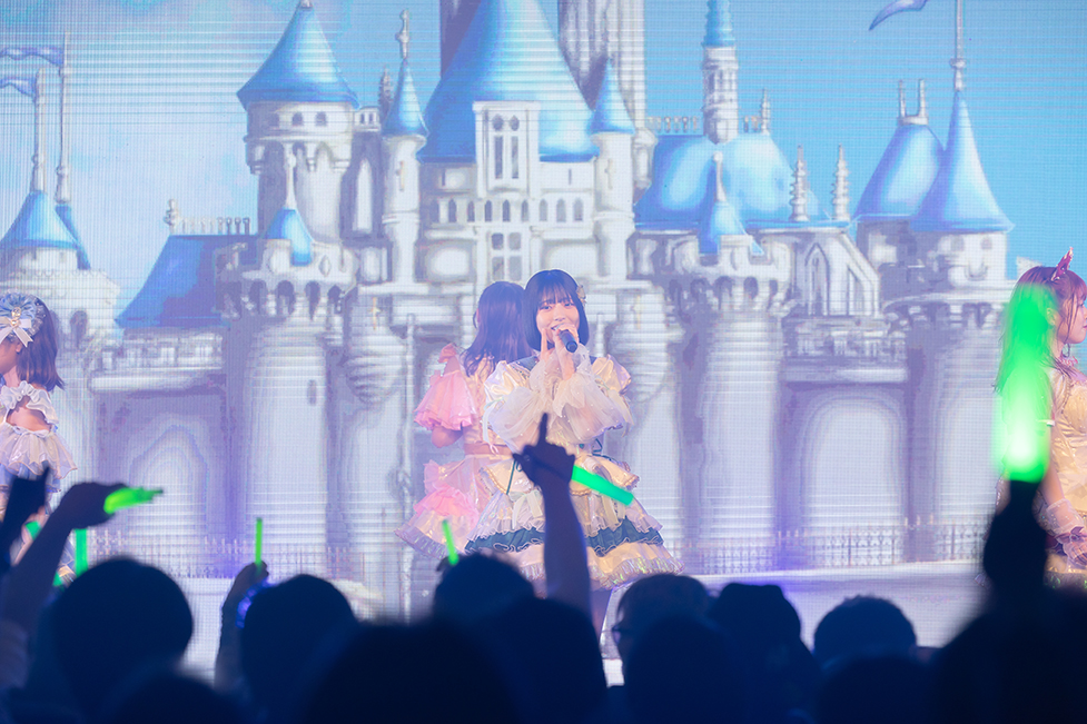 その始まりに相応しく、最初に歌ったのがNoelliLとしてのオリジナルナンバーの『プリンセスは、あたしだけっ!』。NoelliLの衣装姿が、可愛らしい。新曲の『プリンセスは、あたしだけっ!』も、ポップでわちゃわちゃとした、まさに胸キュンのアイドルソング。4人とも、めちゃ甘えた声でせまってきた。新メンバーの双葉ことはの魅力に寄り添うような曲調を通し、これまで以上にチャーミングな姿になった4人に胸がずっとキュンキュン鳴っていた。歌い終わったとたん、フロアのアチコチから響いた「可愛いい!!」の声が、それを物語っていた。