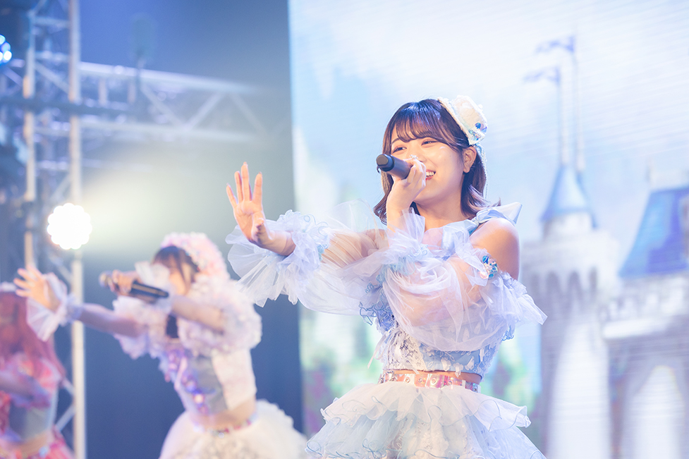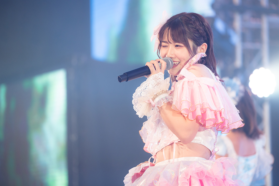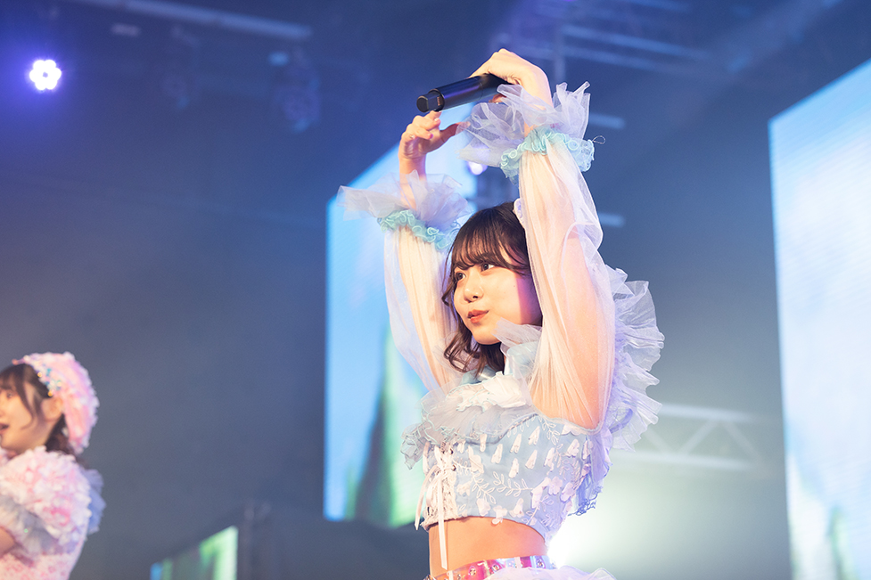 3人体制も、ここが最後のブロック。この曲に触れるたび、夏の始まりにも似た、期待やときめきに心が染まりだす。『いたずらさまーキュンラプソディ』に触れながら、一緒に淡い恋心に染まっていたい。いや、この日はみんなが熱い気持ちに染まっていたと言ったほうが正解だ。愛らしくも爽やかな歌声を響かせる3人に向け、猛暑以上の熱情した声をぶつける観客たち。この景色だよな。みんなが求めていたのは…。