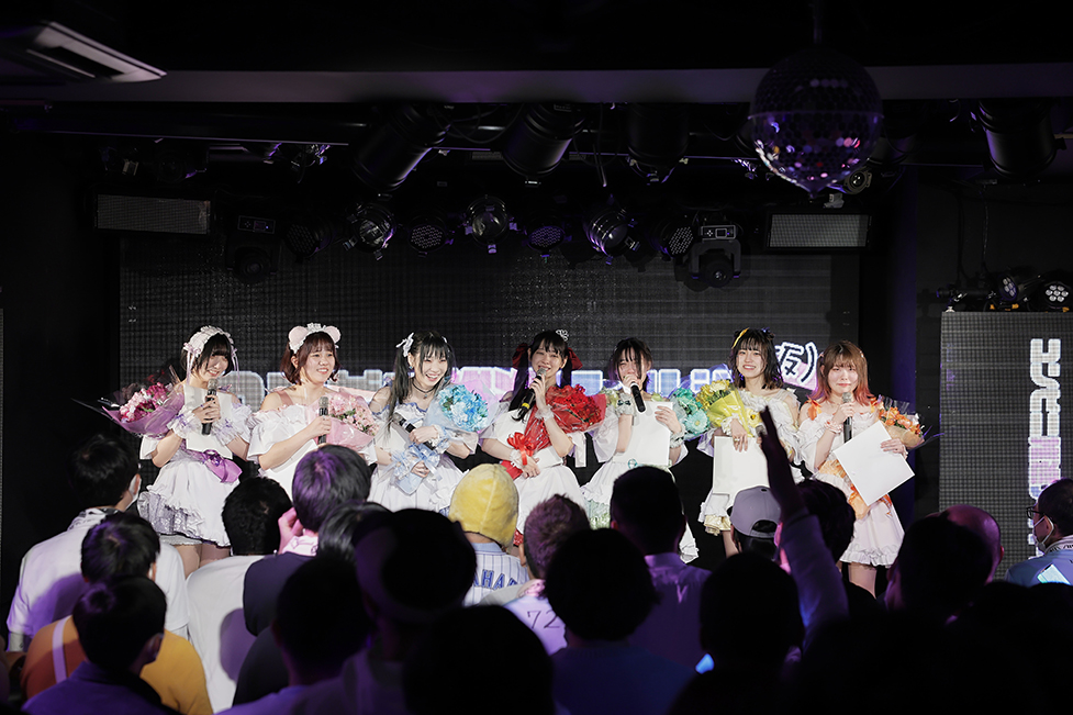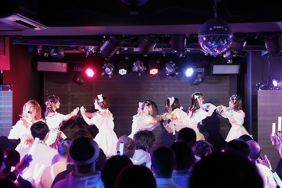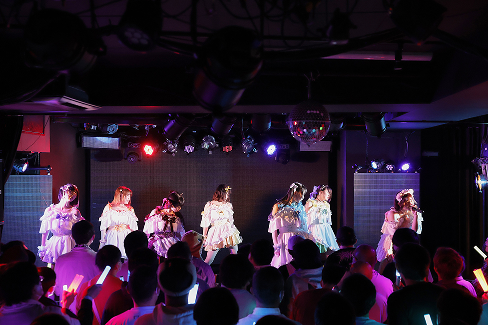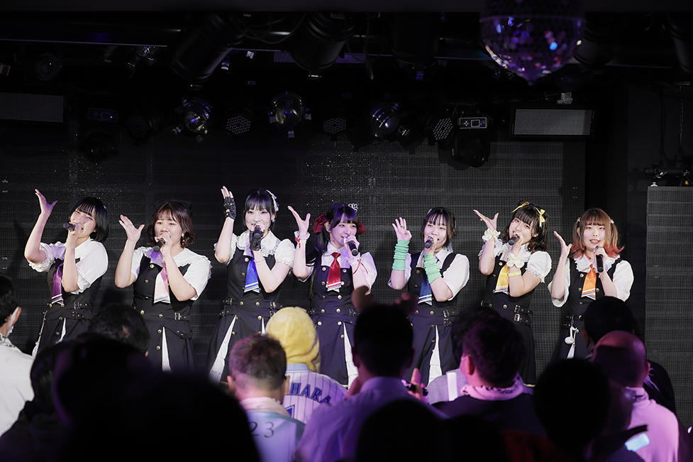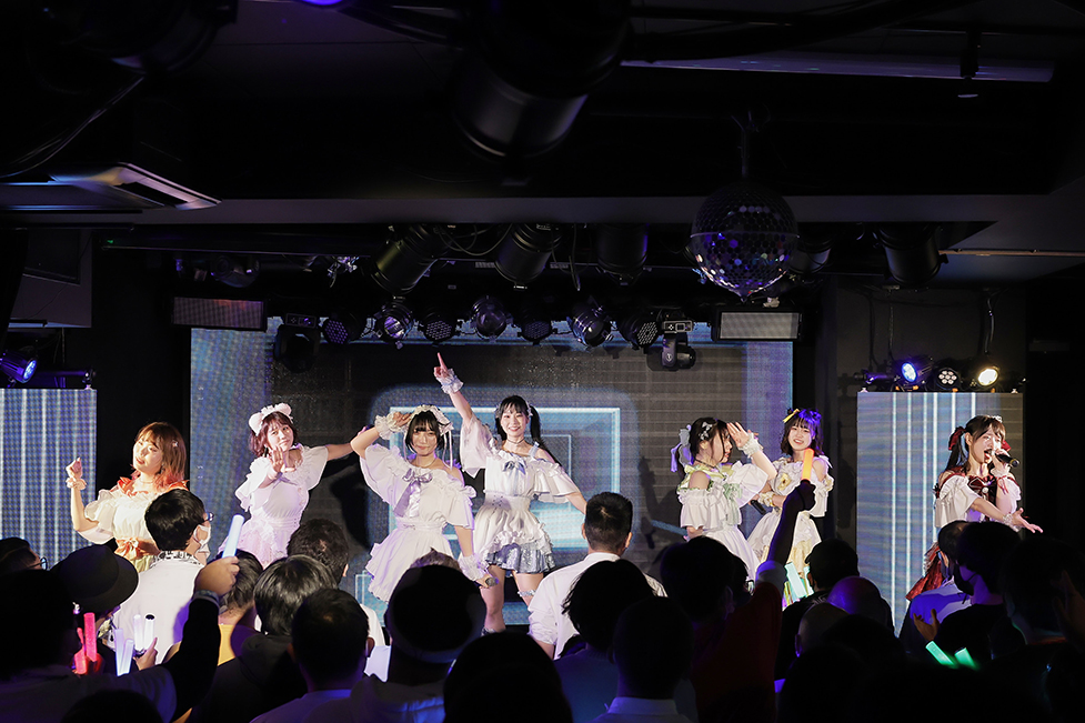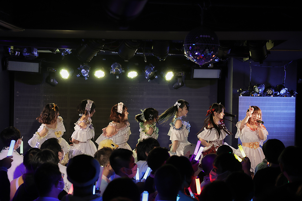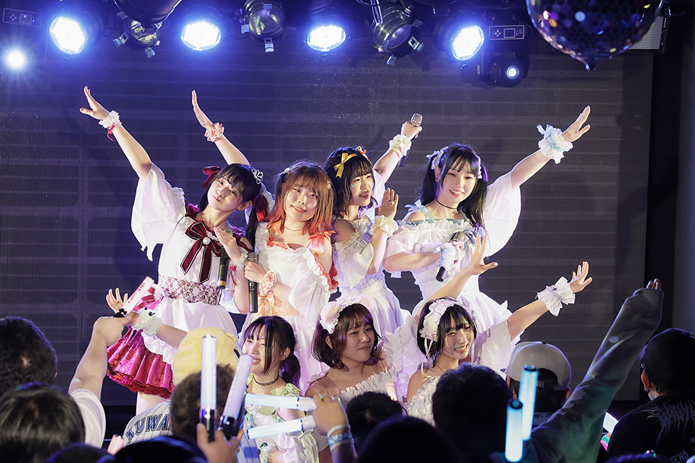 キュンキュンとしたときめきを降り注ぐ『Mix Party』でも、愛らしい7人に向かって、フロア中から熱い声が飛び交う。舞台の上で彼女たちが手遊びをするなど、ガールズパーティーを繰り広げている姿も本当に可愛らしい。間奏では、メンバーたちが「愛してる」の言葉を次々と口にしてゆく。その言葉に打たれ、「俺もー!!」と叫ぶ人たちがいたのも印象的だった。