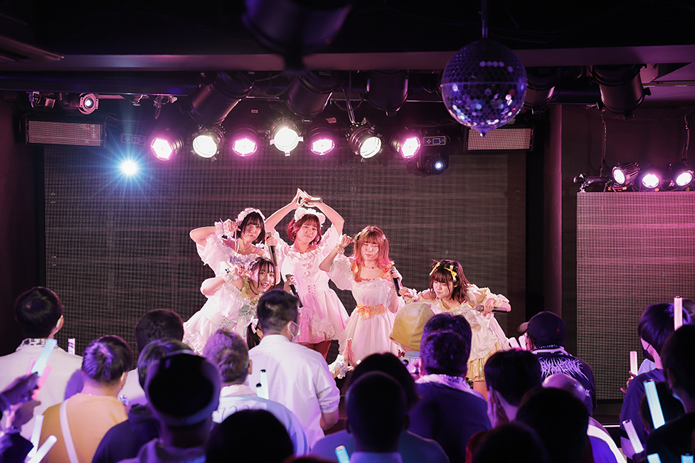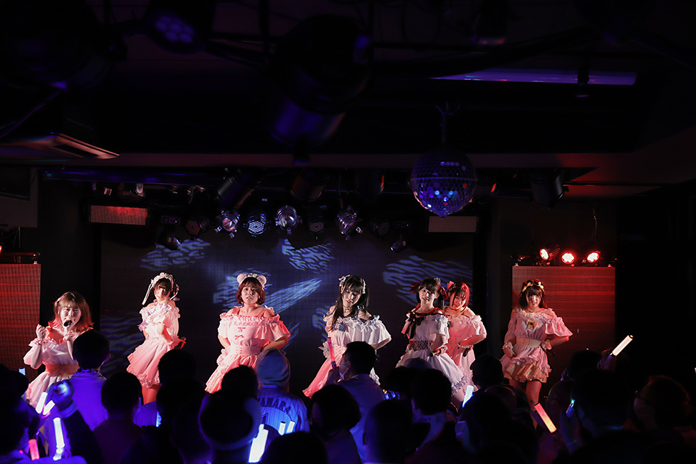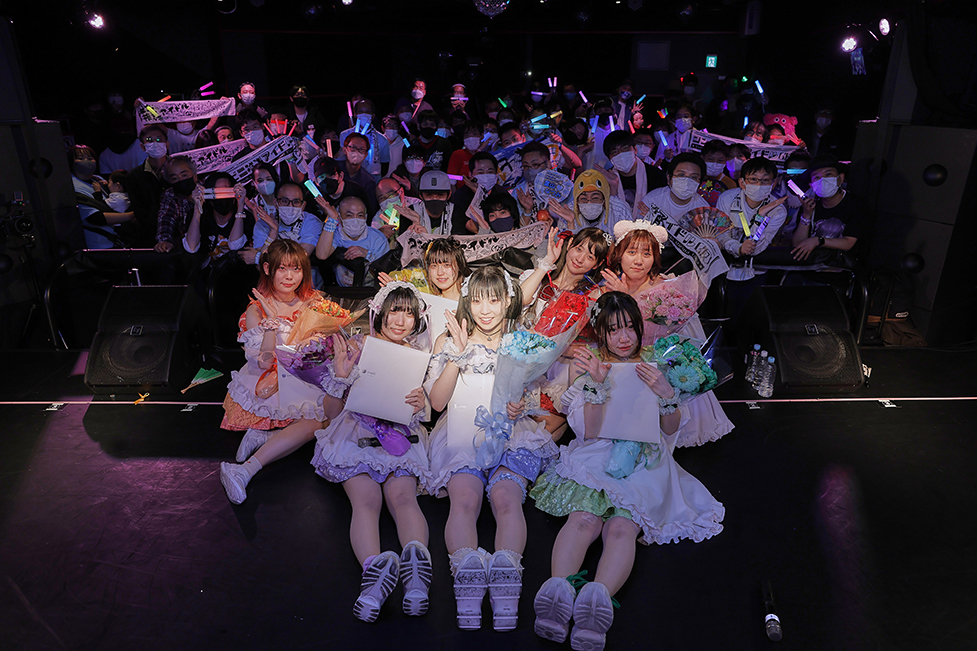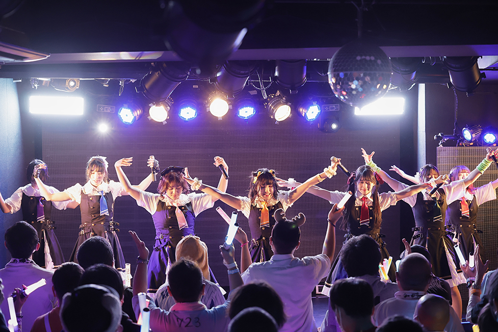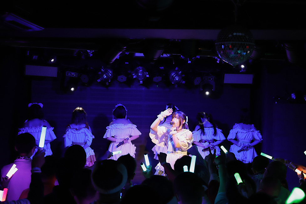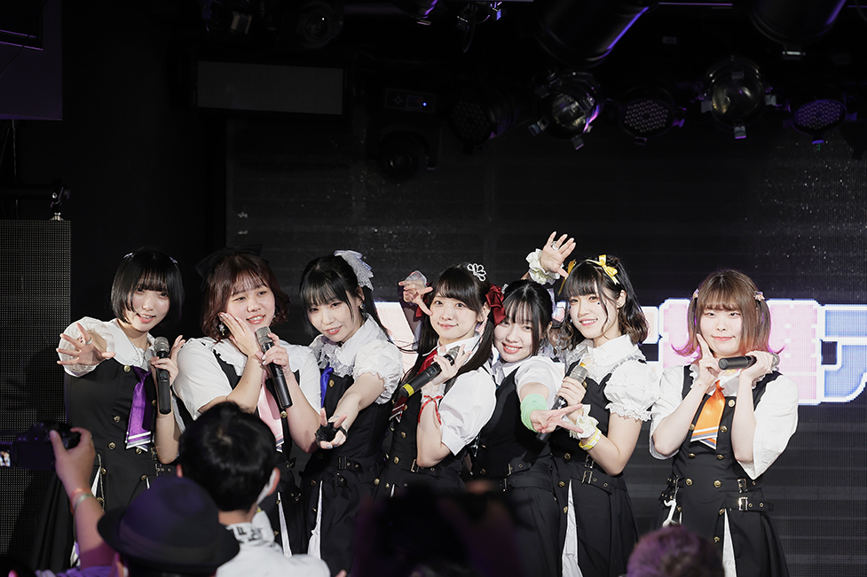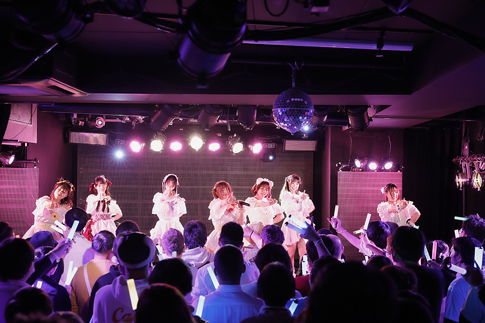 キュンキュンとしたときめきを降り注ぐ『Mix Party』でも、愛らしい7人に向かって、フロア中から熱い声が飛び交う。舞台の上で彼女たちが手遊びをするなど、ガールズパーティーを繰り広げている姿も本当に可愛らしい。間奏では、メンバーたちが「愛してる」の言葉を次々と口にしてゆく。その言葉に打たれ、「俺もー!!」と叫ぶ人たちがいたのも印象的だった。