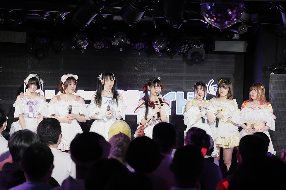 「2年前にこのステージで始動したときは、着席でも人数の少ない状態からのスタートでした。それがこんなに増えて、こんなに素敵な景色を見れて本当に幸せだなと思います。 この7人じゃなかったら叶わなかったことがたくさんあるし、ファンの方一人一人がいなかったら、目標にしていた場所にも出れなかったと思います。わたしは、一人でも多くの人を笑顔にしたい、背中を押したい。居場所になりたいと思ってアイドルを始めました。ちゃんとアイドル出来ていましたか?コンビニ推進アイドル(仮)としてステージからみんなの顔を観ることがなくなってしまうのはすごく悲しいんですけど。この景色は絶対に忘れないし、みなさんも私たちのことをずっと忘れないでね。出会ってよかった、推しで良かったと持ってもらえるように、これからも精一杯頑張るのでそばで見ていてください。」(葉山なつみ)