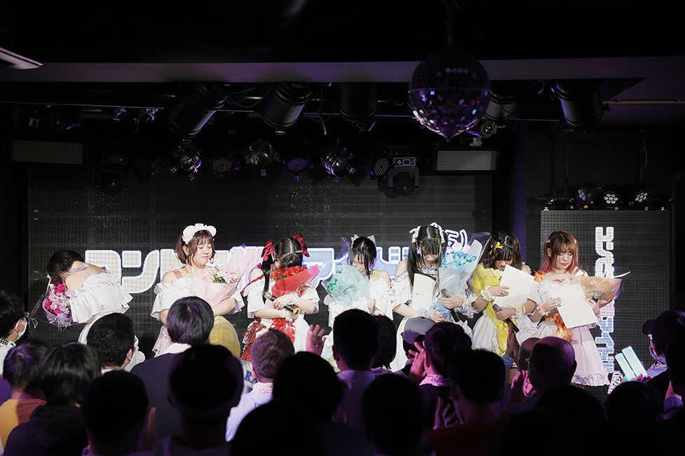 その眩しさをひと際輝かせるように7人は、中村冬香が作詞をした『君のモノガタリ』を歌唱。君(ファン)のことを思う、乙女の胸の内を歌ったこの曲も、互いの関係を熱く結び続けてきた大切な歌。たとえ、コンビニ推進アイドル(仮)という形でこの関係は途切れようと、この舞台を手放さない限りボクとキミとの物語はこれからも続いていく。彼女たちの未来はまだ見えていない。でも、ここへ記した気持ちが消えない限り、また絆を結び直せるはず。そのためにも今は、ここまで結び続けてきた絆を改めてギュッと深く締めていたい。この曲を歌いながら、何時しか中村冬香が泣きじゃくっていた。
