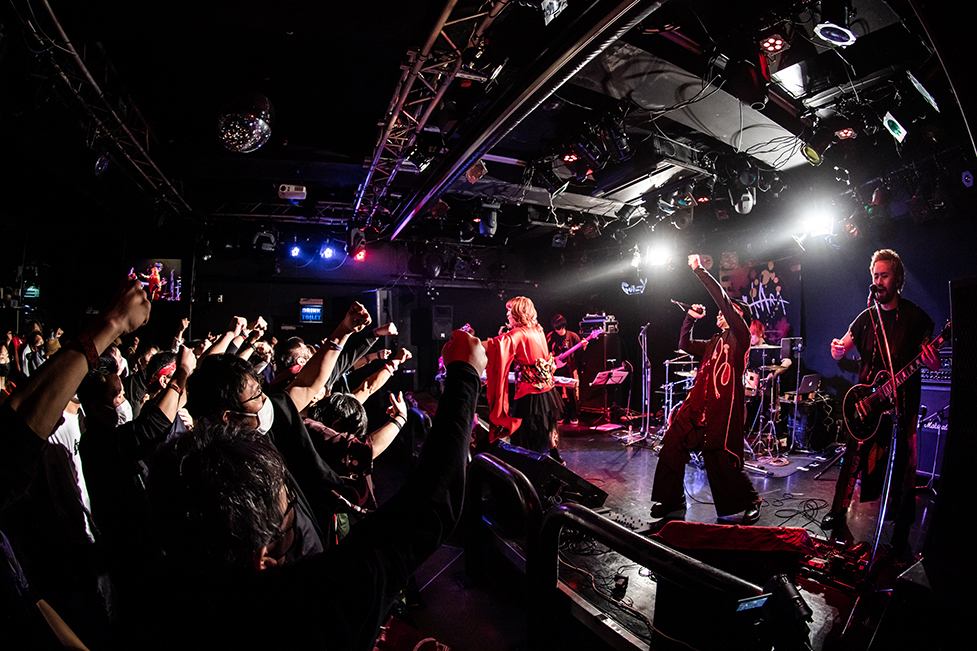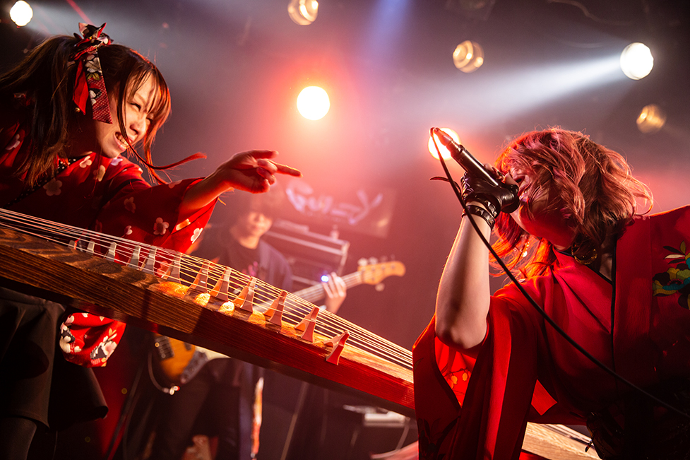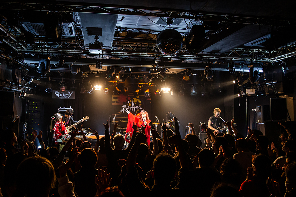 Tommyの艶やかな箏の音色を合図に、楽曲は『迅雷風烈』へ。たおやかな旋律と荒ぶるロックの衝動を重ね合わせた楽曲は、フロア中の人たちの巻き起こす拳と絶叫の風を受け、感情を激しく荒らげだす。メンバーらの身体を折り畳み歌い奏でる姿に合わせ、観客たちも同じ振りを真似るのも、いつもの光景だ。そこへ、熱い声が入り交じる。メンバーと観客たちが身体を大きく折り畳む様に触れ、沸き立つ衝動を抑えられない。拳を突き出すMIKIKOの笑顔が印象的だ。本当に楽しげに歌っている。彼女の歌へ導かれるように、フロア中の人たちも拳を突き上げ「オーオーオーオー」と声を張り上げていた。