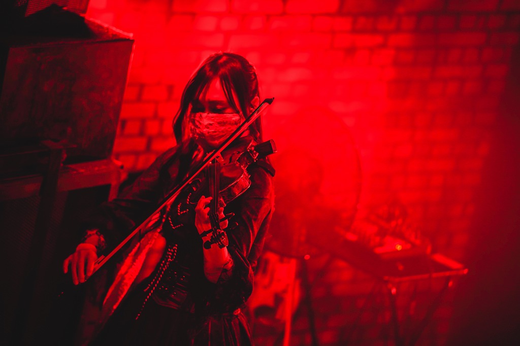 舞台の最後に登場したのが、ヴァイオリニストのemyu:。彼女は、『旋律の妖(Ark of Chaos)』を演奏。荘厳かつ悲壮な色を持つクラシカルな音でパガニーニのカプリースNo.5を弾き出し、そこから即興で楽曲を転換していきカデンツァとして弾き上げた。操るのはエレキヴァイオリンではなく彼女のメイン楽器であるクラシックヴァイオリン。物悲しさの中から見える情熱。彼女もまた、熱い魂を宿した存在だ。やがて背景の音楽が不穏な空気を膨らませるのに合わせ、emyu:は囁揺的音楽集団AsMRの『Ark of Chaos』を物悲しい音色を持って響かせた。ときに混沌へと導く不穏で重厚な音色を奏でながらも、高尚な曲として『Ark of Chaos』を昇華していった。なんて、高貴で貴賓にあふれた。でも、痛い刺を抱いた音色も響かせられる表現者なのだろう。