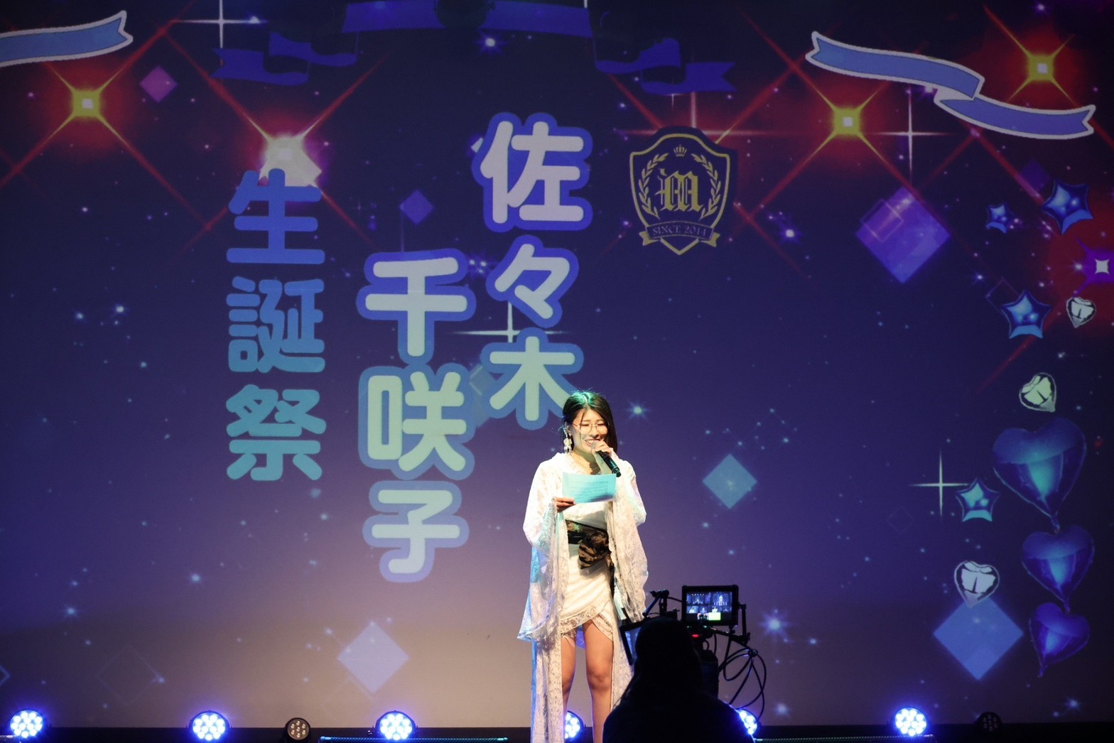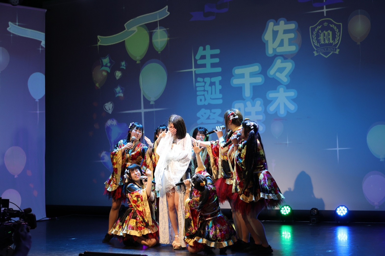 ここからは、佐々木千咲子の生誕祭のコーナーへ。メンバーみんなで「ちっさー!!」と声をかけたところで、生誕衣装に着替えた佐々木千咲子が勢いよく駆けだして舞台へ。メンバーたちから「織り姫みたいだねぇ」の声をもらえば、その言葉へ思いを返すように、佐々木千咲子が「みんなを星の世界へご招待」と語りながら、みんなで『星の記憶が降る夜に。』を歌いだした。生誕祭のコーナーといえば、主役が一人で歌うことがほとんど。でもこの日は、メンバーたちも自身のコーナーへ呼び入れて歌を届けてくれたところが、メンバー思いの佐々木千咲子らしさ。