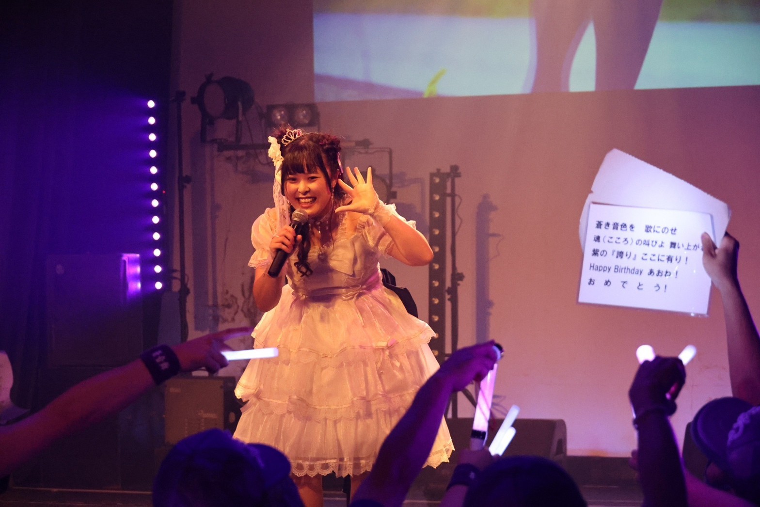 白いドレス姿に装った蒼音舞の姿が、とてもかわいらしい。ここからは、蒼音舞の生誕コーナーへ。最初に歌ったのが、蒼音舞の「Oi!Oi!」と煽る声から始まった、ソロナンバーの『Red voice』。とても力強くパワフルな歌声を響かせ、蒼音舞は広報委員たちのハートを騒がせる。気持ちを熱く揺さぶる歌声に刺激を受けたフロア中の広報委員たちが、同じように声を上げ、その場で大きく飛び跳ねながら、蒼音舞に熱いエールを送っていた。一体化したその景色は、見ている側の気持ちまで熱く揺さぶってくれた。