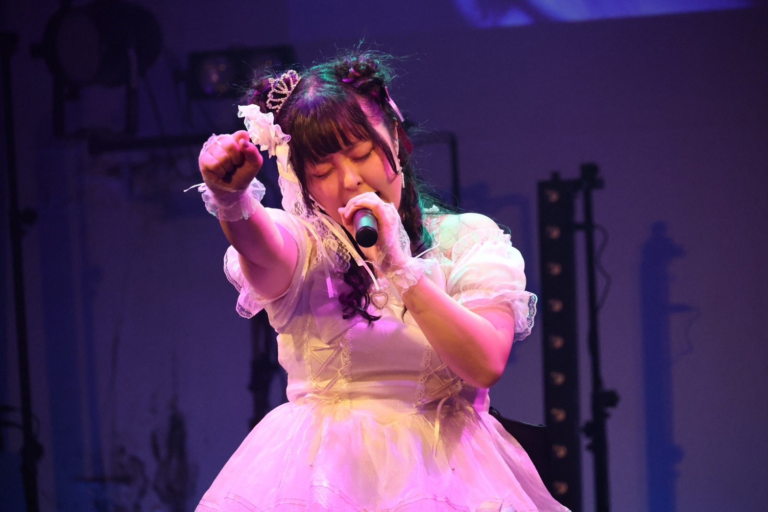 ロック好き、パワフルな楽曲が大好きな蒼音舞らしく、ここからは魂を熱く燃やす激しい楽曲を3曲立て続けに歌唱。フロア中の人たちを熱く煽るように、凛々しい声で歌った『恋時雨』。間奏では、メンバーと広報委員(観客)たちが互いに拳を高く振り上げ、「Oi!Oi!」と熱い声を交わしあう場面も見せていた。『夢幻華』でも、いつも以上に激しい春(歌声)の風を吹かせ、観客たちの熱情した声も加え、歌の中で飛び交う桜の花びらたちを高く高く舞い上がらせていた。熱狂する広報委員たち。そこへ、さらに畳みかけるように『BRAVE』を熱唱。なんて迫力に満ちたライブだろう。フロア中から上がった拳や紫のペンライトが、ずっと揺れていた。熱情ナンバー3連投という理由もあり、メンバーの歌声にどんどん迫力を増してゆく様が、臨場感を持ってフロア中に伝わってきた。