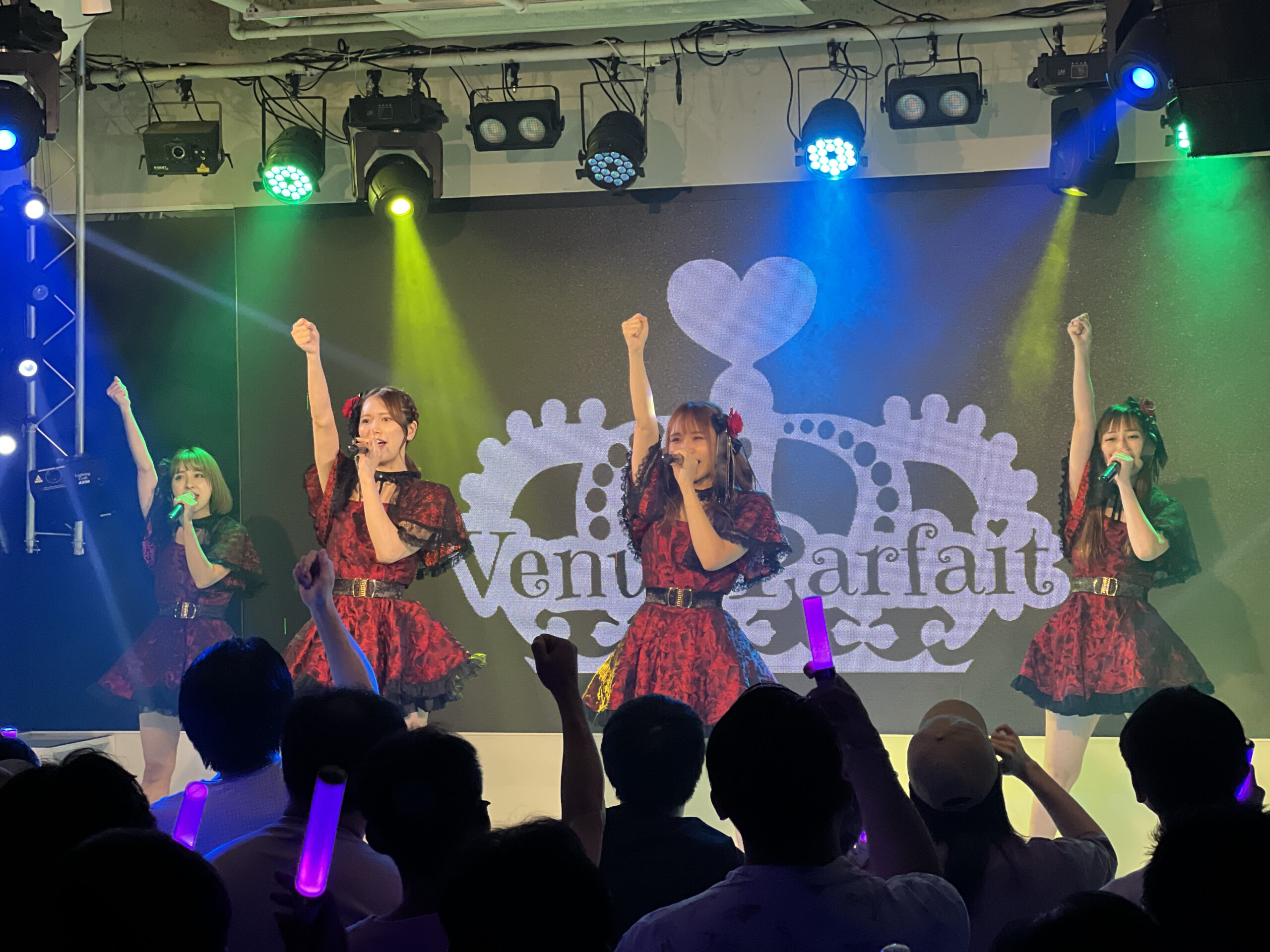 ライブは、Venus Parfaitらしさを前面に押し出した『Private Lesson -おしえてあげる-』からスタート。彼女たちは、「そんなセリフを言ってるうちは まだまだお子ちゃまだね」と、観客たちを妖しく挑発するように歌いだす。初ライブとはいえ、そこは経験者たち。Venus Parfaitの絶対的な魅力であるセクシーさを醸しながら、4人は「Baby 教えてあげる」と終始挑発するようにせまってきた。中に出てくる「教えてあげる」のセリフから、ムンッとした大人の色気が漂ってくる。ラップを通して攻めた面も描きつつ、跳ねたリズムに気持ちを重ね、4人は懐深い大人の女性だからこその魅力を歌い踊りながら見せてきた。終盤には、メンバーらの歌声にあわせ、観客たちも「Oh! Oh! OhOh Oh!!」と声を上げだす。4人が甘い視線と艶かしい姿で教えるライブというレッスンに触れ、フロアには汗ばむ熱気が生まれていた。