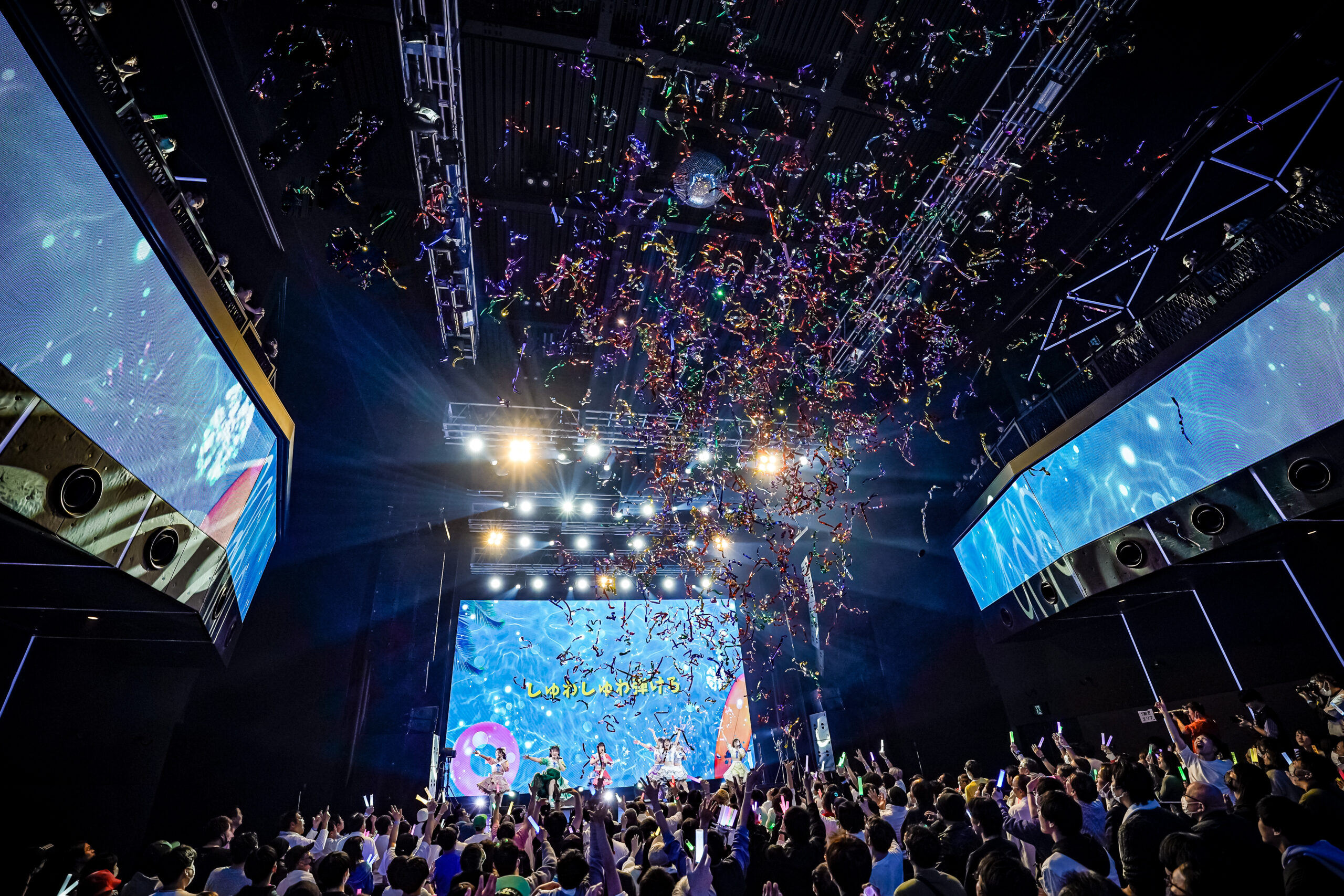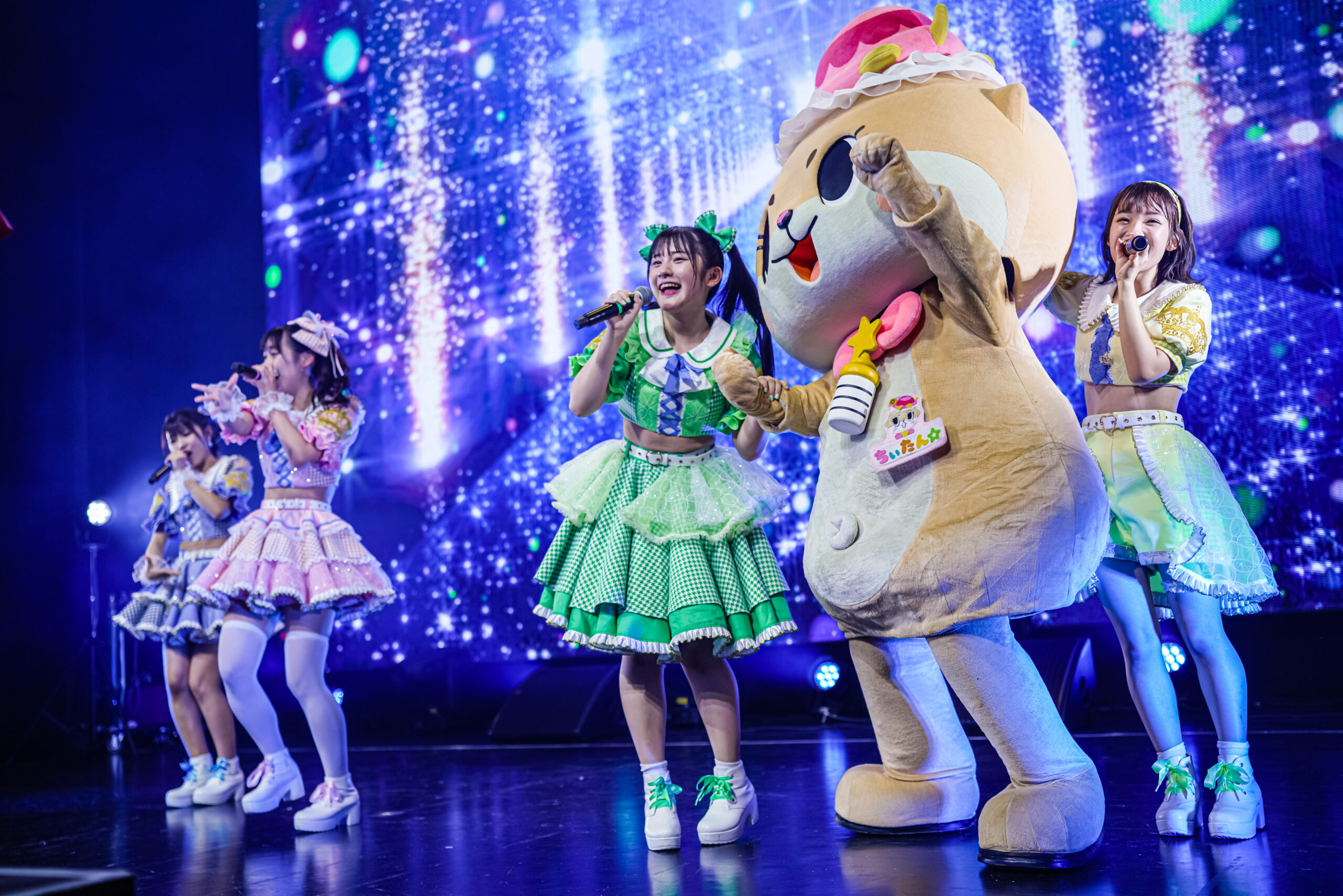 ラストスパートの1曲目はデビューシングルの「STAGE!!」。秋葉原観光推進協会公式キャラクターの「ちぃたん☆」が駆け付け、一緒に仲良く踊るコラボステージを展開。続く「夏色ラムネ」で7人は所狭しとステージを駆け回りながら、弾けるようなパフォーマンスを見せ、曲間にはキラキラと輝く銀テープが客席に発射された。