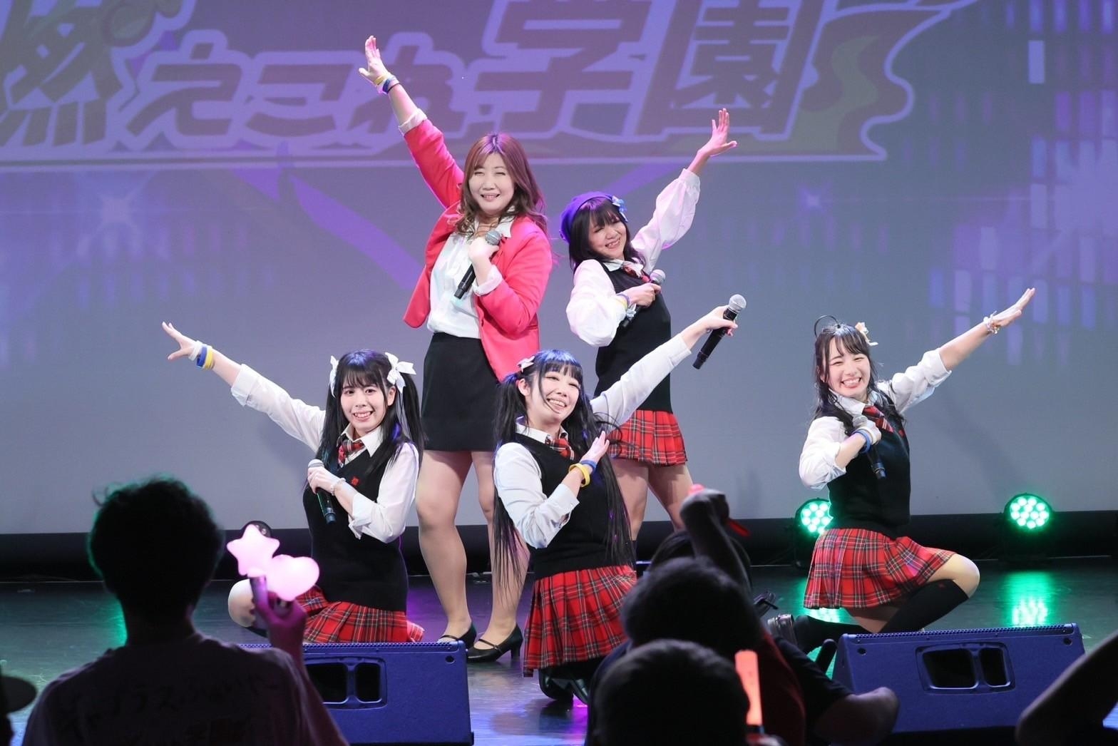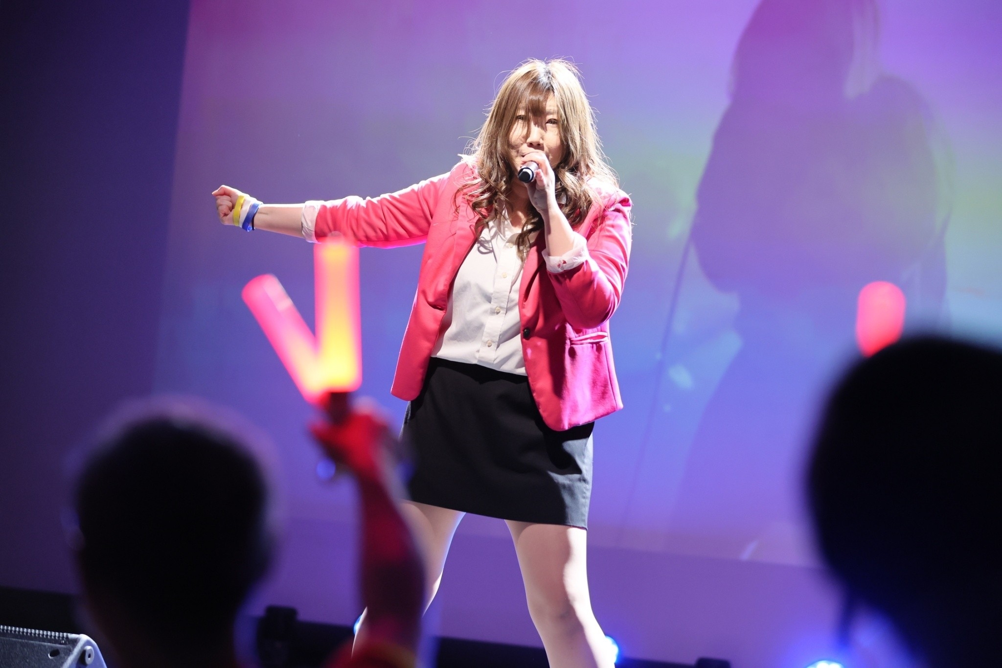 「つうしんぼユニット」コーナーすべてに登場。迫力のある歌声を持って。さらに、腕をくるくると回し 場内中の人たちを巻き込みながら、熱狂一体化した景色を作りあげていった。圧倒的な存在感を放つその姿が燃えこれ学園の中心に居続ける限り、このグループは安泰。そう思わせてくれたライブだった。