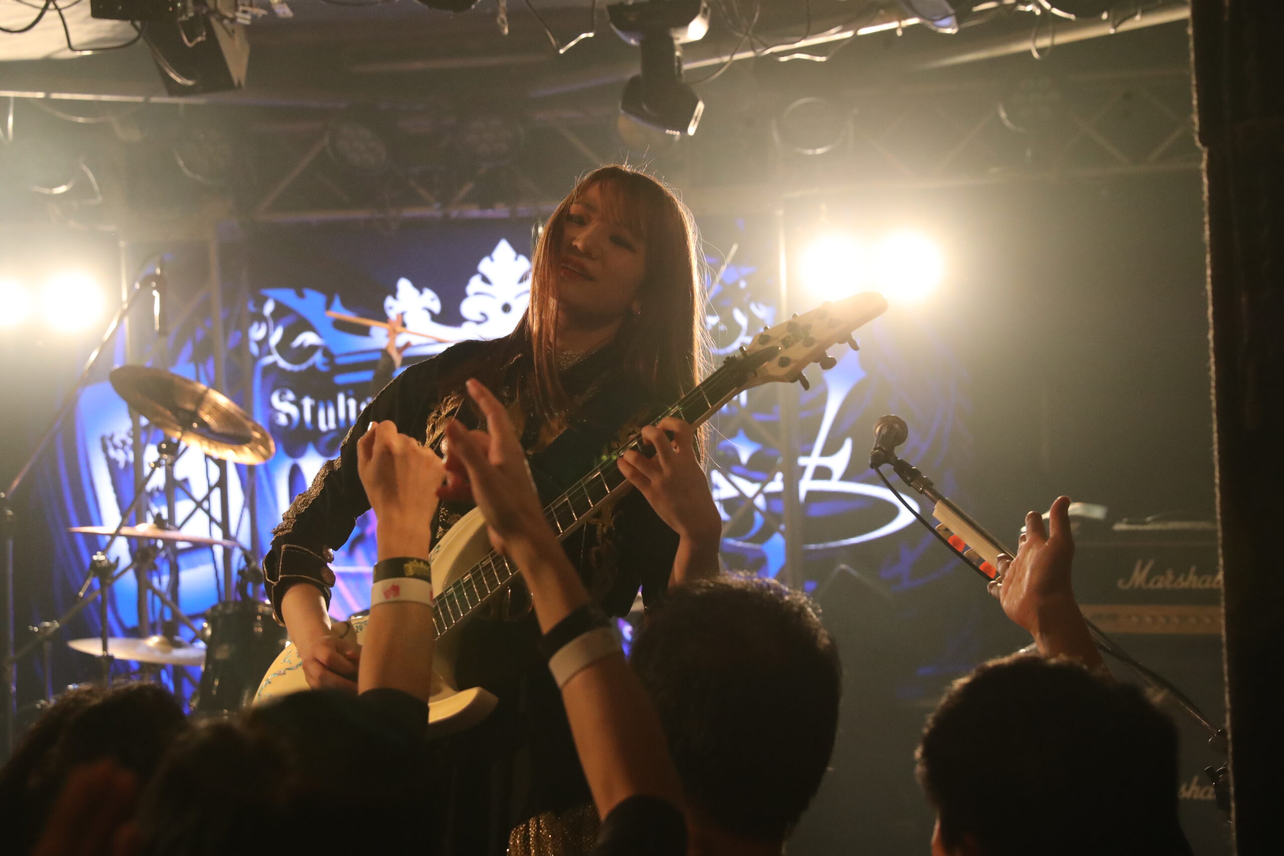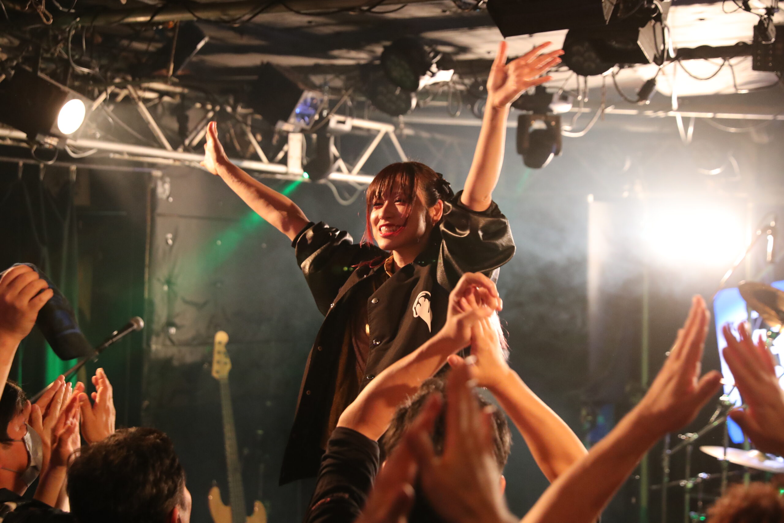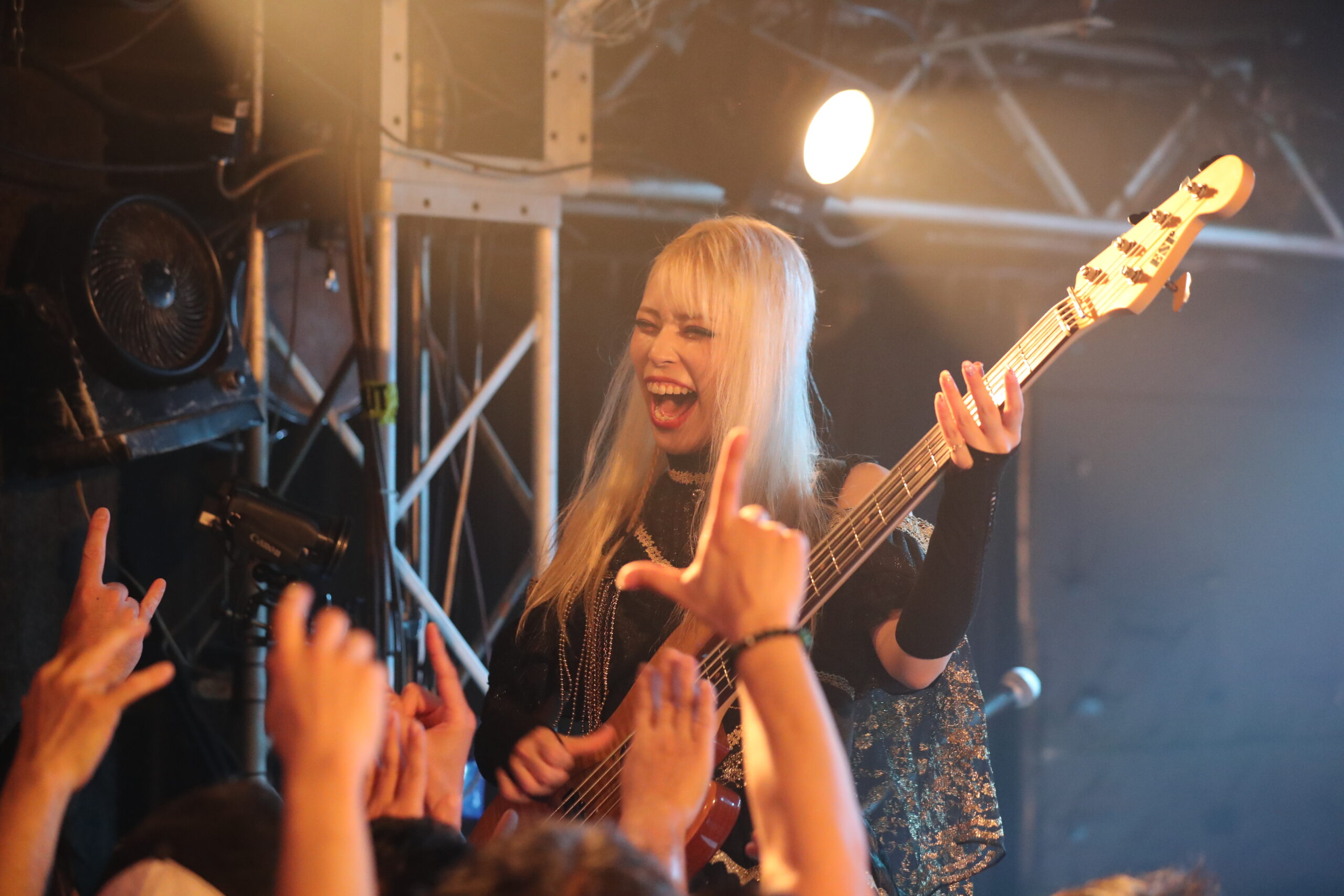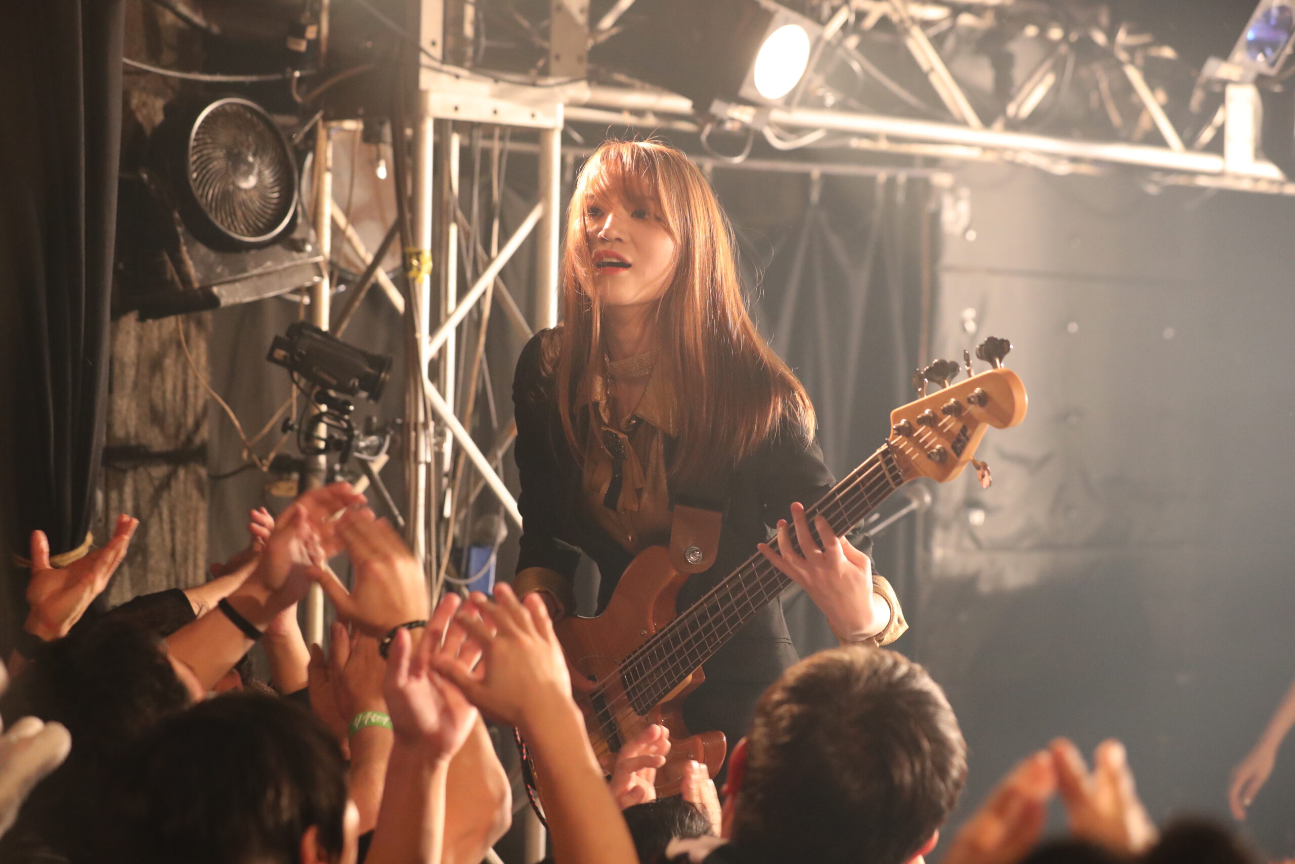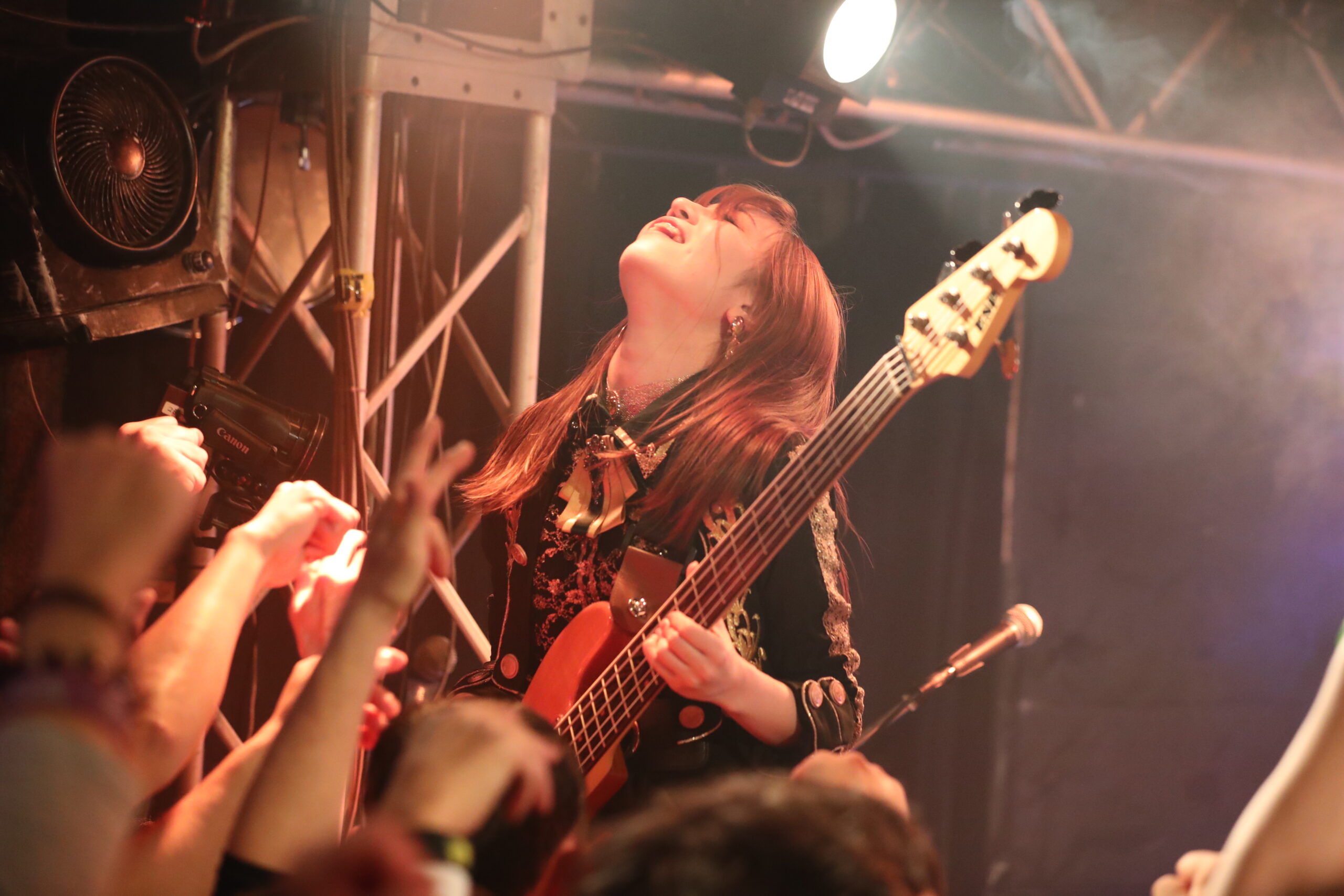 次のブロックで魅せたのが、いおり(Dr)とマリー(B)によるセッション演奏。マリーのスラップの演奏を軸に、そこへタイトでリズミカルないおりのドラム演奏が寄り添い、跳ねた強烈なメロ&リズムを打ち出す。場内中の人たちも、2人や、それぞれのソロ演奏に向け、熱い声を張り上げてエールを送り続ける。跳ねた演奏をかけあう2人の姿に触れ、胸が嬉しく騒ぎだす。「Oi!Oi!」と止むことなき叫び声が、観客たちの興奮の様を物語っていた。リズム隊の演奏へ、今度はみつき(G)も加わりだす。みつきのギターは、細かい旋律を次々と刻みながら観客たちの感情へさらに興奮というエナジーを注ぎ込んでいった。