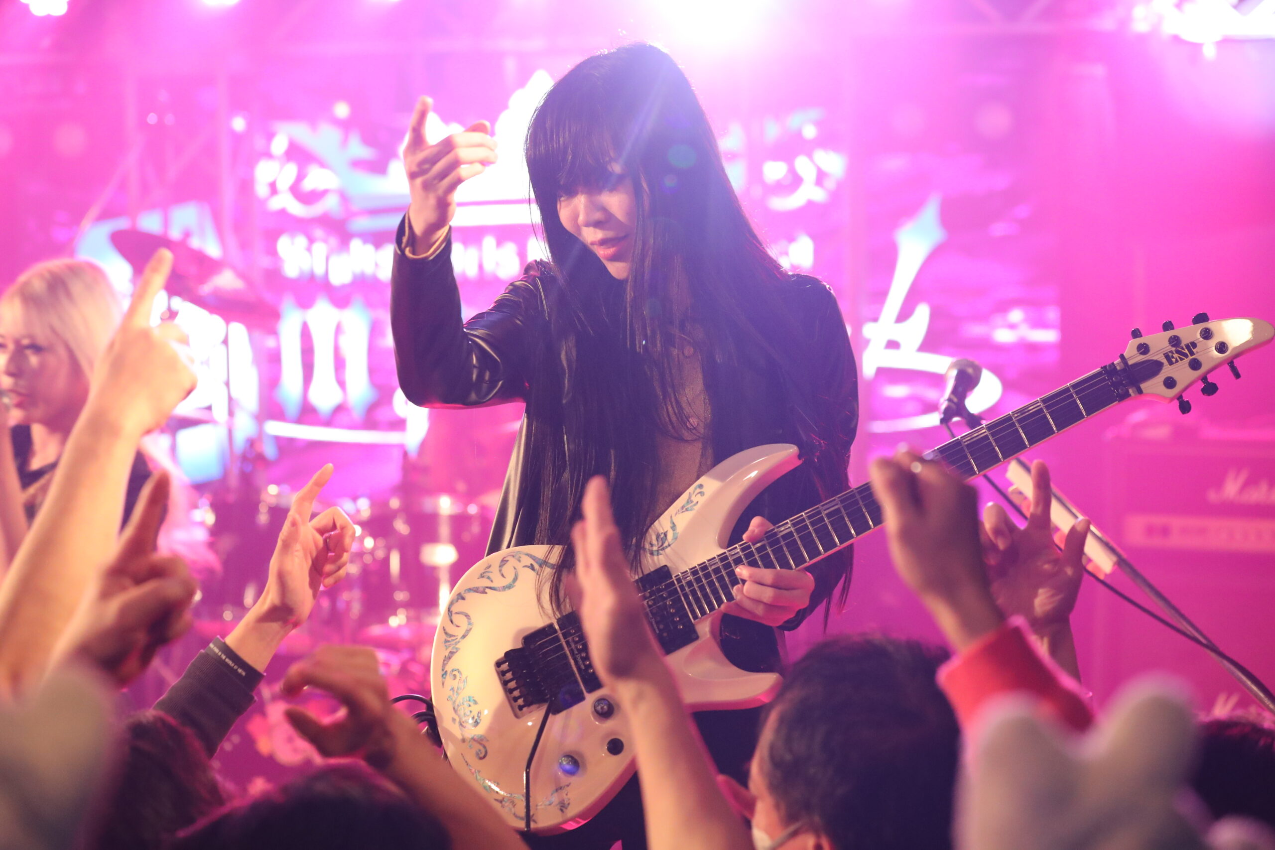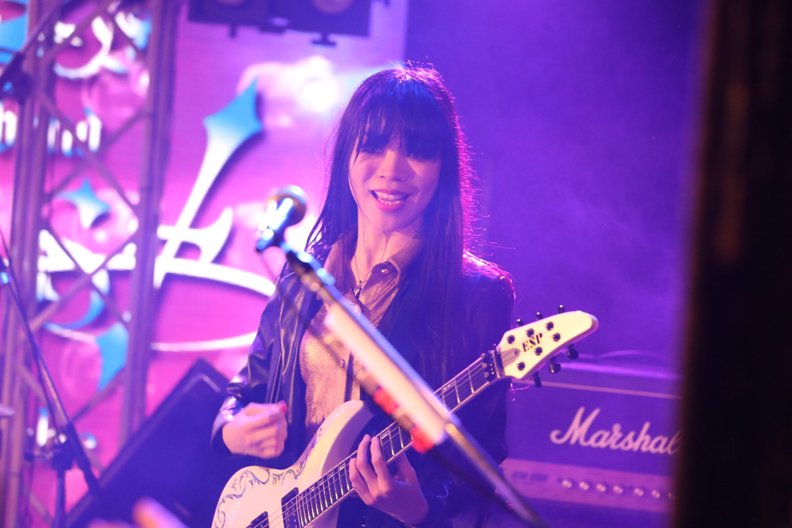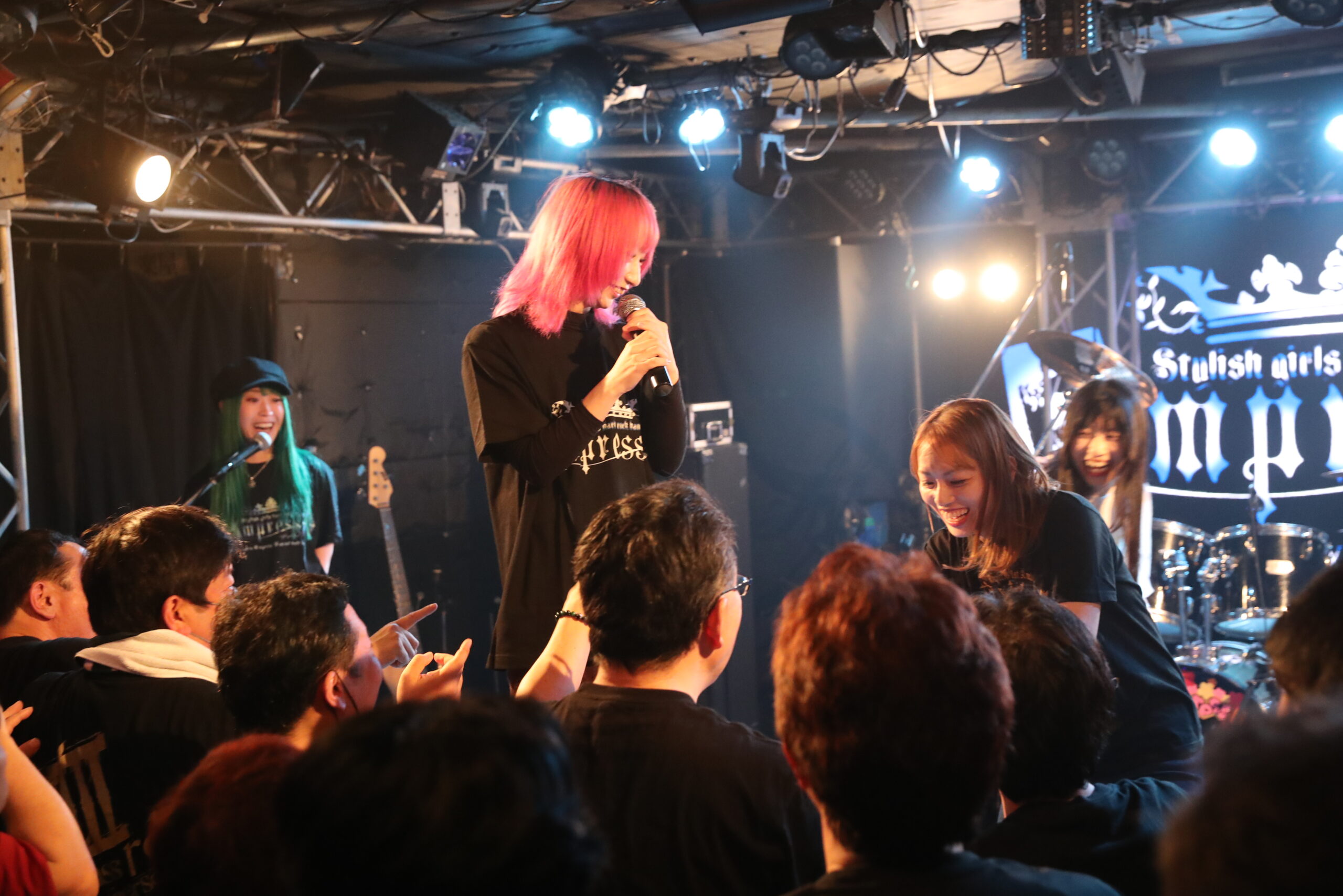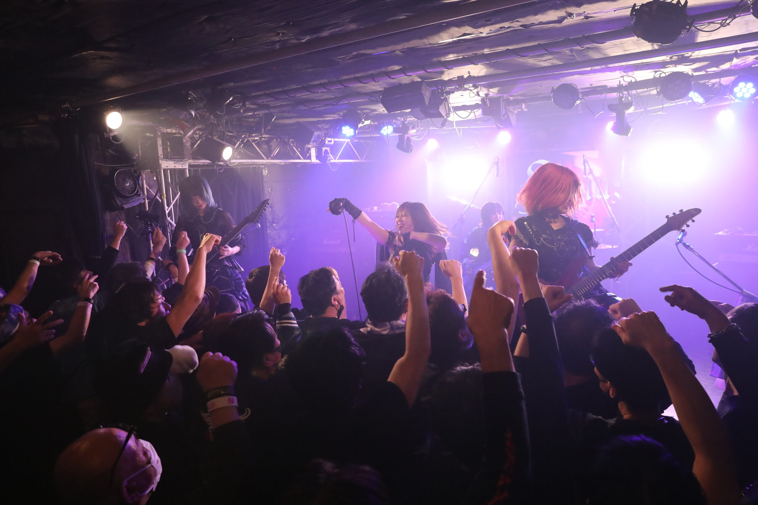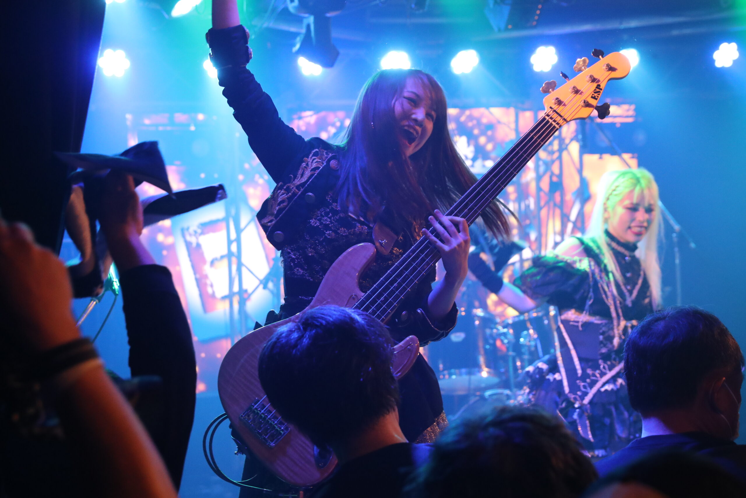 次のブロックで魅せたのが、いおり(Dr)とマリー(B)によるセッション演奏。マリーのスラップの演奏を軸に、そこへタイトでリズミカルないおりのドラム演奏が寄り添い、跳ねた強烈なメロ&リズムを打ち出す。場内中の人たちも、2人や、それぞれのソロ演奏に向け、熱い声を張り上げてエールを送り続ける。跳ねた演奏をかけあう2人の姿に触れ、胸が嬉しく騒ぎだす。「Oi!Oi!」と止むことなき叫び声が、観客たちの興奮の様を物語っていた。リズム隊の演奏へ、今度はみつき(G)も加わりだす。みつきのギターは、細かい旋律を次々と刻みながら観客たちの感情へさらに興奮というエナジーを注ぎ込んでいった。