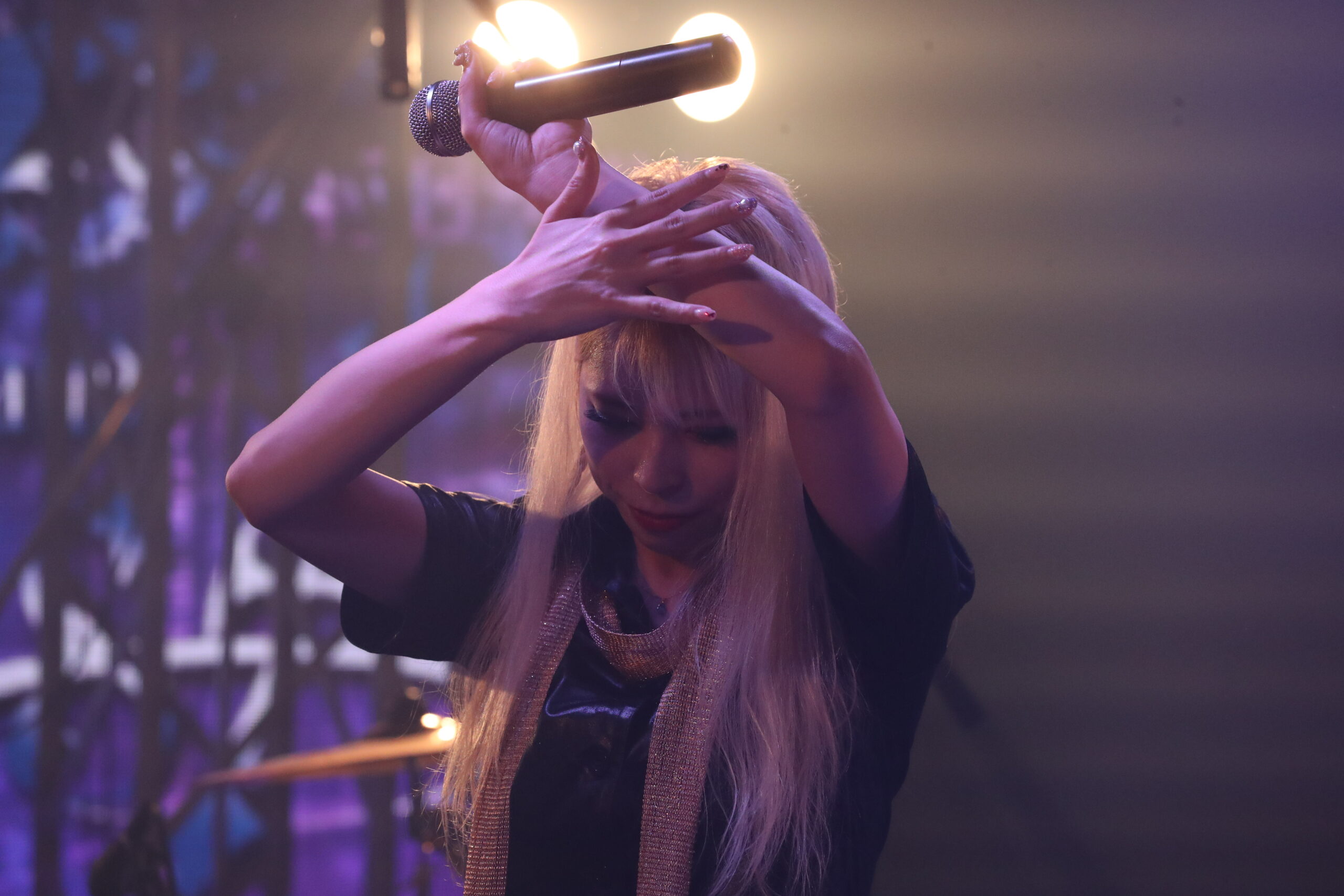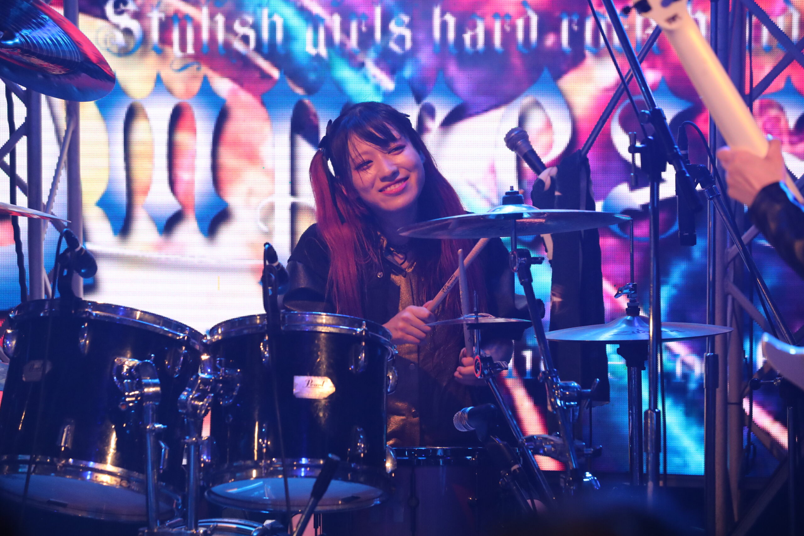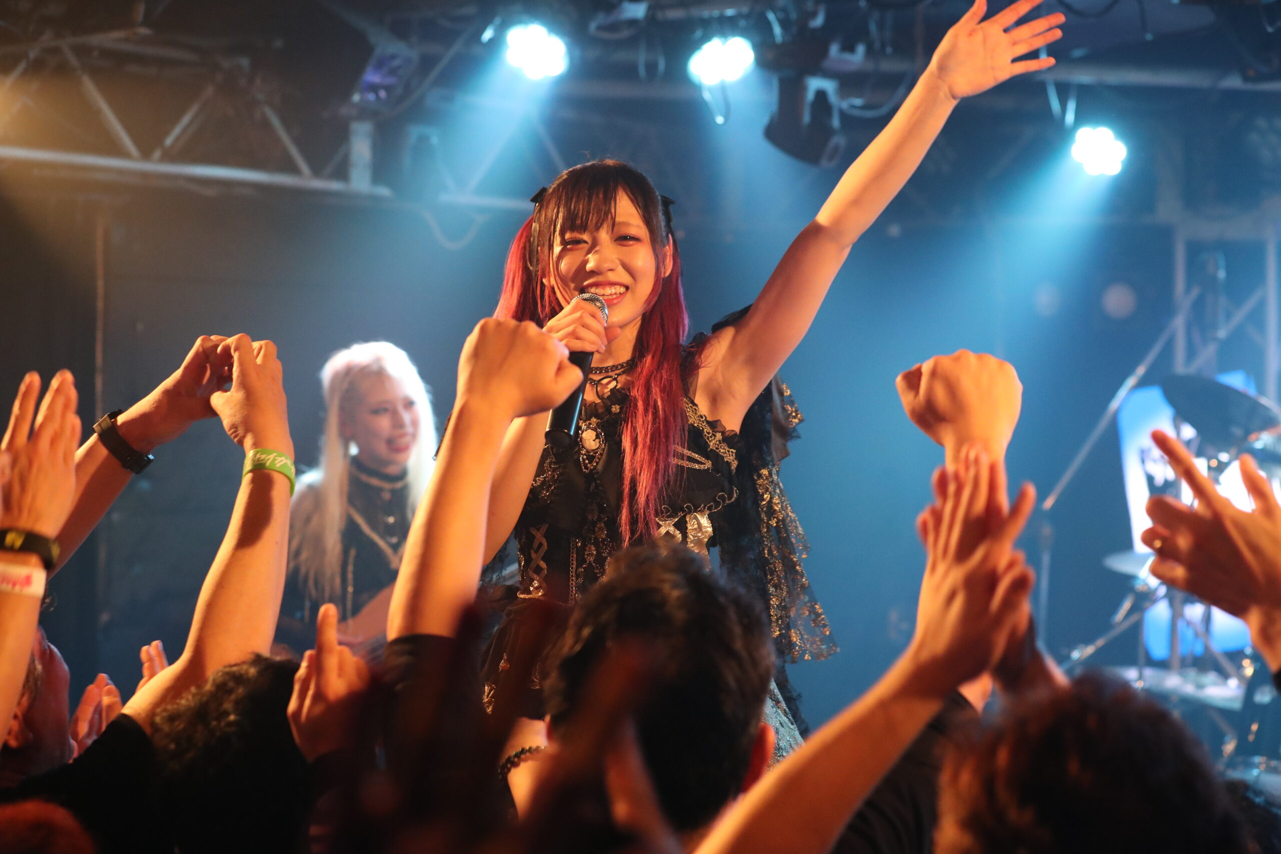 同期の音を背景に、演奏がスタート。それぞれのプレイの拙さはご愛嬌。むしろ必死に。でも、笑顔で演奏を楽しんでいた姿に触れ、フロア中からも4人に向けて熱いエールが飛び交う。ヴォーカルを担ったいおりは、振り上げた拳を観客たちと交わすなど本当に歌うことを楽しんでいた。むしろ、その姿へみんなが導かれるように、3人も、観客たちも演奏を楽しんでいた。