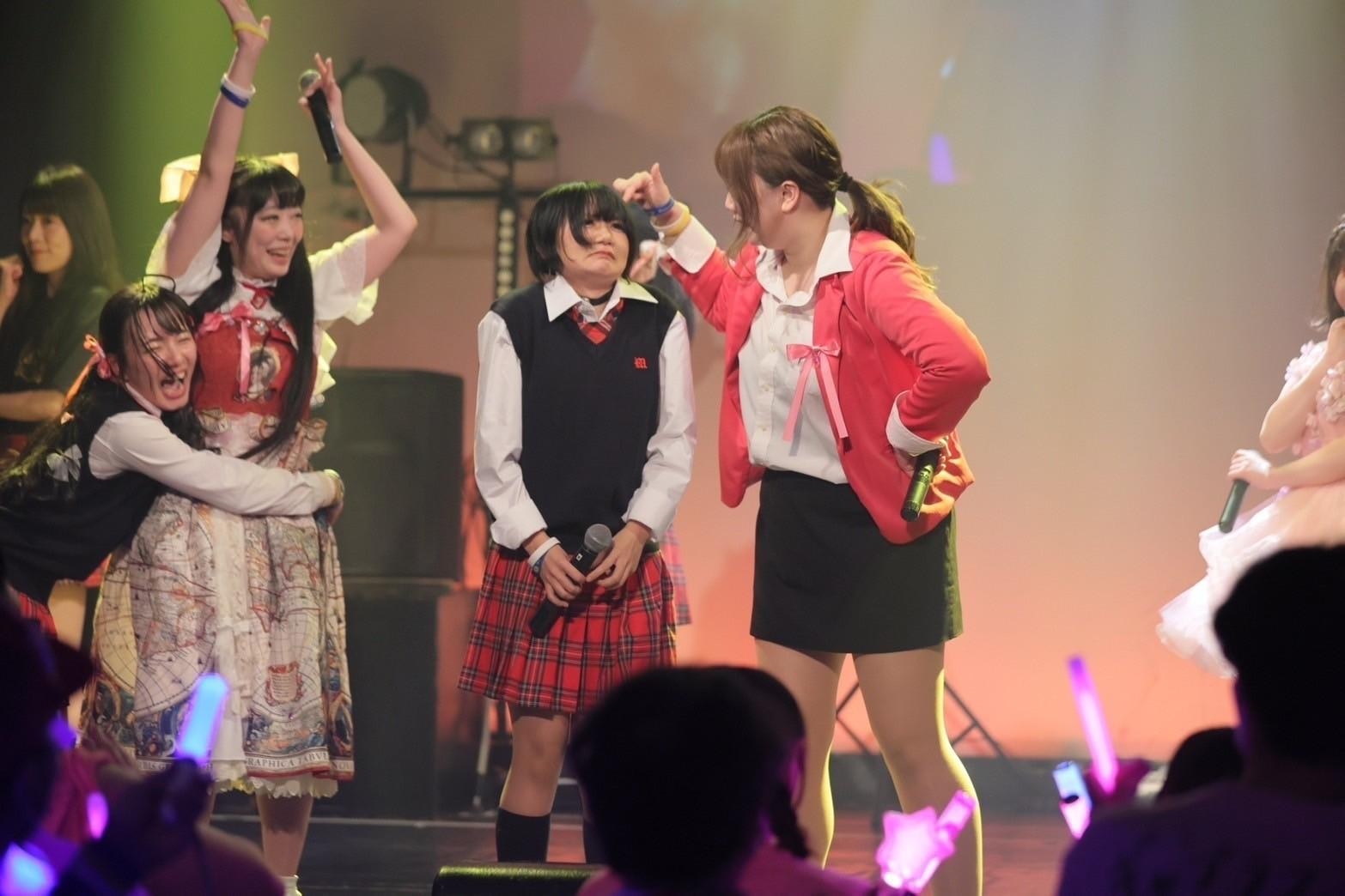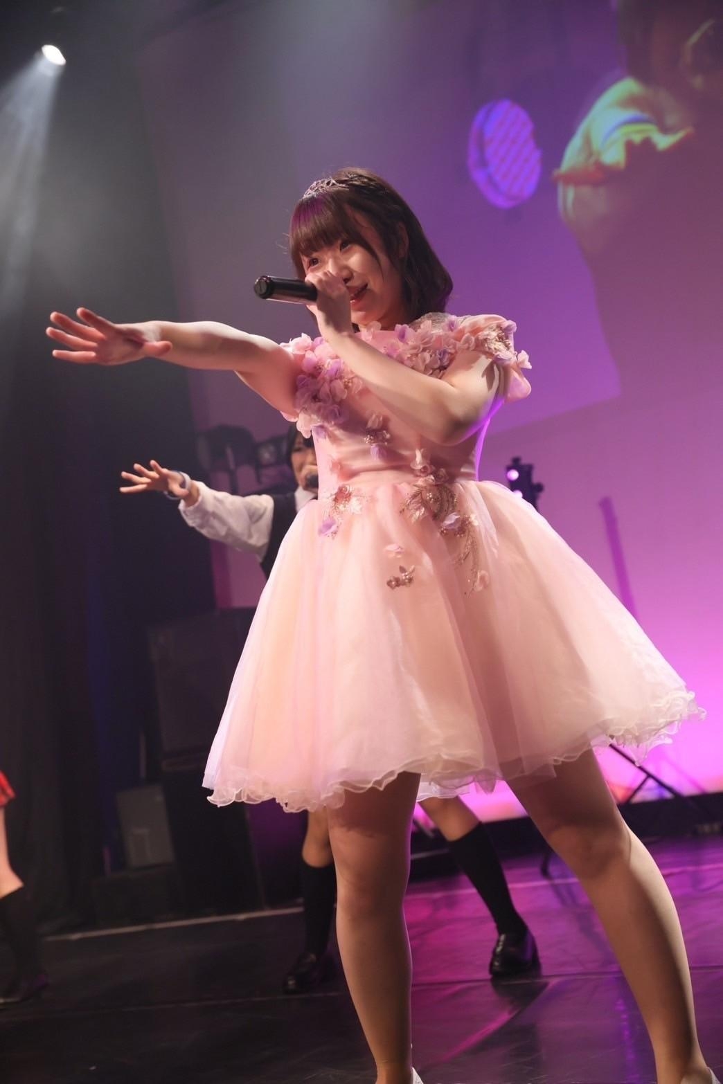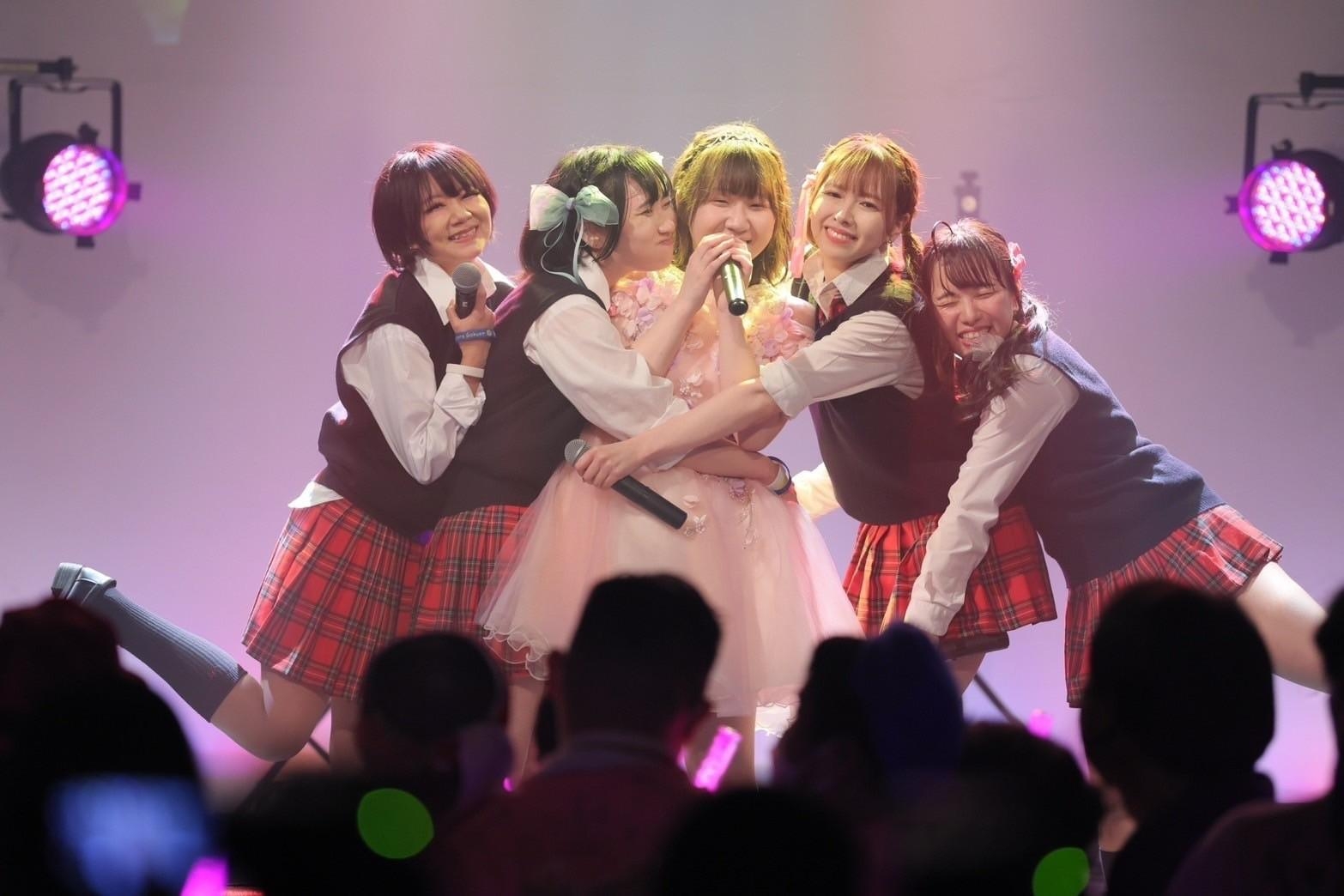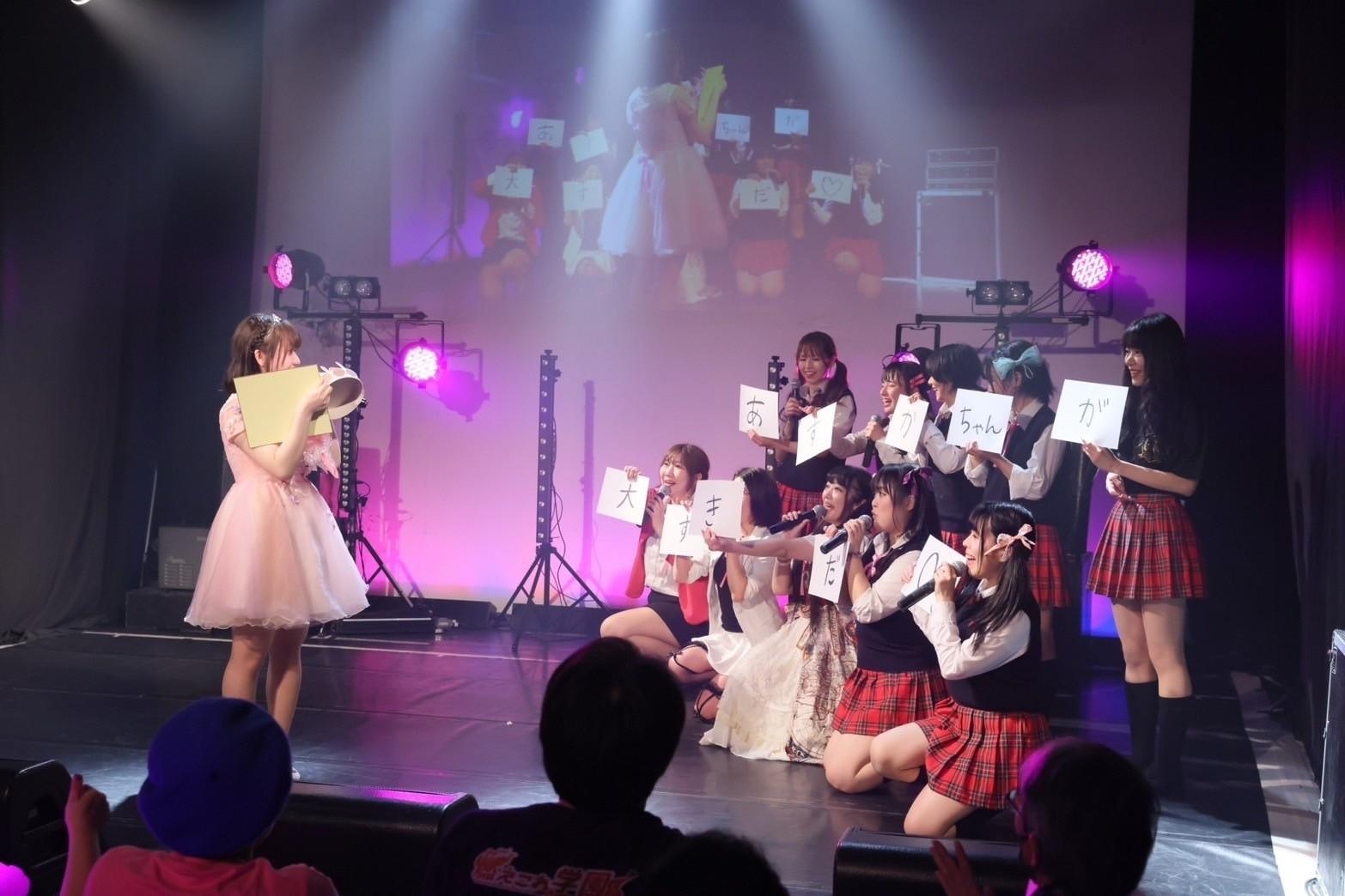 最後は、この日の主役の青山明日香の誕生日をみんなで祝福しようと、『お誕生日おめでとう』を歌唱。「明日香ちゃん、お誕生日おめでとう」の言葉を合図に、歌がスタート。曲中には、熊野はるからの「大好きだよ」の祝福の言葉が飛び出せば、いつもは後方のポジションにいる青山明日香だが、後半にはセンターへ。他のメンバーらから祝福を受けるように囲まれ、みんなと一緒に幸せを分かちあっていた。その姿に触れていたら、つい、嬉し涙を瞼に浮かべていた。歌い終わったときの、青山明日香の眩しい笑顔も、キラキラと輝いていた。