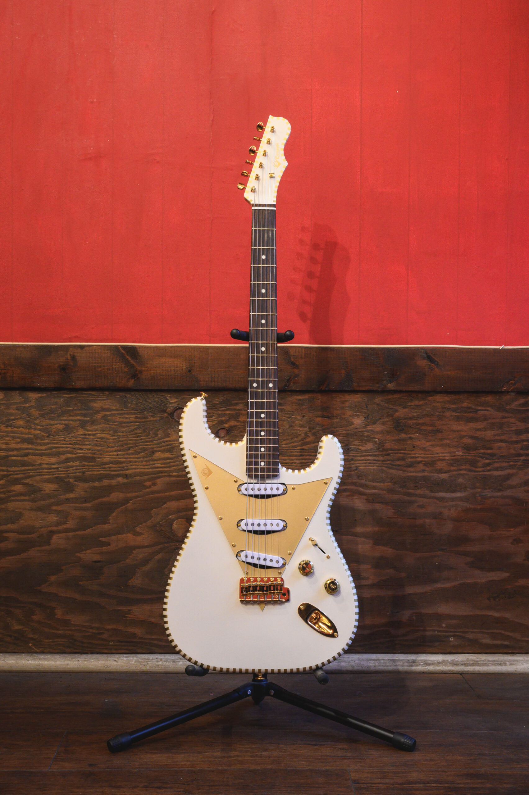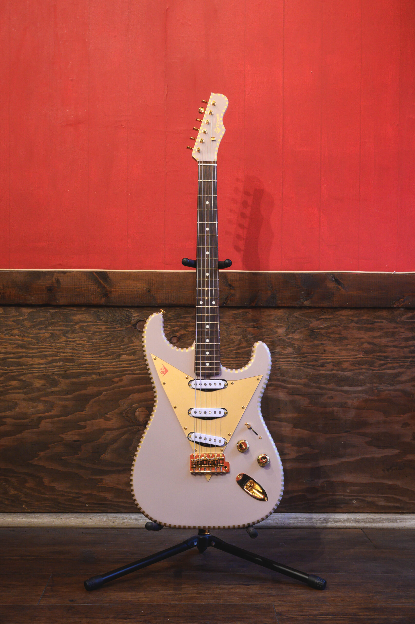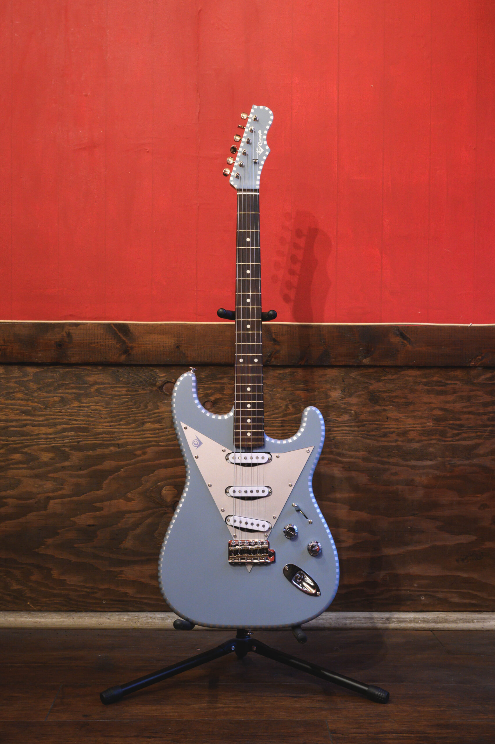 昨年、福井県漆塗業者とのすり漆コラボギターとギターネックの端材を使ったお箸セットを制作するなど斬新な企画で注目を浴びたCGKが、STタイプを作るのは初めての試み。今までのテレタイプが好評を得ている中、STタイプを作って欲しいとのリクエストが多く寄せられていたが、今回ついに実現した。特徴であるデザインはチェッカードステッチとVピックガードで、どこかレトロな雰囲気を醸し出している。そこにマウントされたのがRise のハンドメイドピックアップRise 54 +。こちらもまたレトロサウンドを基調に現代風にアレンジされている。