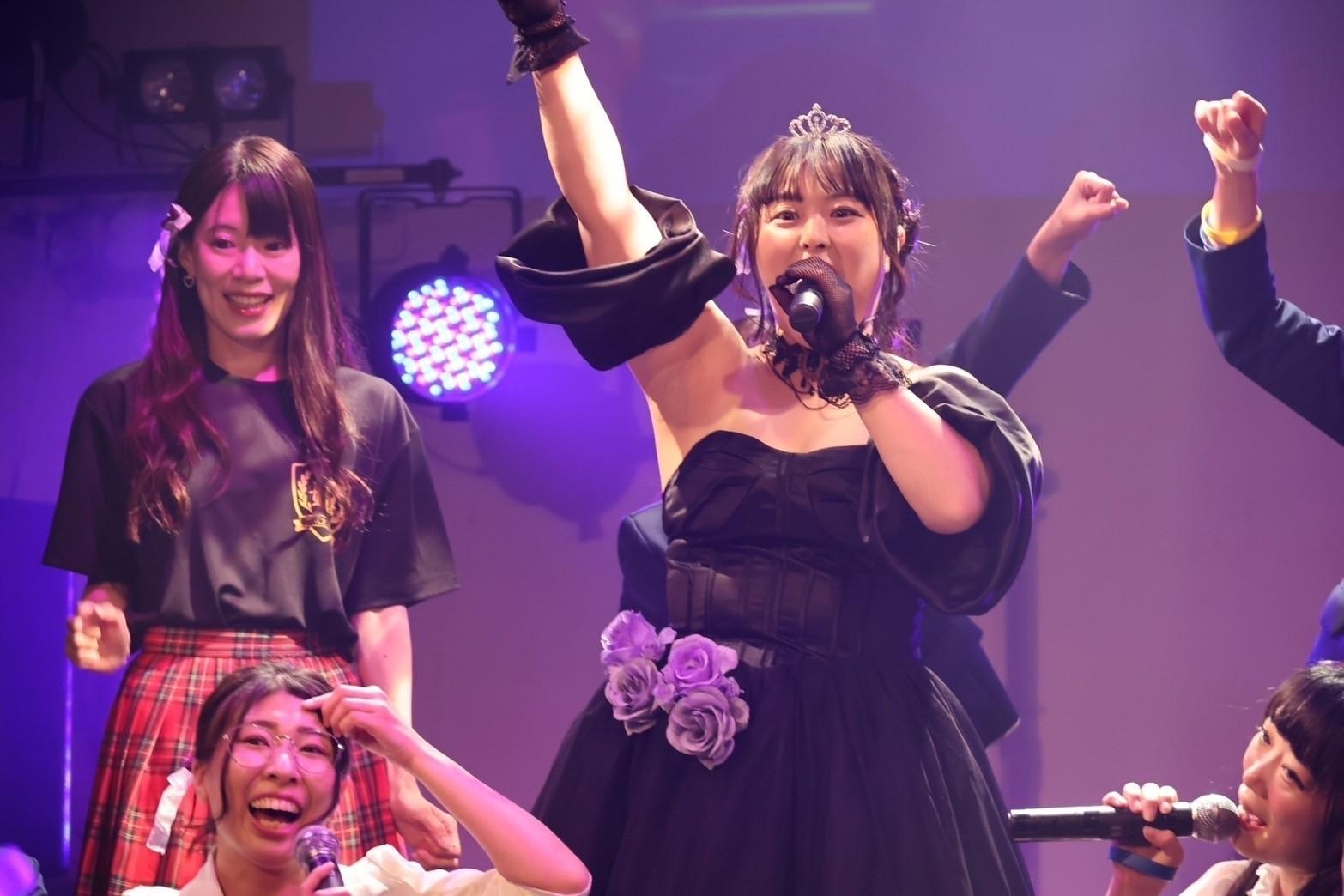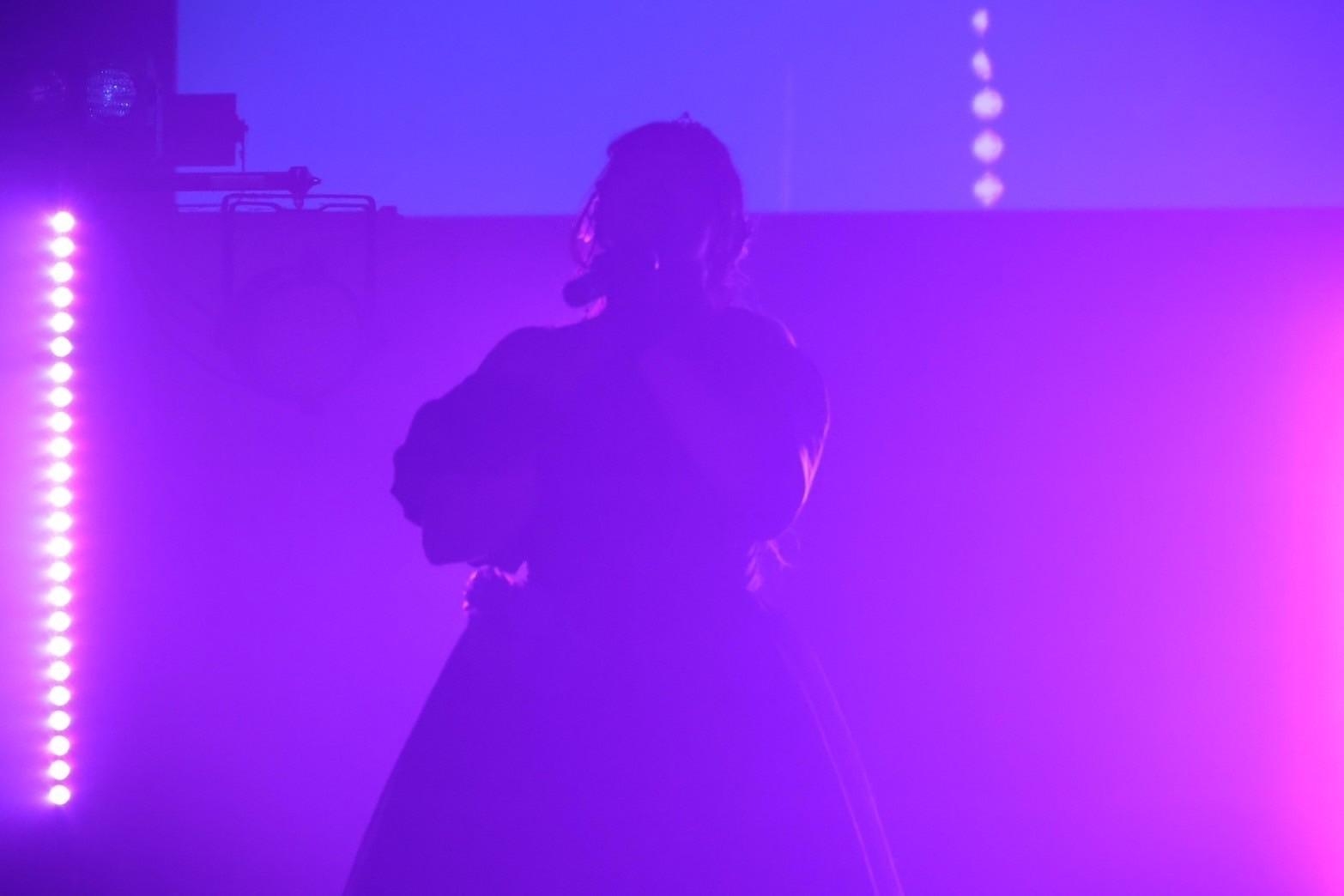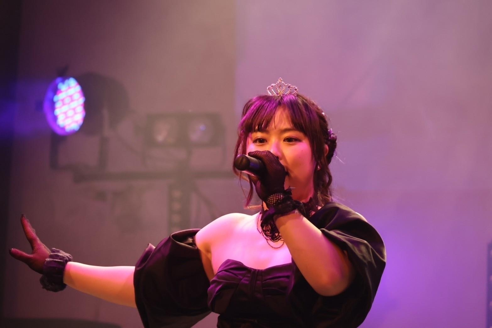 ここからは、蒼音舞の生誕祭コーナーへ。紫の光に包まれた中へ、黒いドレス姿に着替えた蒼音舞が登場。彼女は『Real Cry』をアカペラで歌いだした。パワフルさの中にも温かさを覚える歌声だ。言葉のひと言ひと言から、彼女の気持ちの揺れ動く様か伝わる。パワフルだけではない、とても感情表現豊かな歌い手であることを、蒼音舞はソロ曲の『Real Cry』を通して伝えてきた。落ちサビで、紫のペンライトの輝きが蒼音舞に向かって捧げられていた様も、とても綺麗だった。