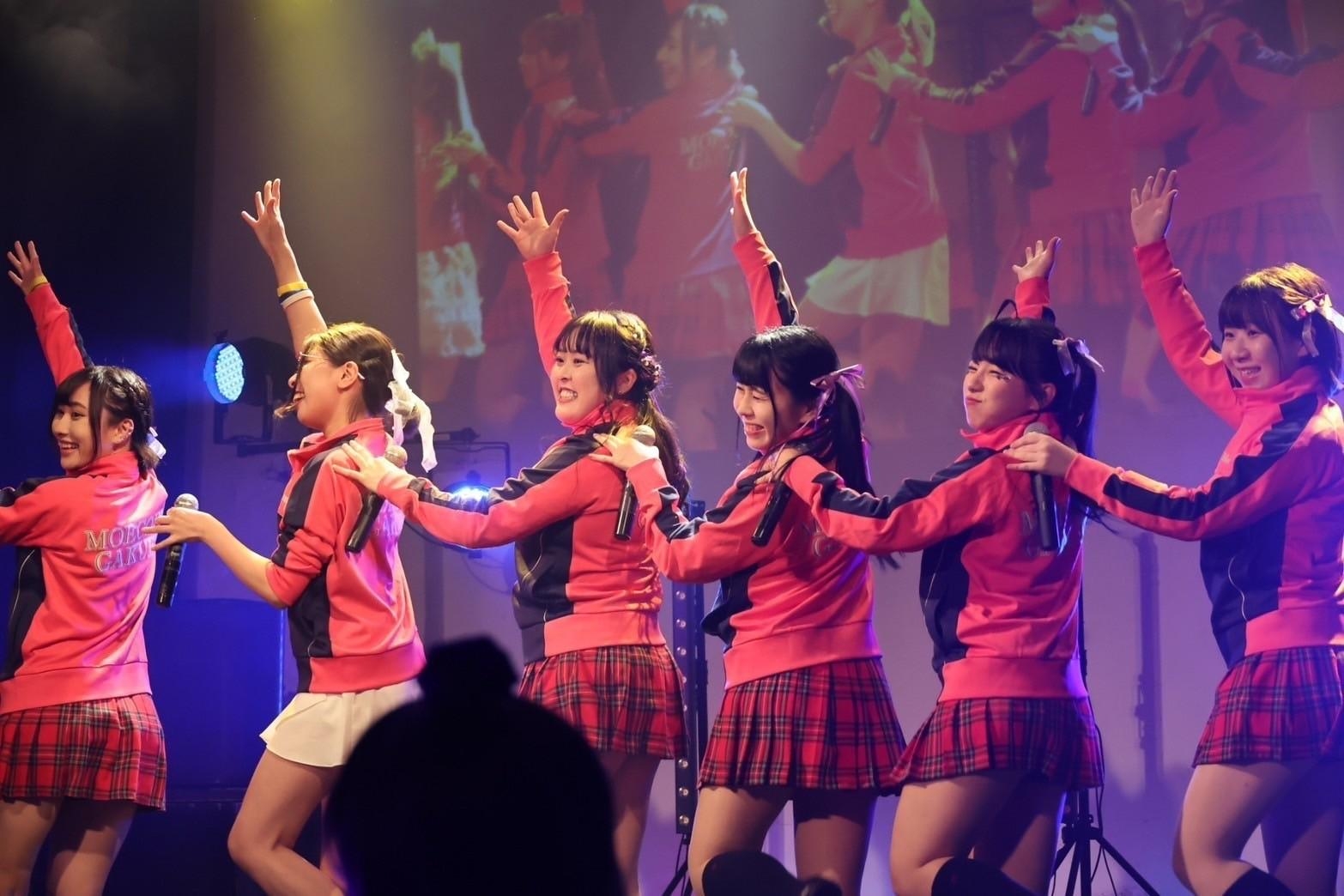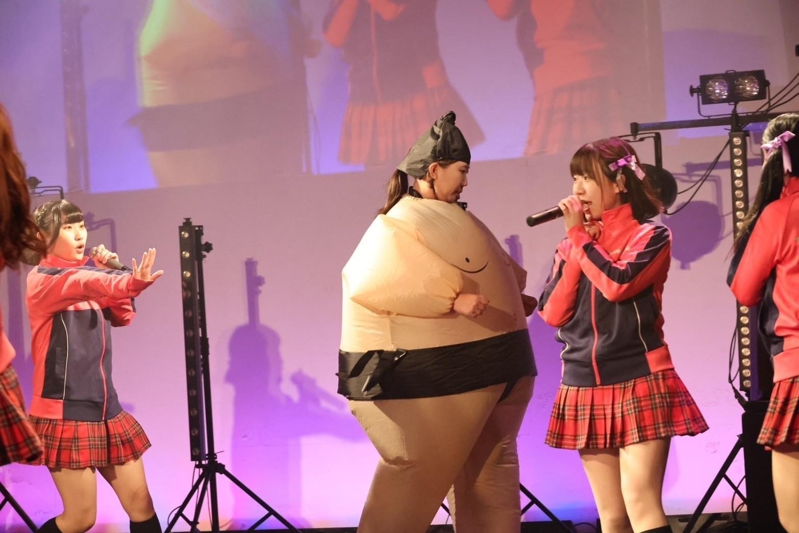 ライブは、燃えこれジャージを着たメンバーたちが『すき!すき!好き!!』を歌ってスタート。 舞台の上では、いつものように笑顔を交わし、わちゃわちゃとはしゃぎながら歌い踊るメンバーたちがいた。でも、気になるのがジャージ姿でのパフォーマンス。その理由は、続いて歌った『夏恋♡LOVE』で、判明。メンバーらが舞台の上で、いつも以上に運動量多く舞台の上を走りまわり、振りを大きくパフォーマンス。その姿を見て、納得。この日は、1曲1曲の運動量を高め、有酸素運動にも繋がるライブを見せていた。途中、熊野はるが力士の格好をして登場するなど、メンバーたちも大忙しだ。
