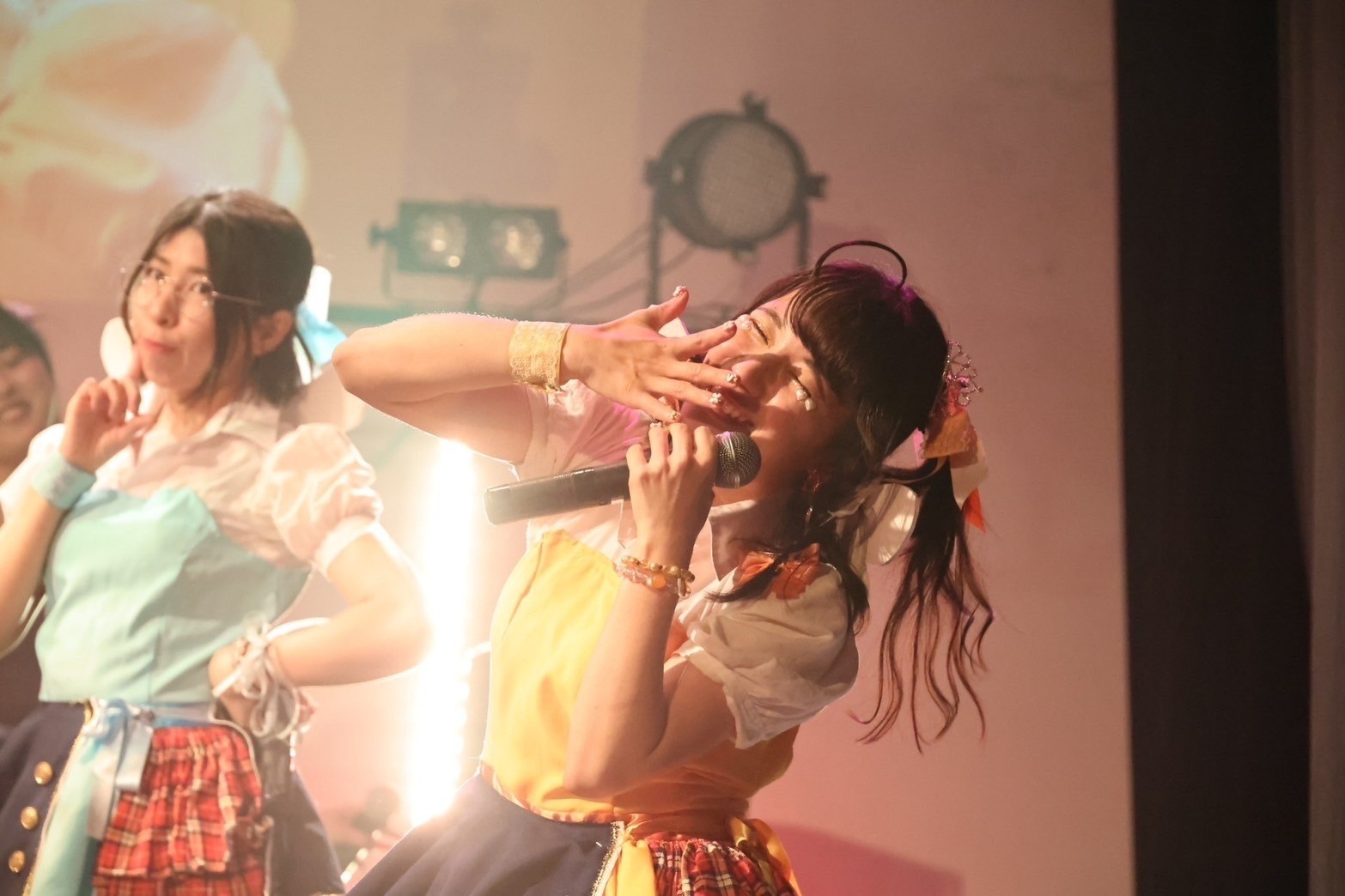 仲川つむぎの凛々しい歌声から幕開けた『again』では、強い意志を抱いた歌声を稲森のあ、熊野はると繋いでゆく。メンバーらの情熱的な姿に気持ちを強く揺さぶられる。落ちサビを熱唱した稲森のあの姿も印象的だった。稲森のあの歌いだしで始まった『オルゴール』では、メンバーたちが言葉のひと言ひと言へ熱を込め、胸の内に抱いた想いを届けるように歌っていた。