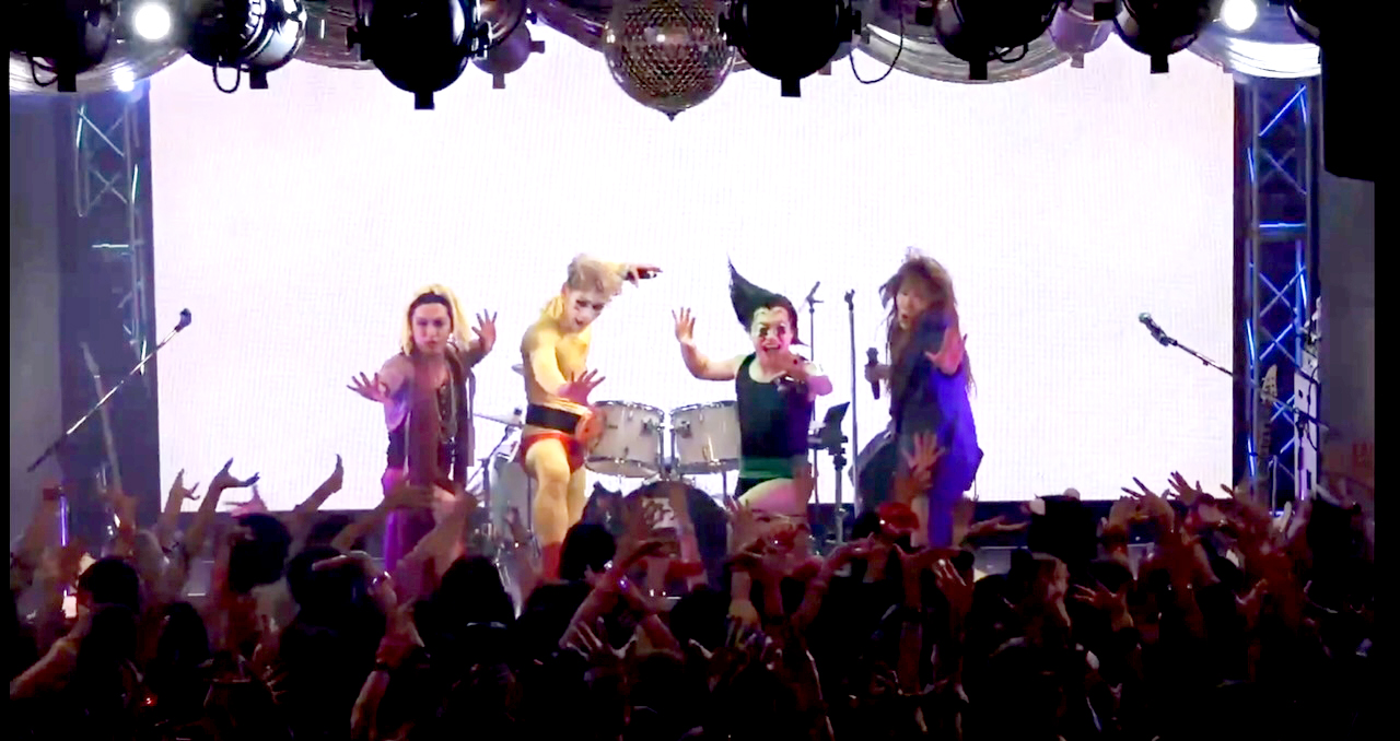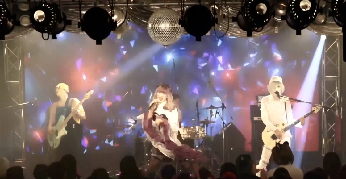 その楽しさへ勢いを付けるように、飛びだしたのが『綺麗になりたくて』。4人の歌や煽り声に合わせ、フロア中から「Oi!Oi!」と熱い声が張り上がる。メンバーらと観客たちが共に声を張り上げて盛りあがる様を味わうたびに、ドキドキする。今宵はHalloween Partyということで、先にも触れたように、みんなしっかり奇抜な??コスプレ姿をしていたのも嬉しい。さすが、この場の楽しみ方をわかっていらっしゃる。