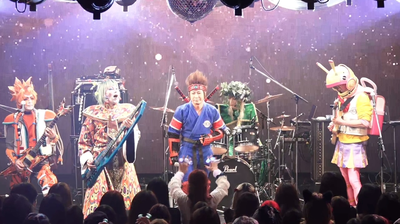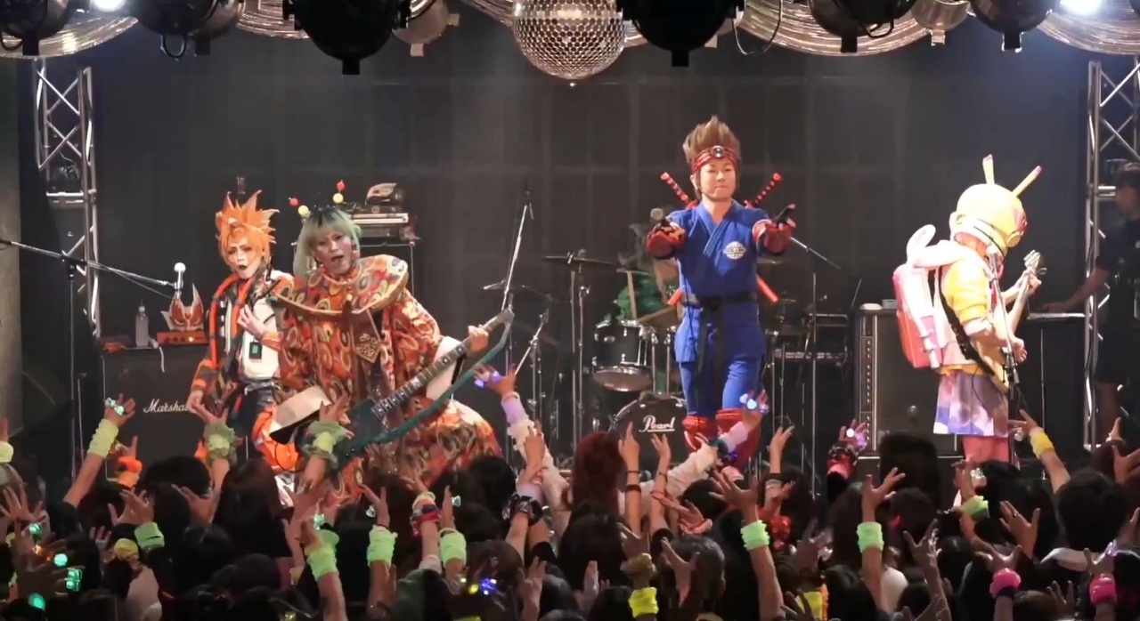 次のブロックからは、メンバーみんな楽器を置いてステージの前へ横一列に。『ファイティング!』では、4人がDAISHIの歌に合わせ、手にしたサイリウムを振りながらダンシング!!気持ちを熱く沸き立て、興奮や高揚を呼び起こす歌に乗せ、フロア中の人たちが声を上げてはしゃげば、4人のモンスターたちも、ペンライトを使ってヲタ芸や、みんなで振りを合わせて踊り続ける。ときにコンビネーションプレイも見せながら、モンスターたちもこの宴を楽しんでいた。