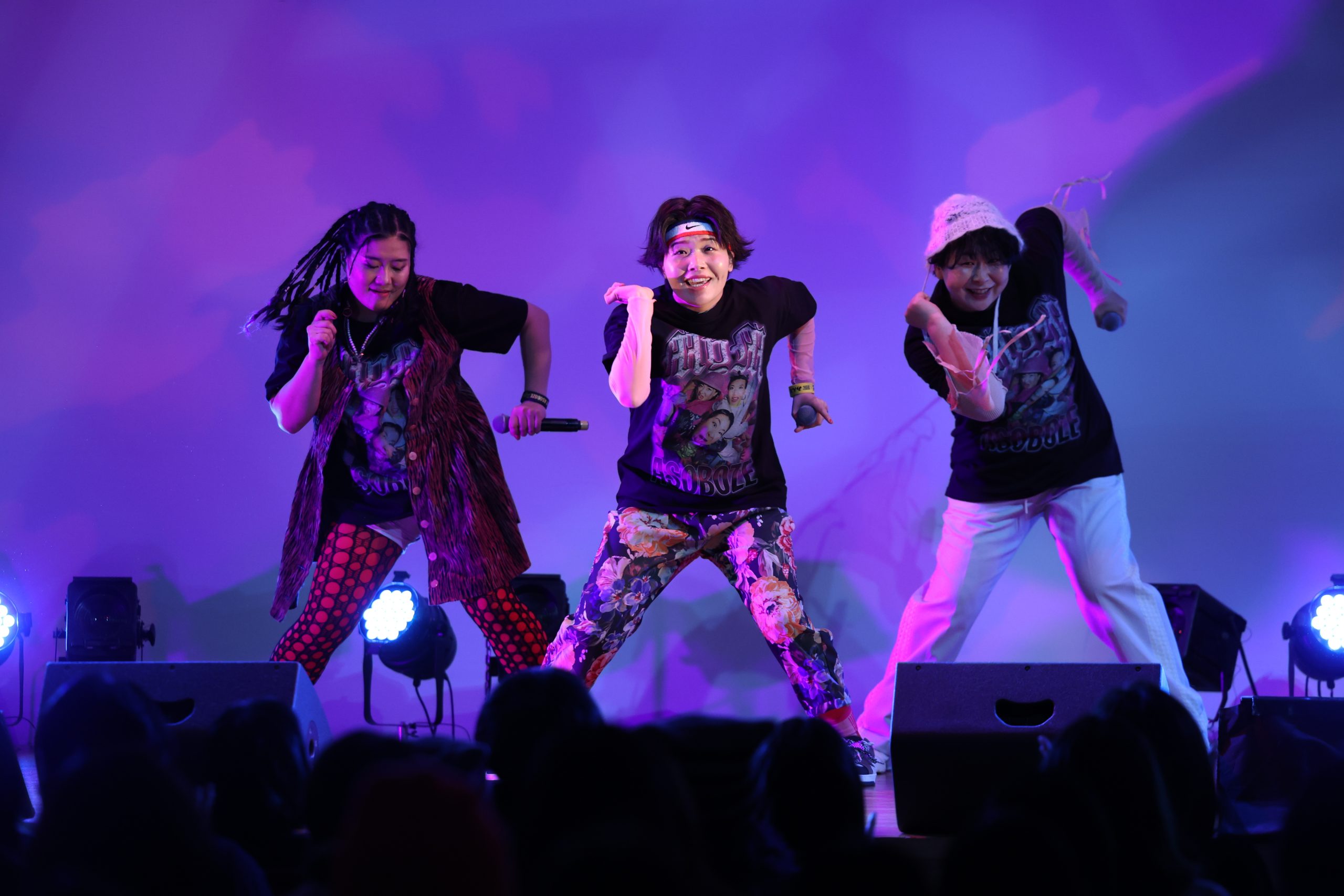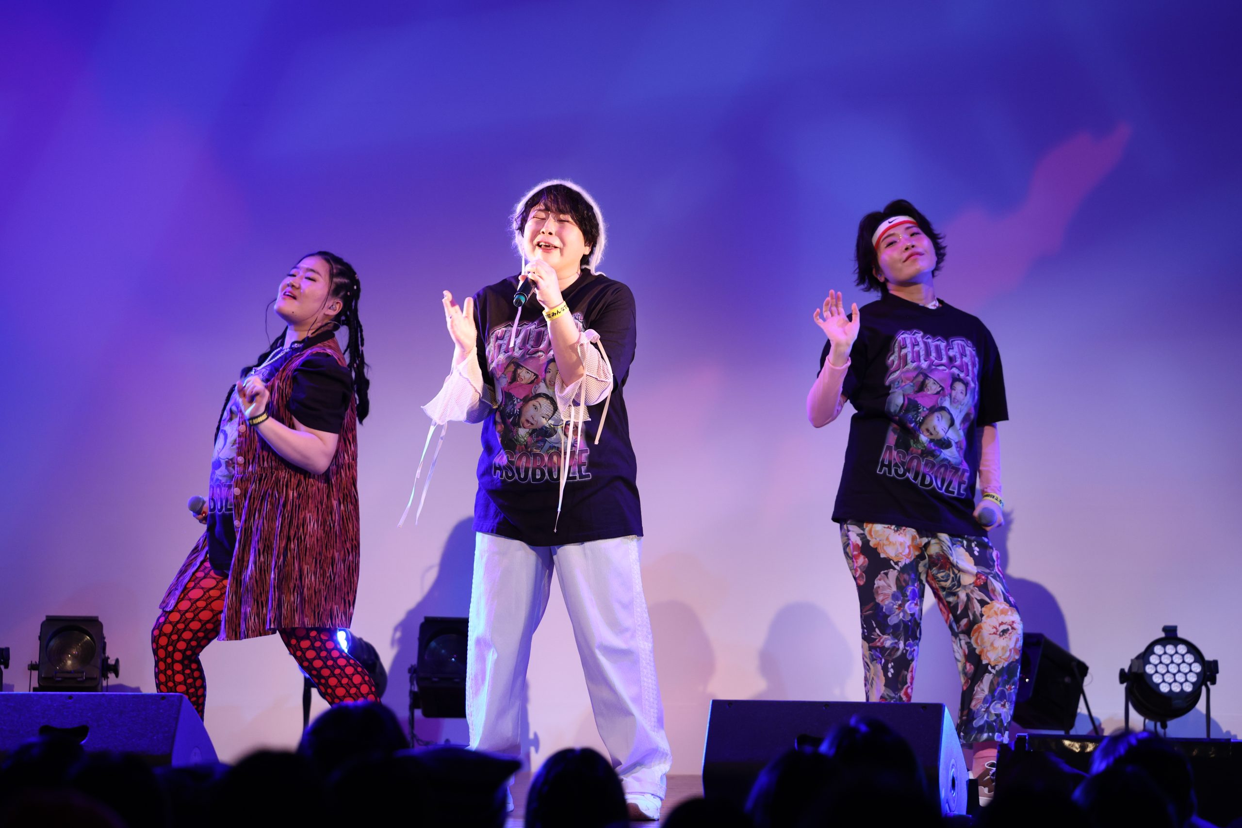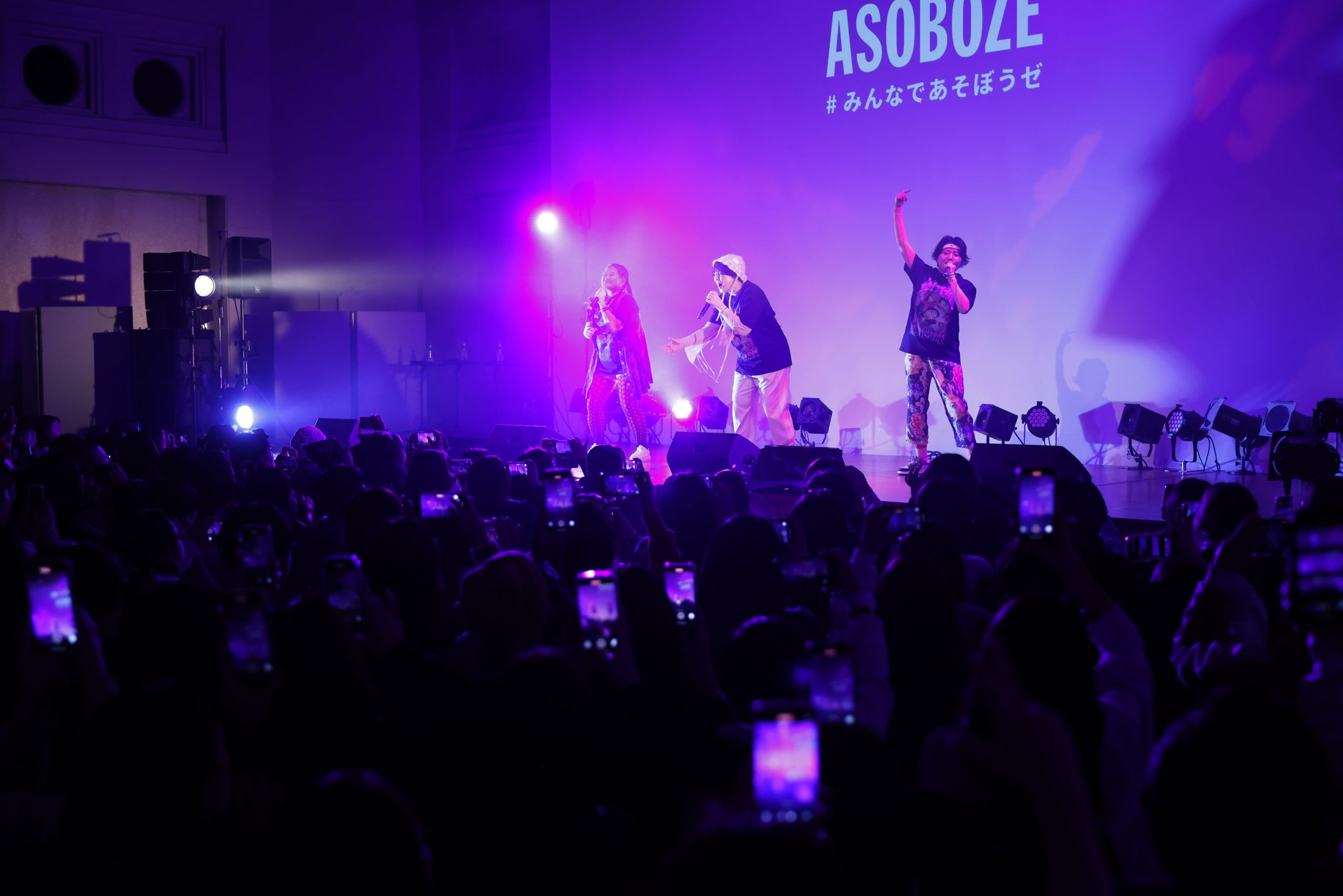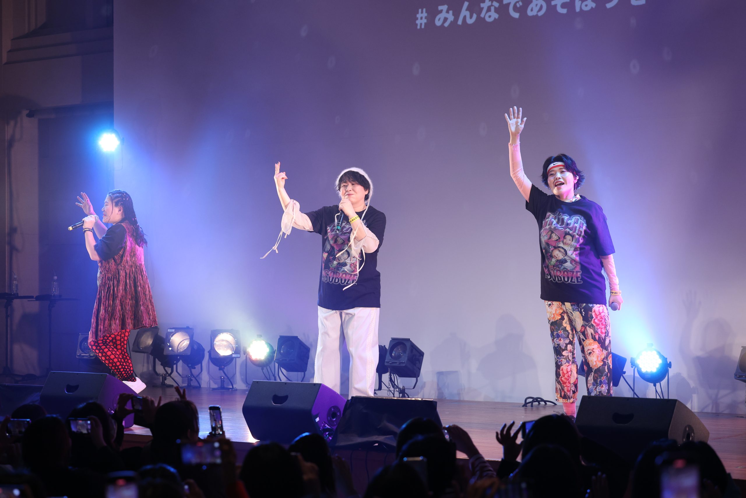 2公演完売している満員の観客たちで埋め尽くされた、場内。イベントは、デビュー曲『ASOBOZE』を歌い、スタート。彼女たちが「ASOBOZE ASOBOZE」とお馴染みのラップを繰り出すのと同時に、満員の観客たちが騒ぎだした。軽やかにライムを繰り出すメンバーらに向け、場内中から熱い声が上がる。サビでは、3人と一緒に「ASOBOZE」と声を上げる人たちも。彼女たちの誘いに乗って、一緒に遊ばなきゃもったいない。